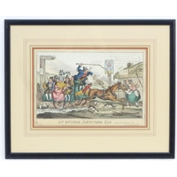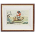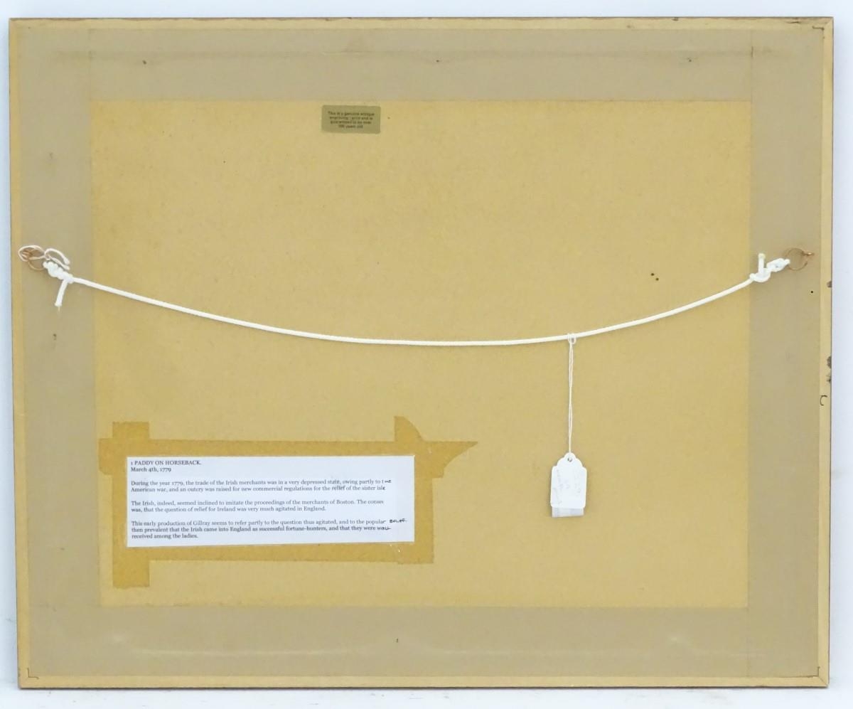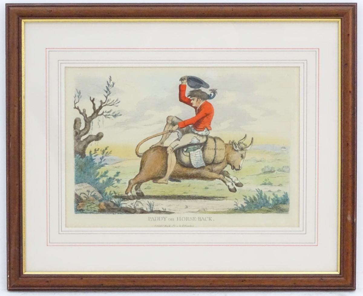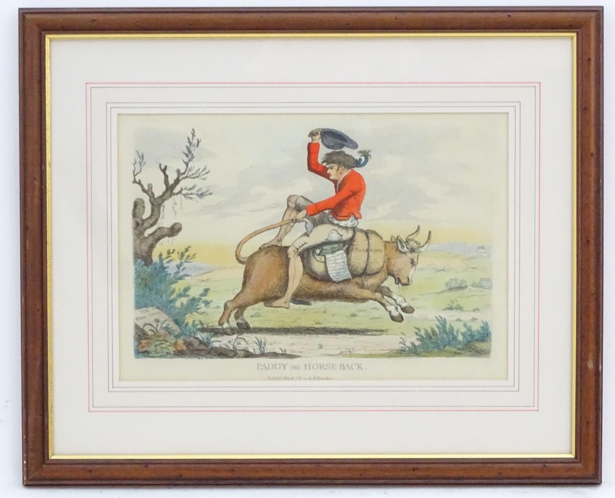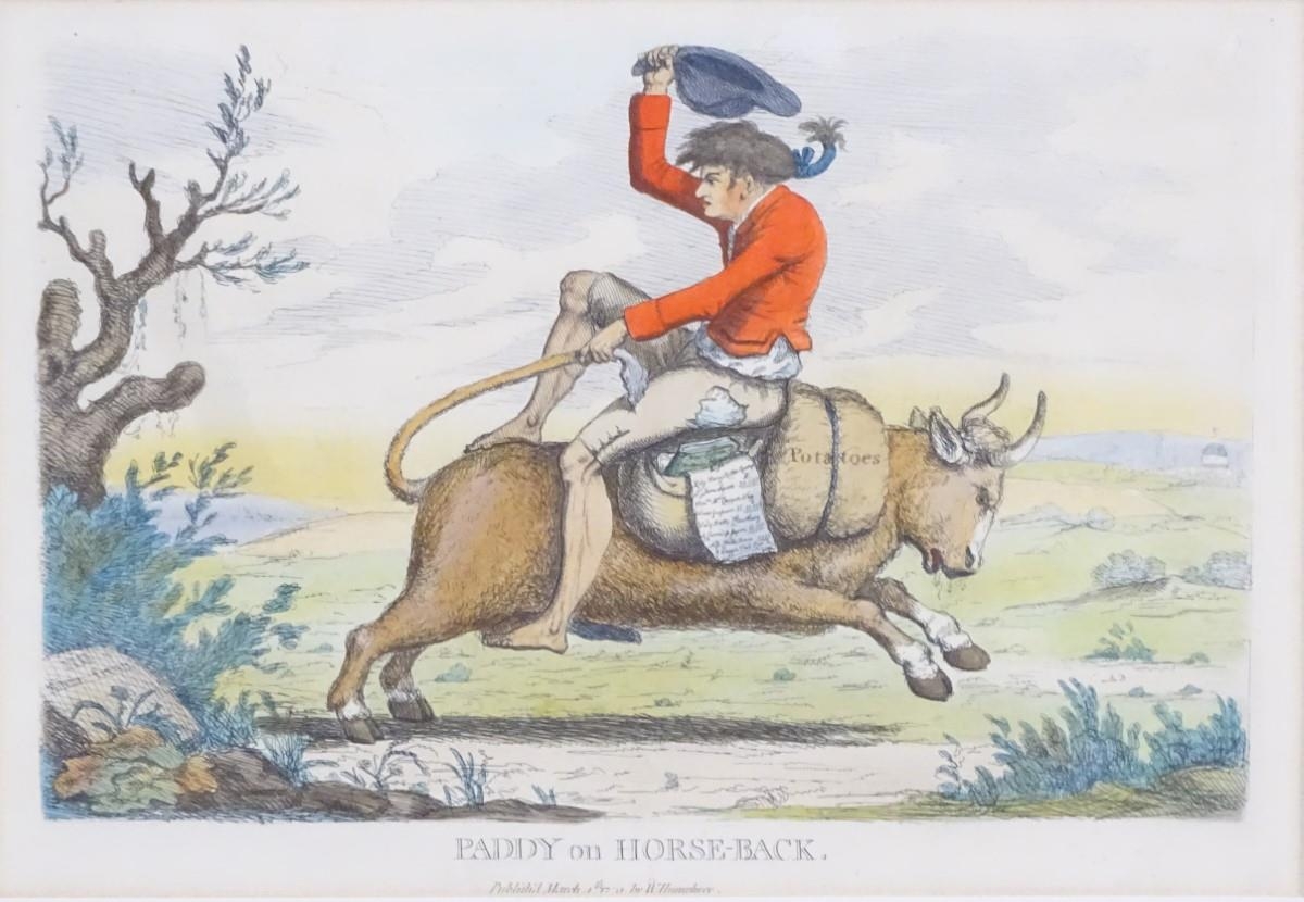 After James Gillray (1756-1815), Hand coloured etching, Paddy on Horseback, An Irishman seated on a bull in a landscape, Titled under. Published by H. Humphrey, March 1779. Approx. 10'' x 14 1/2''