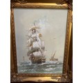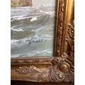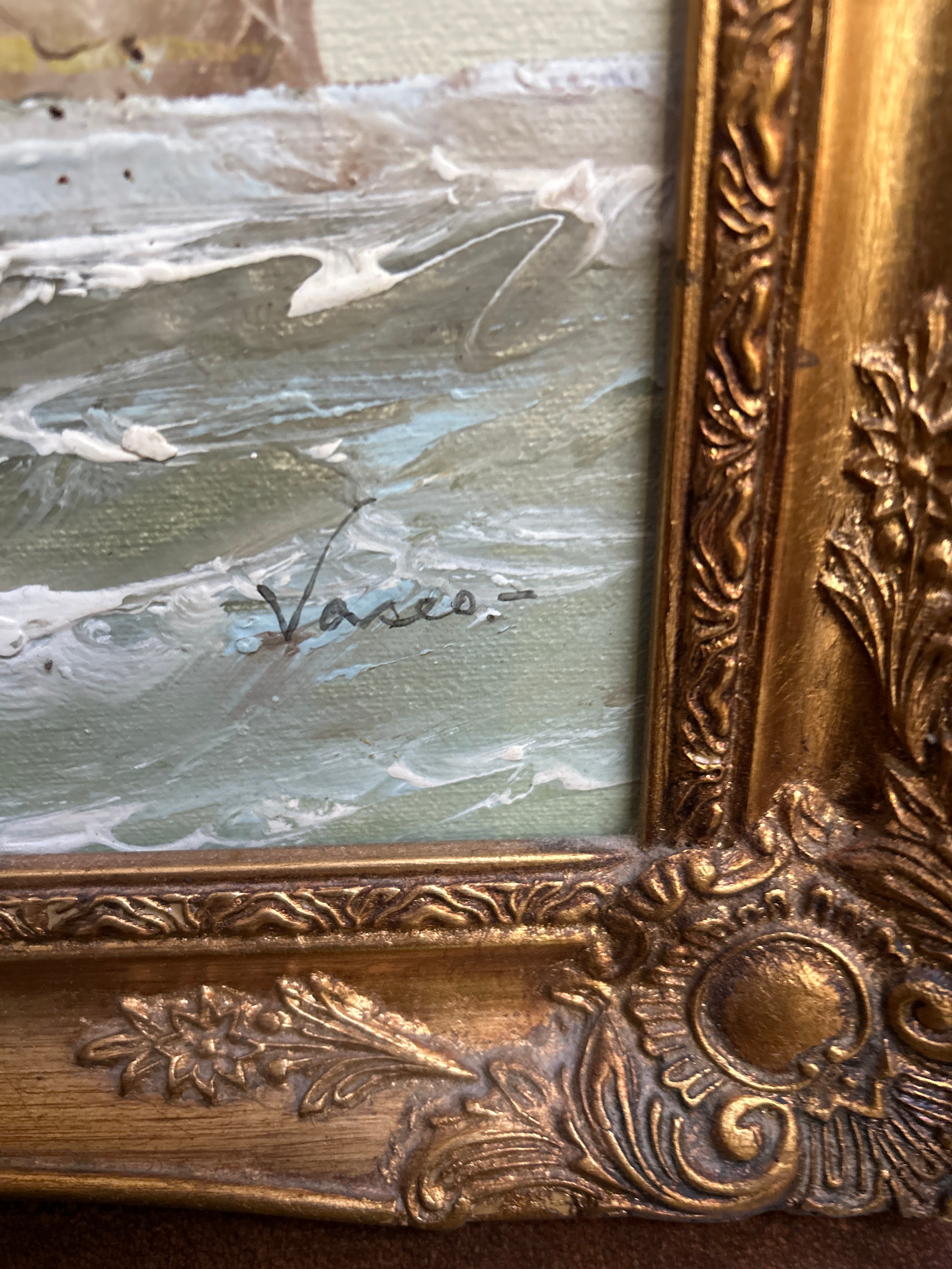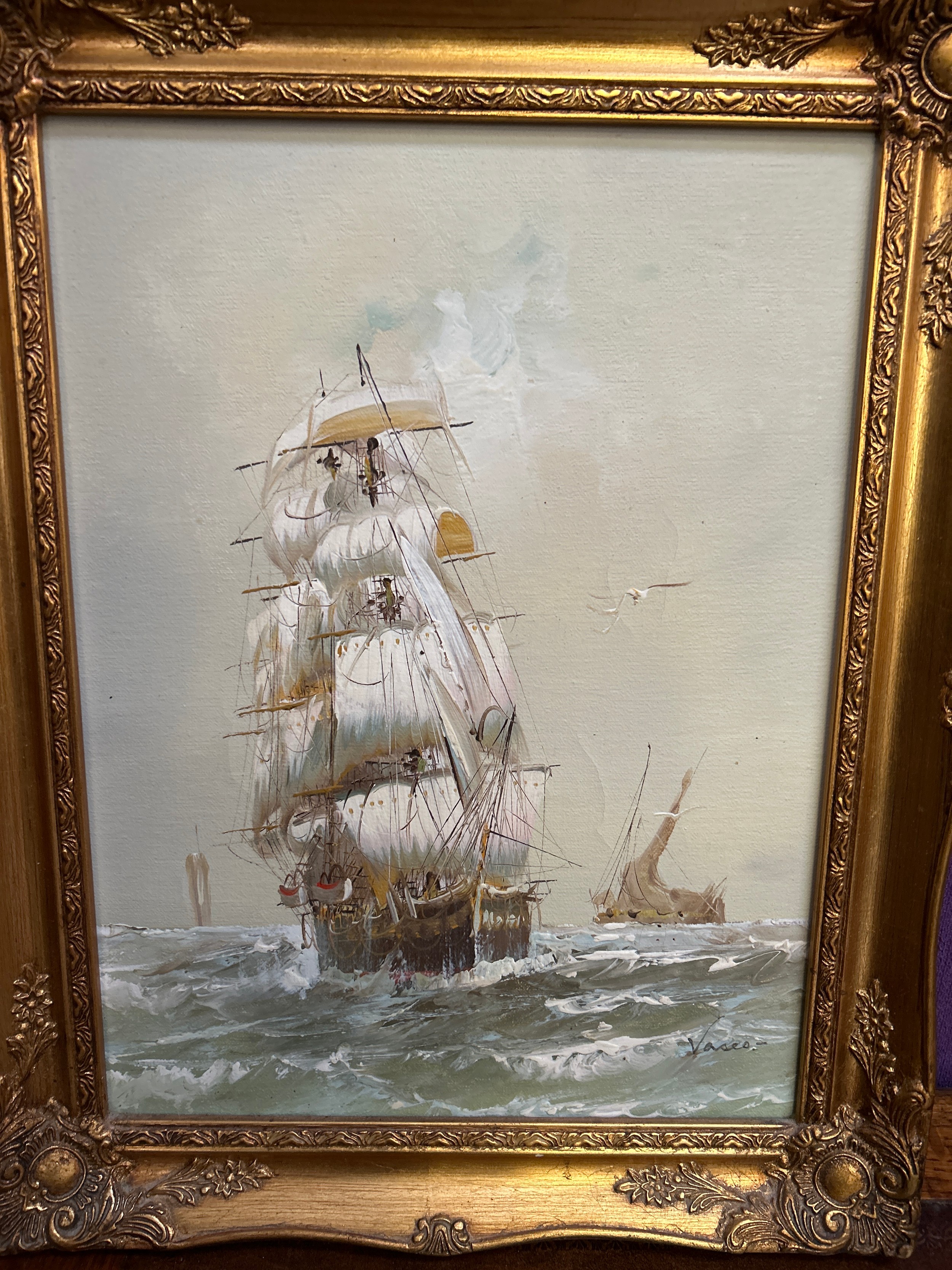 Late 20th Century oil painting on canvas of a ship at sea, signed by the artist “Vases”. 48cm x 40cm