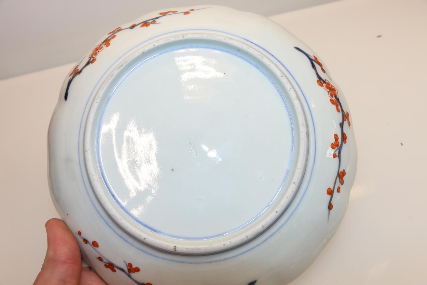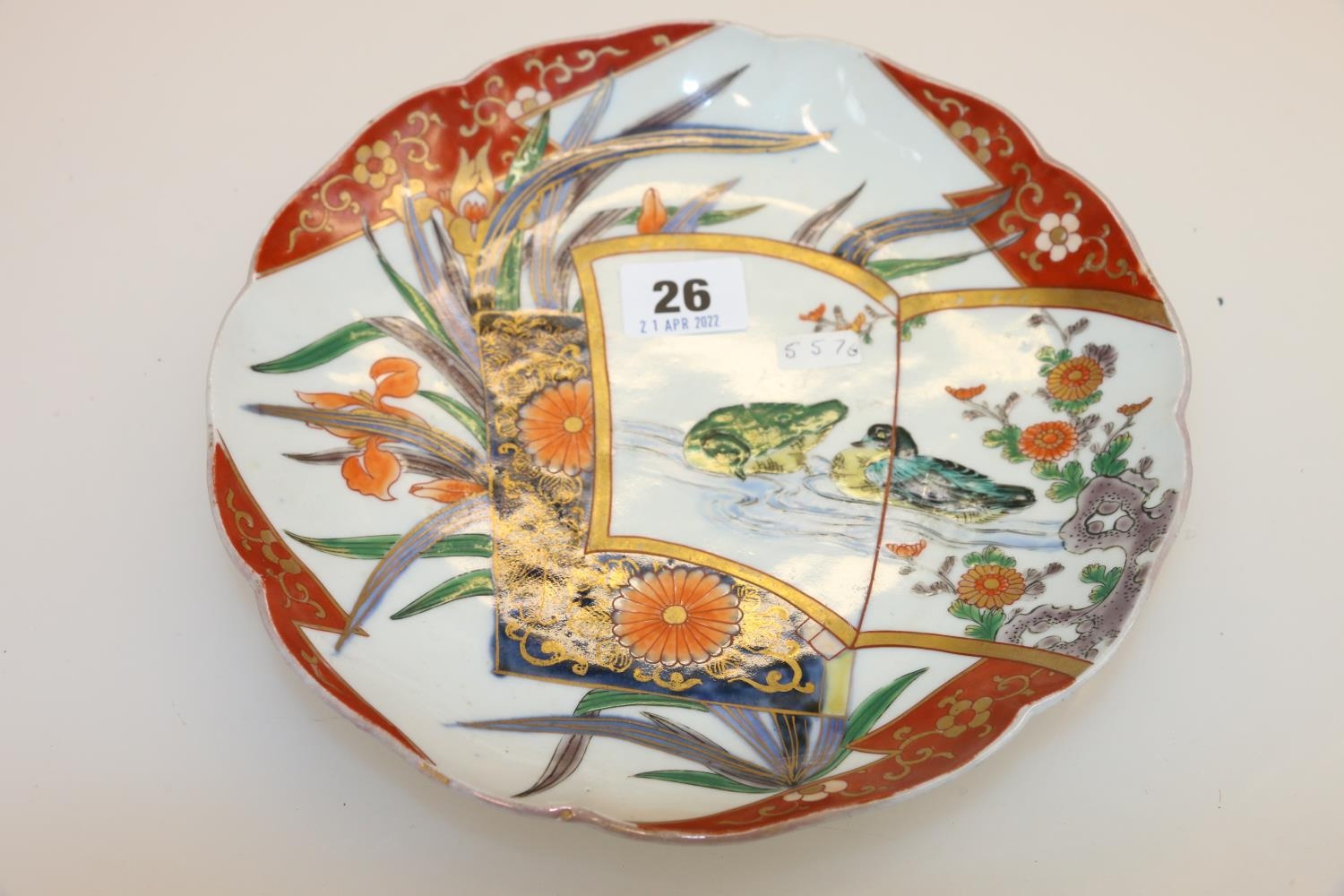 Oriental dish decorated with ducks and flowers, 21.5cm diameter.