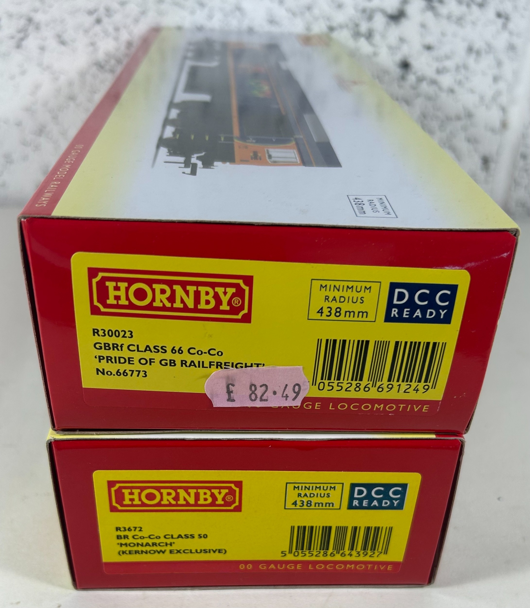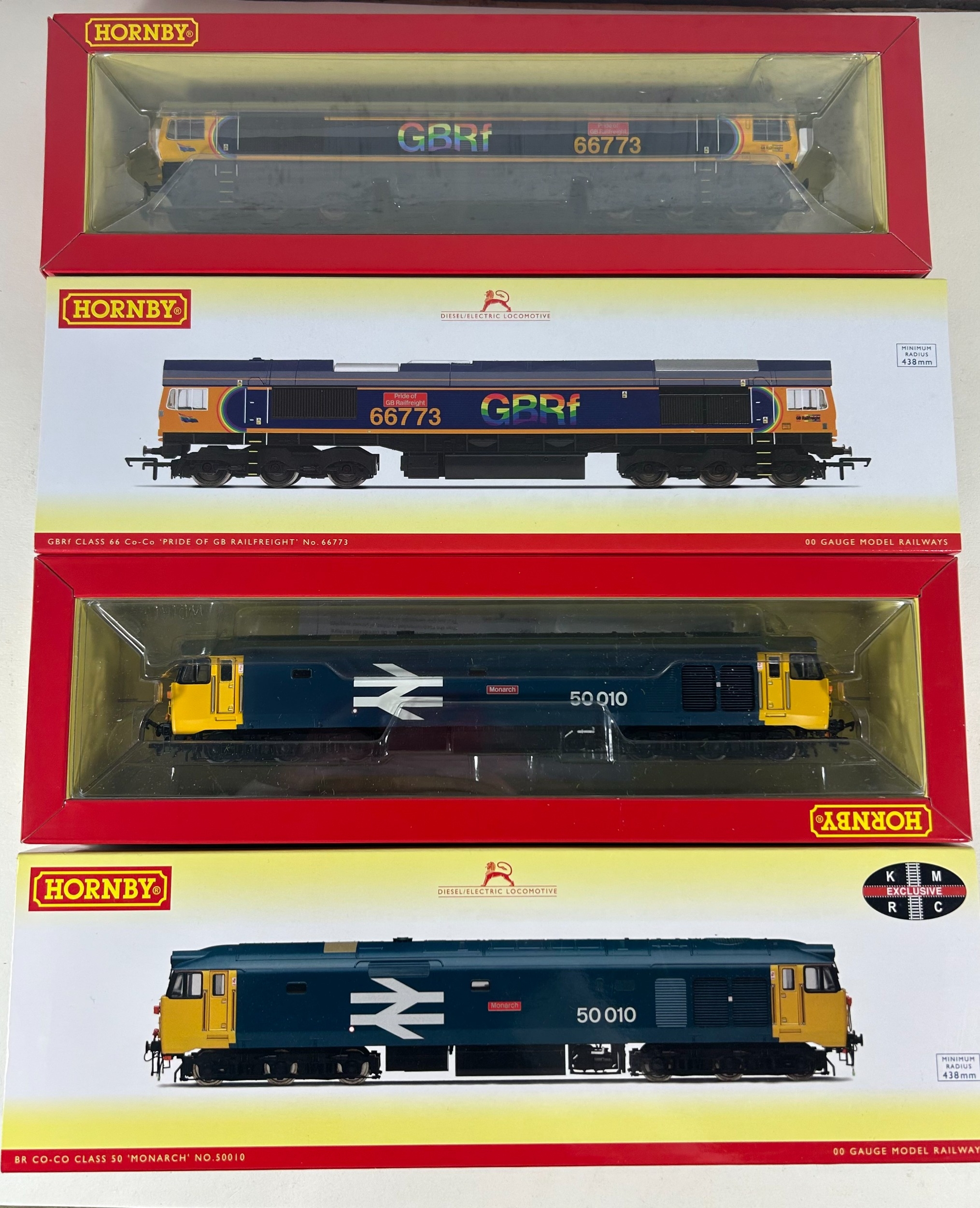 2 Hornby OO Railway Diesel Electric Locomotives. A GBRf Class 66 Co-Co 'Pride of GB Railfreight' 66773 (R.30023). Plus a BR Class 50 Co-Co 'Monarch' 50010 (R.3672). Kernow Exclusive. Both boxed. Contents look to be as new.