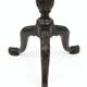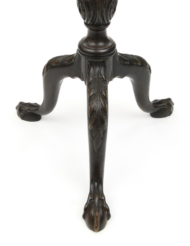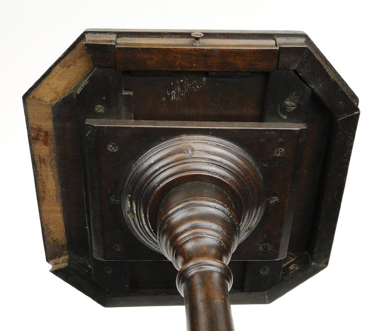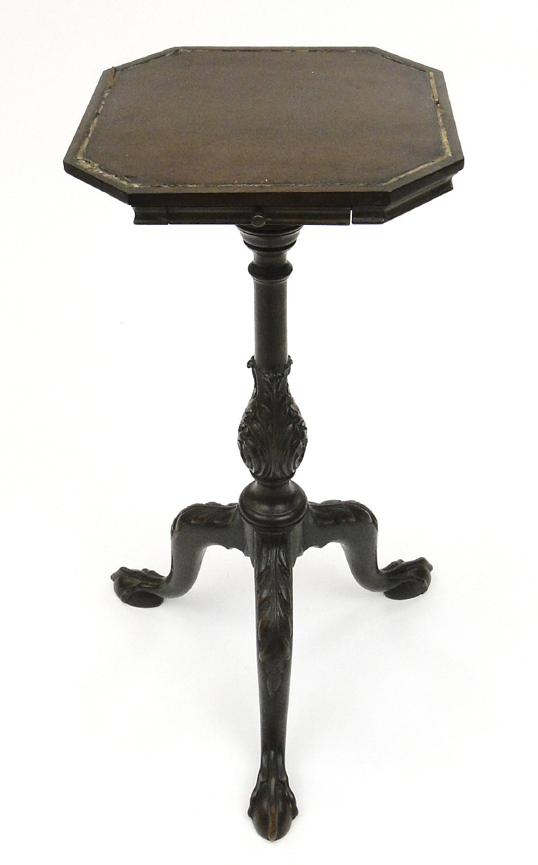 19th Century mahogany kettle stand, the square top with canted corners, raised on a turned and acanthus carved stem and acanthus carved cabriole legs with claw feet, 63cm high x 28cm wide