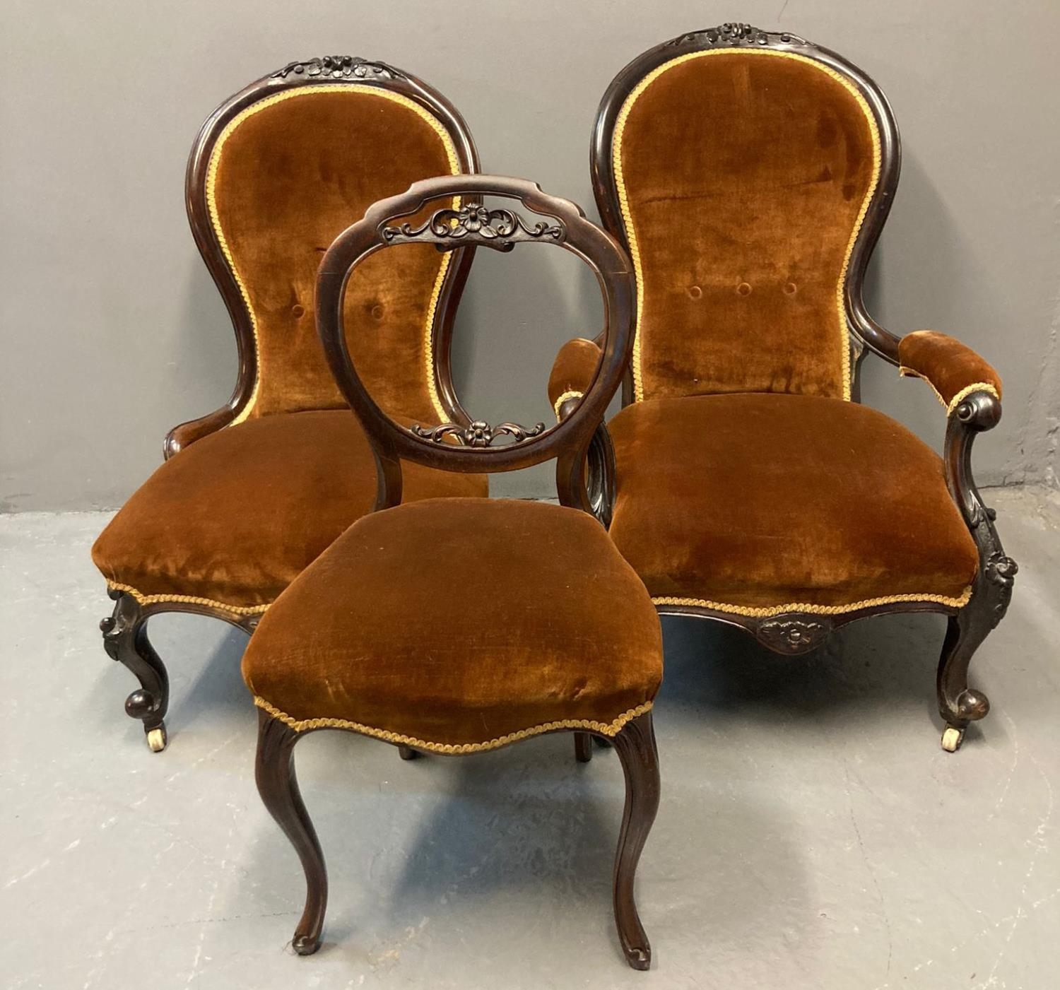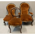 Victorian walnut Harlequin parlour suite comprising ladies and gentleman's button back fireside chairs, a set of four regency design chairs and another similar, all with brown upholstered stuff over seats. (7) (B.P. 21% + VAT)