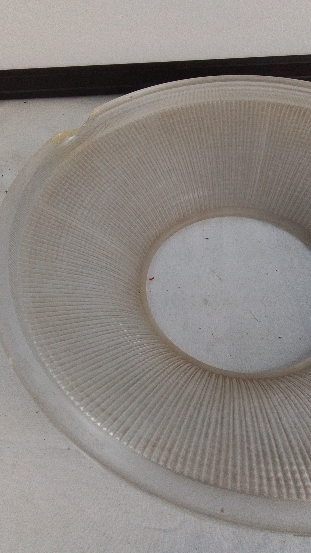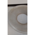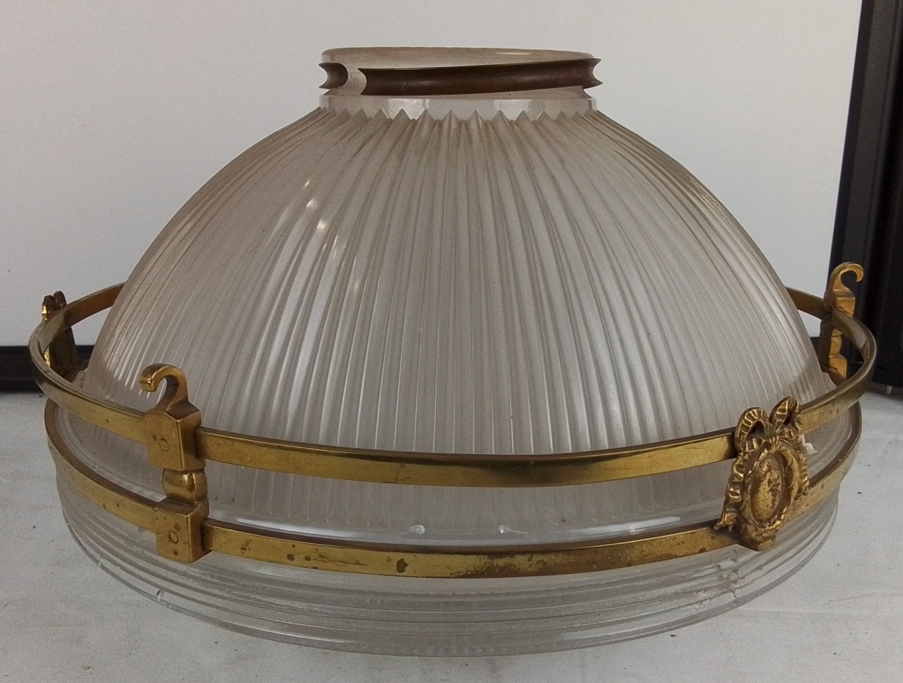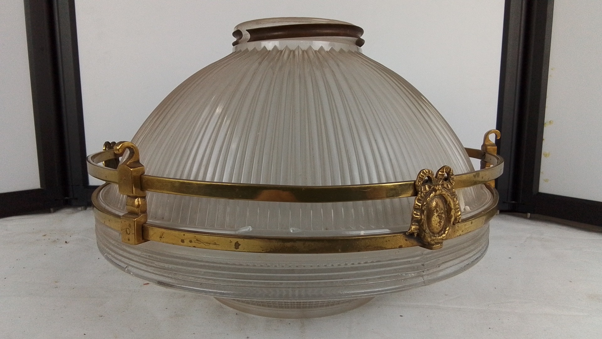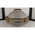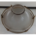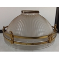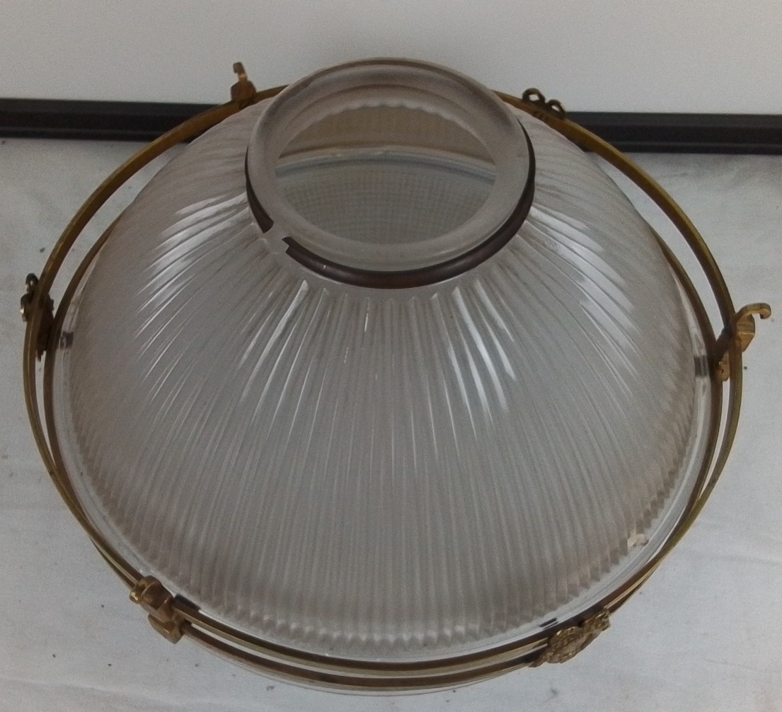 A stunning antique French Holophane 2131 pendant light fitting with brass detail & glass bowl, 30cm diameter, (a/f) Holophane 2130 pat d, no 114988 inscribed on the top rim under the metal strip.