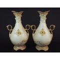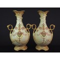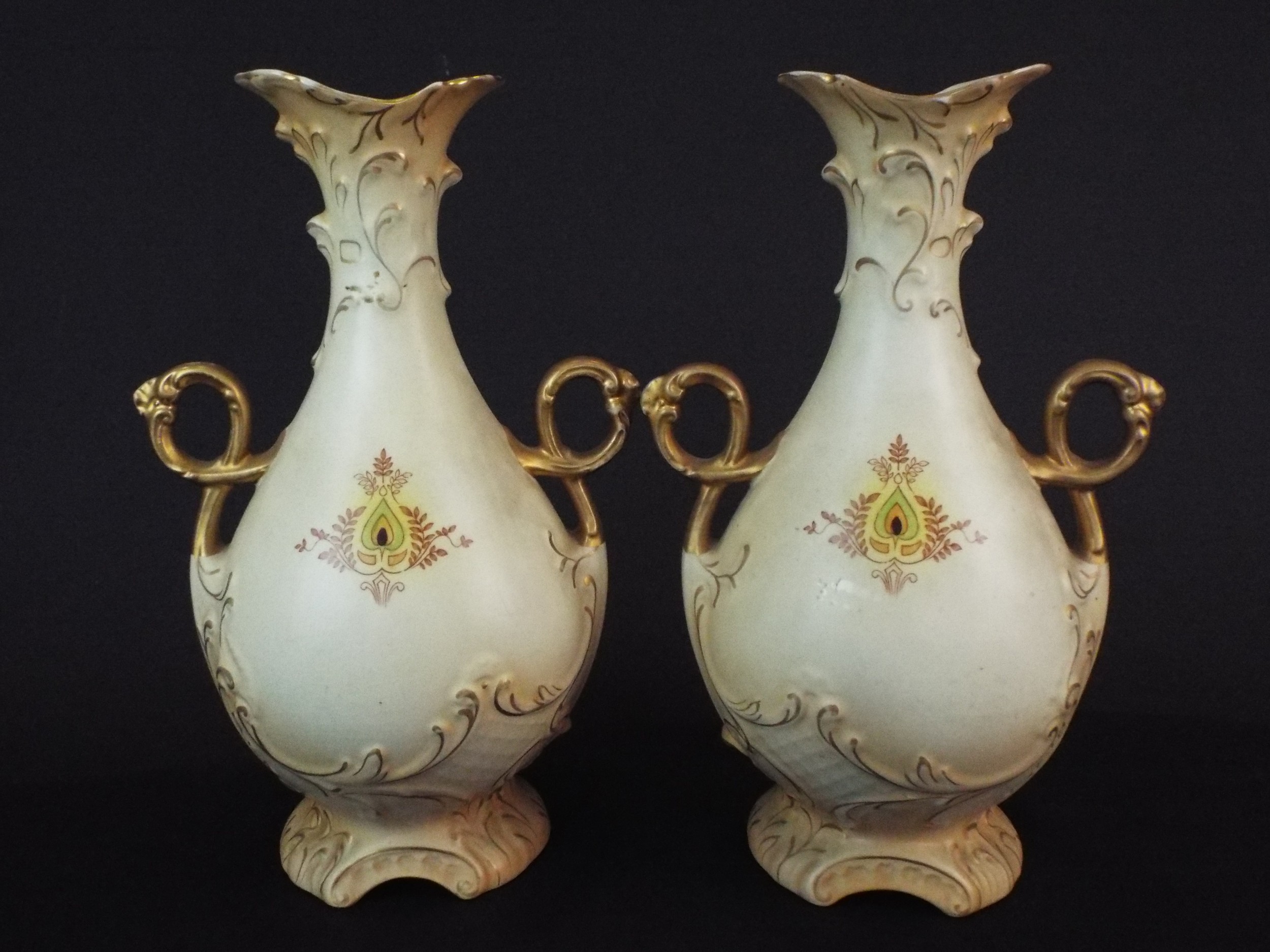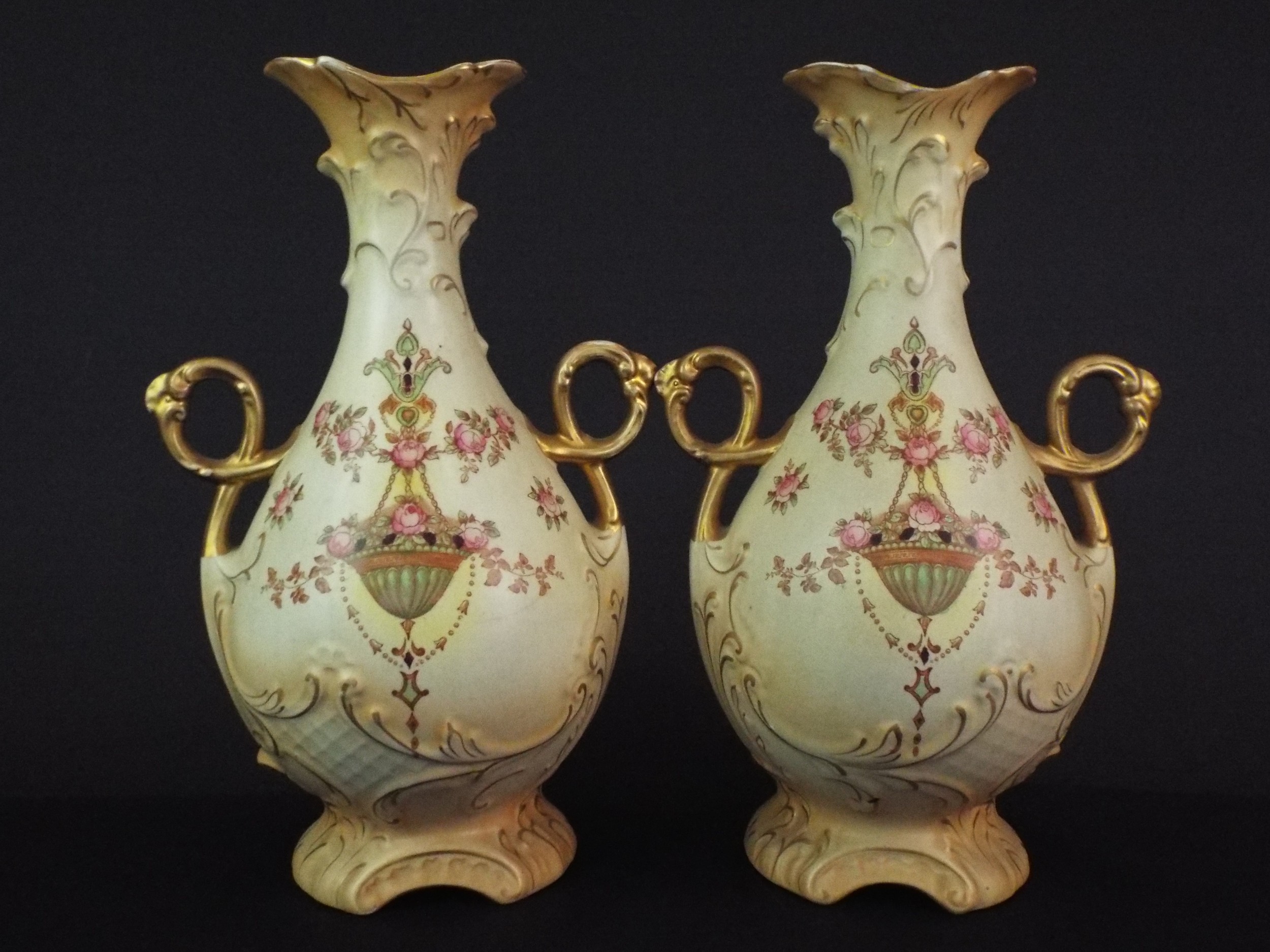 Pair of Edwardian Blushware transfer printed vases. 12 inches tall, free from damage save for a small 2 inch long hairline to the lip of one vase. (see photo) PA198