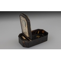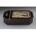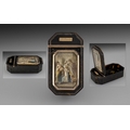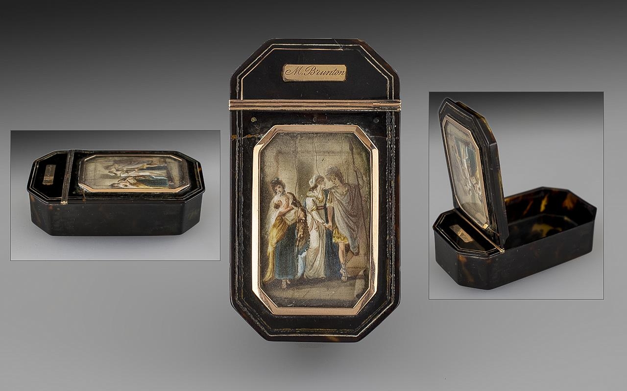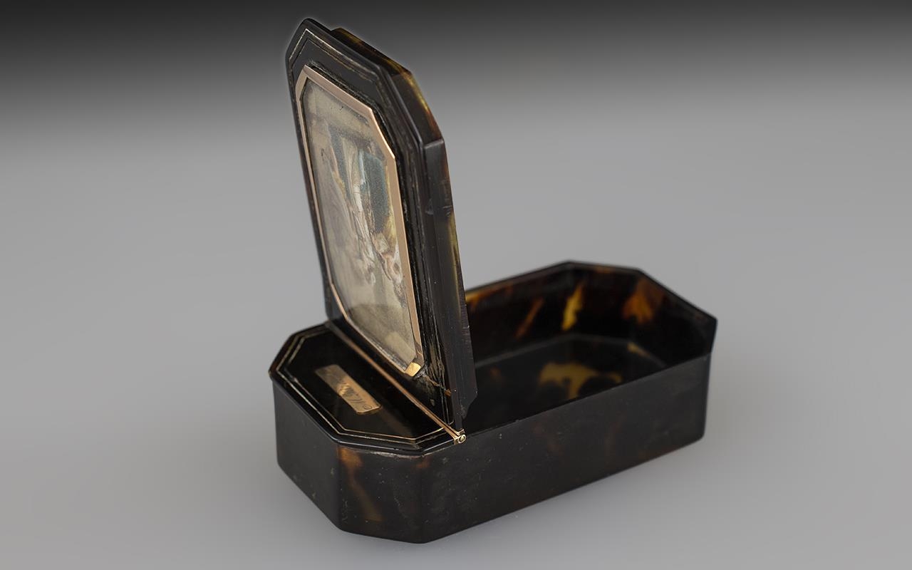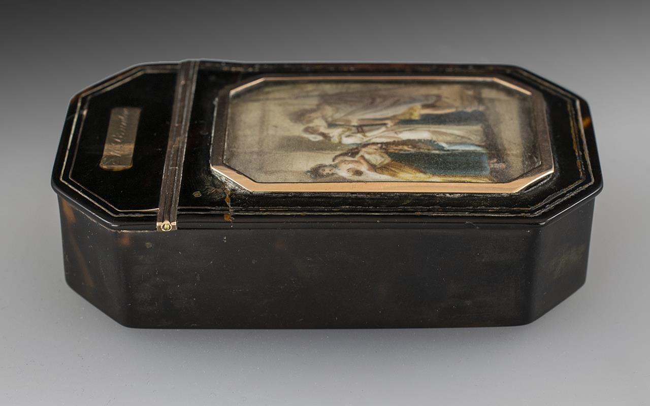 French Superb 18th Century Tortoiseshell and Gold Mounted Hinged Lidded Snuff Box, of wonderful quality and proportions. The central feature is a miniature painting on ivory depicting a classical scene 'Huntress' within a 9ct gold frame. The hinge also of 9ct gold. Measurements: 3.5'' - 8.75 cm length, 2'' - 5 cm wide. Hinge excellent, closes tightly.