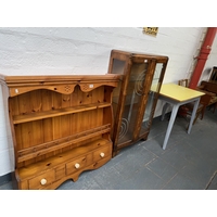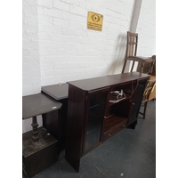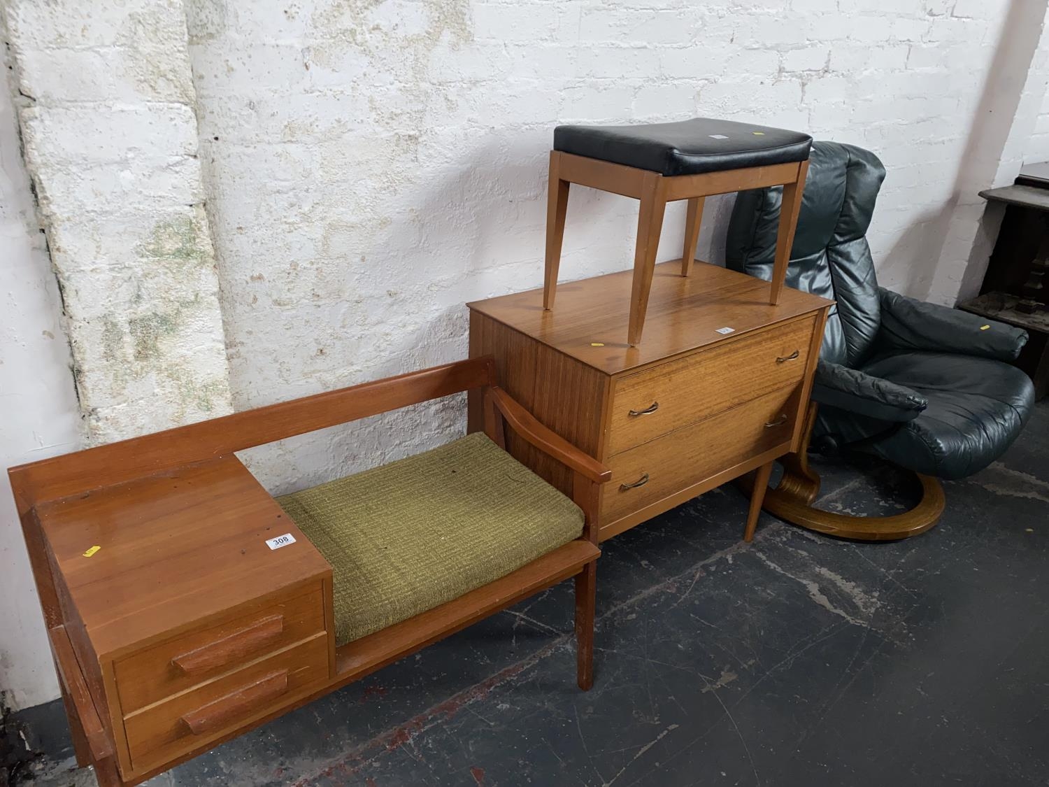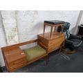 A telephone table, two drawer chest of drawers, a stool, mid century green leather swivel chair with matching stool