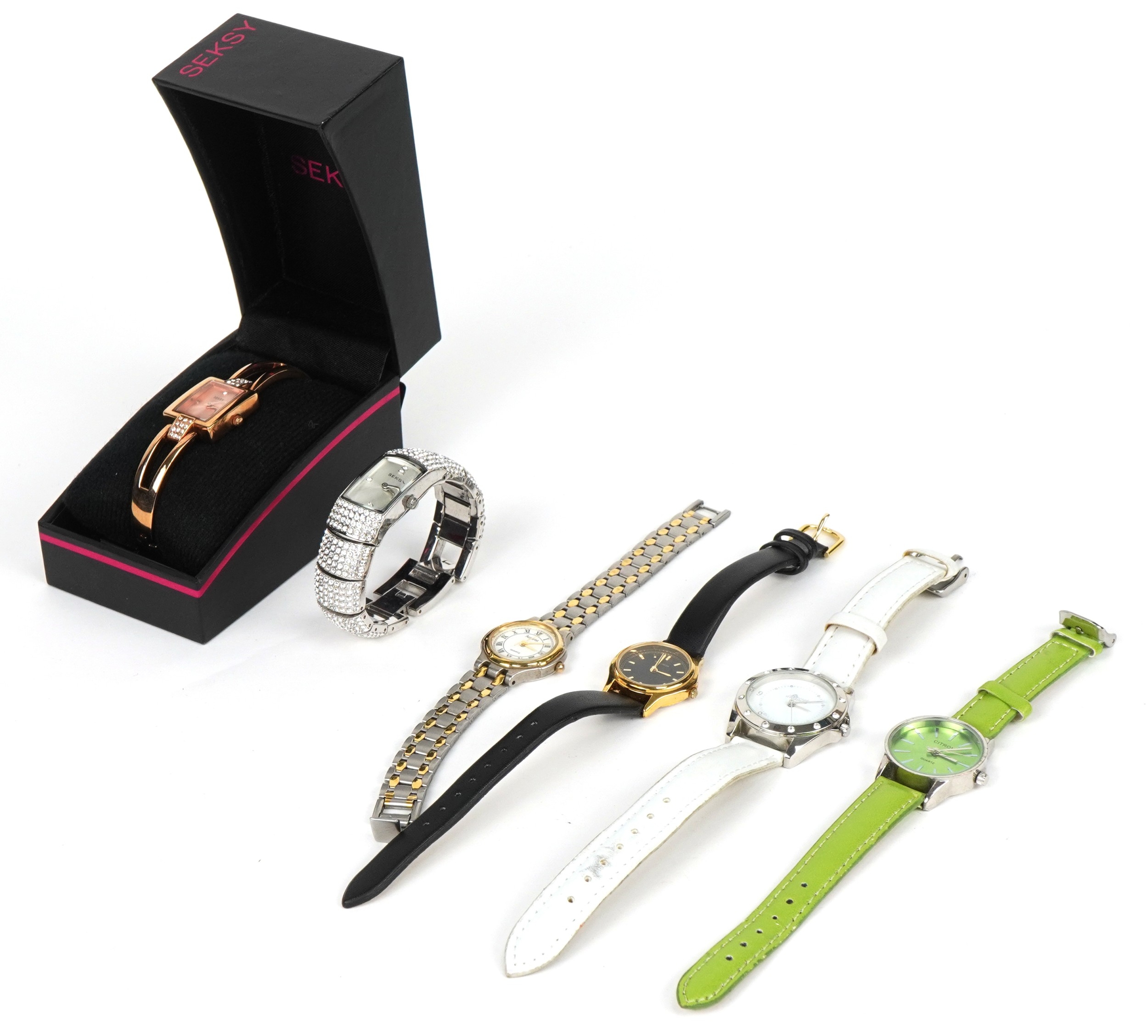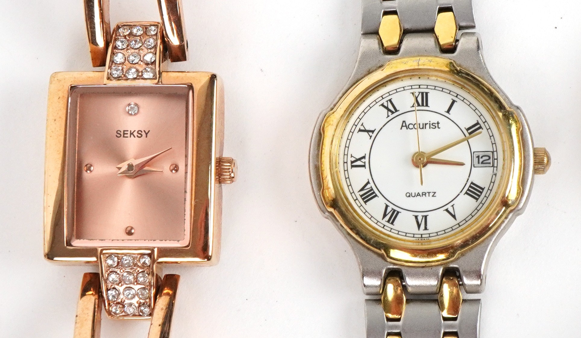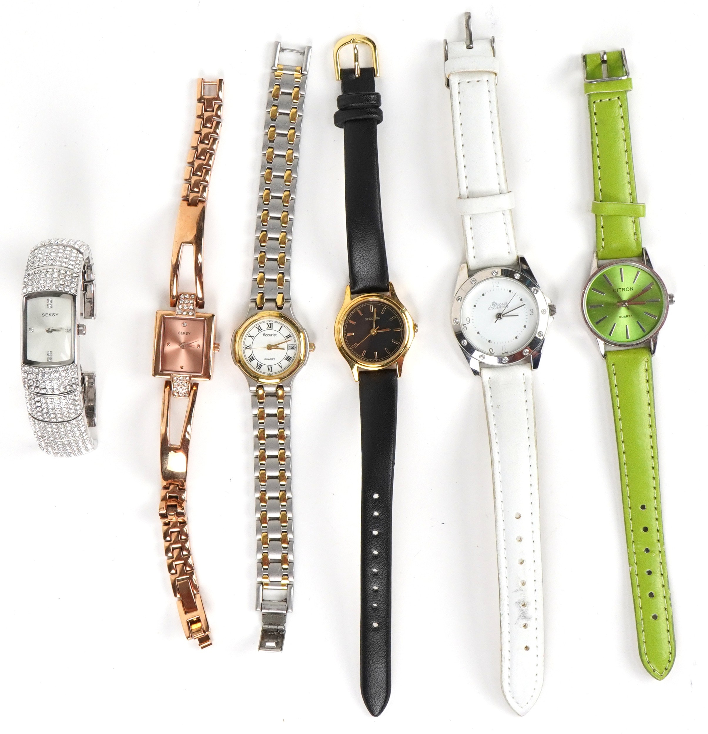 Six vintage and later ladies wristwatches including Seksy, Sekonda and Accurist.
