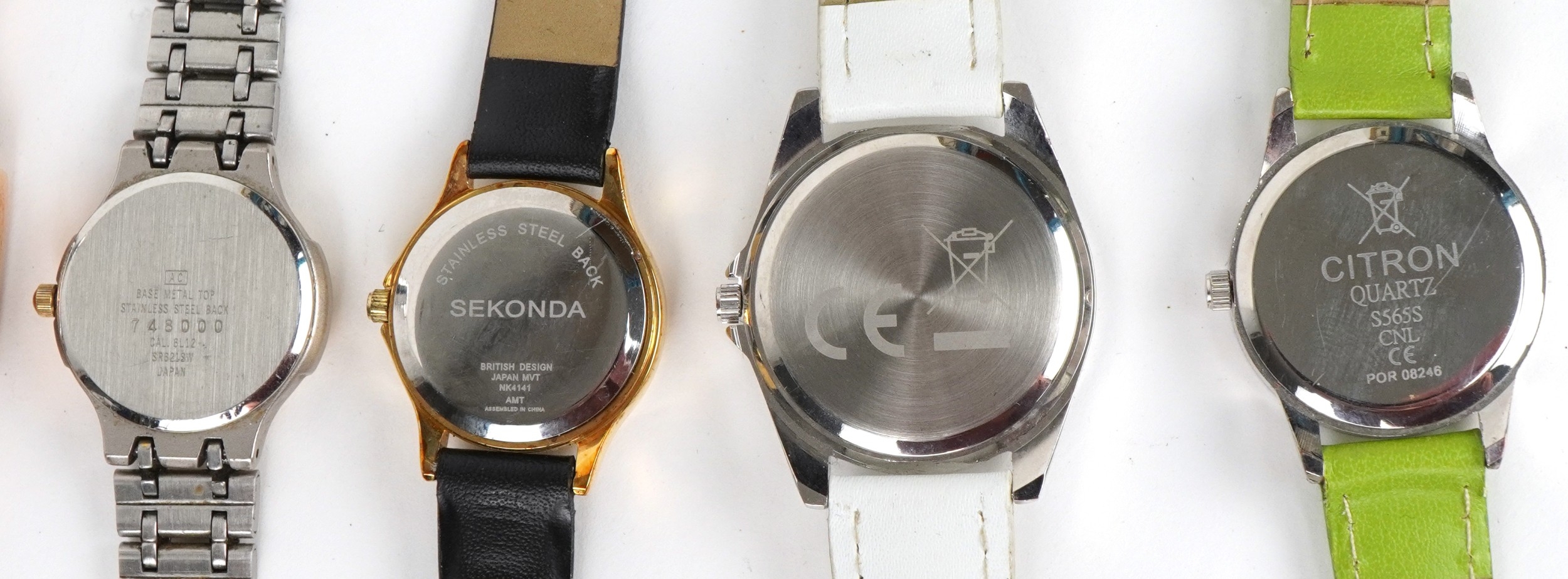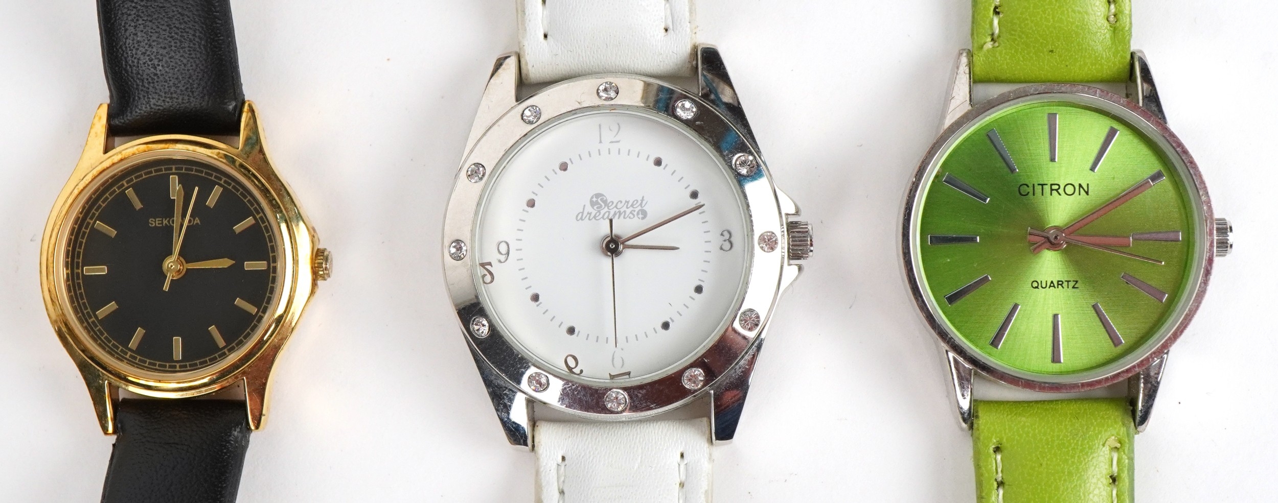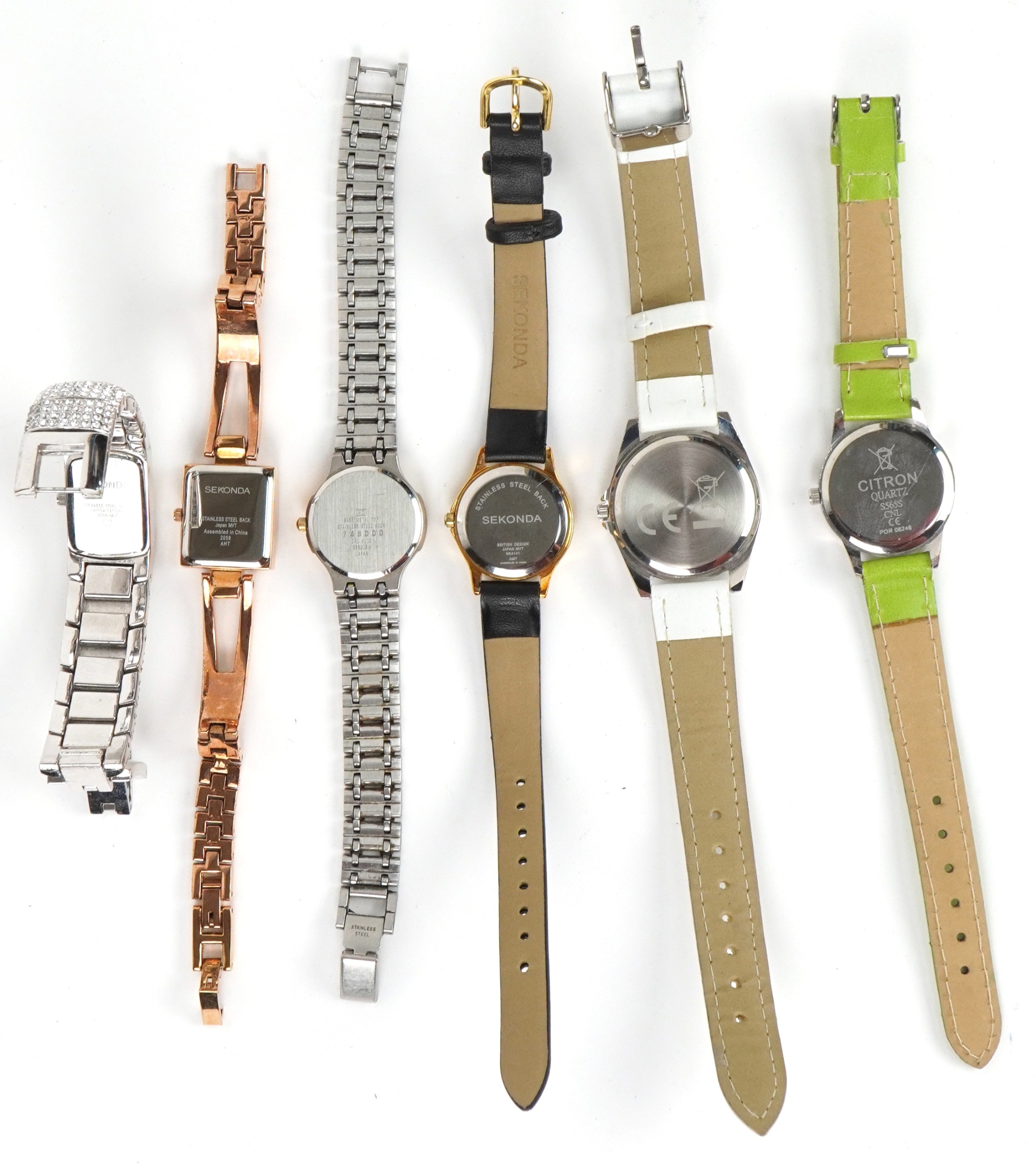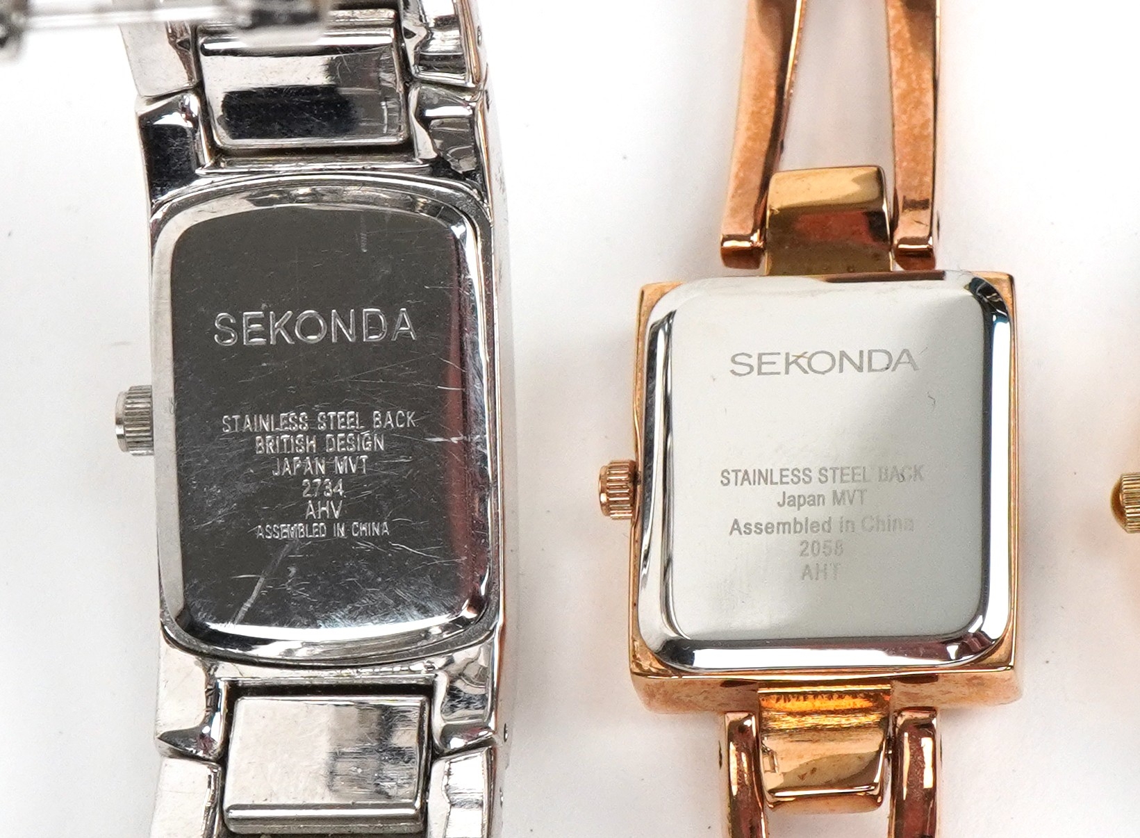 Six vintage and later ladies wristwatches including Seksy, Sekonda and Accurist.