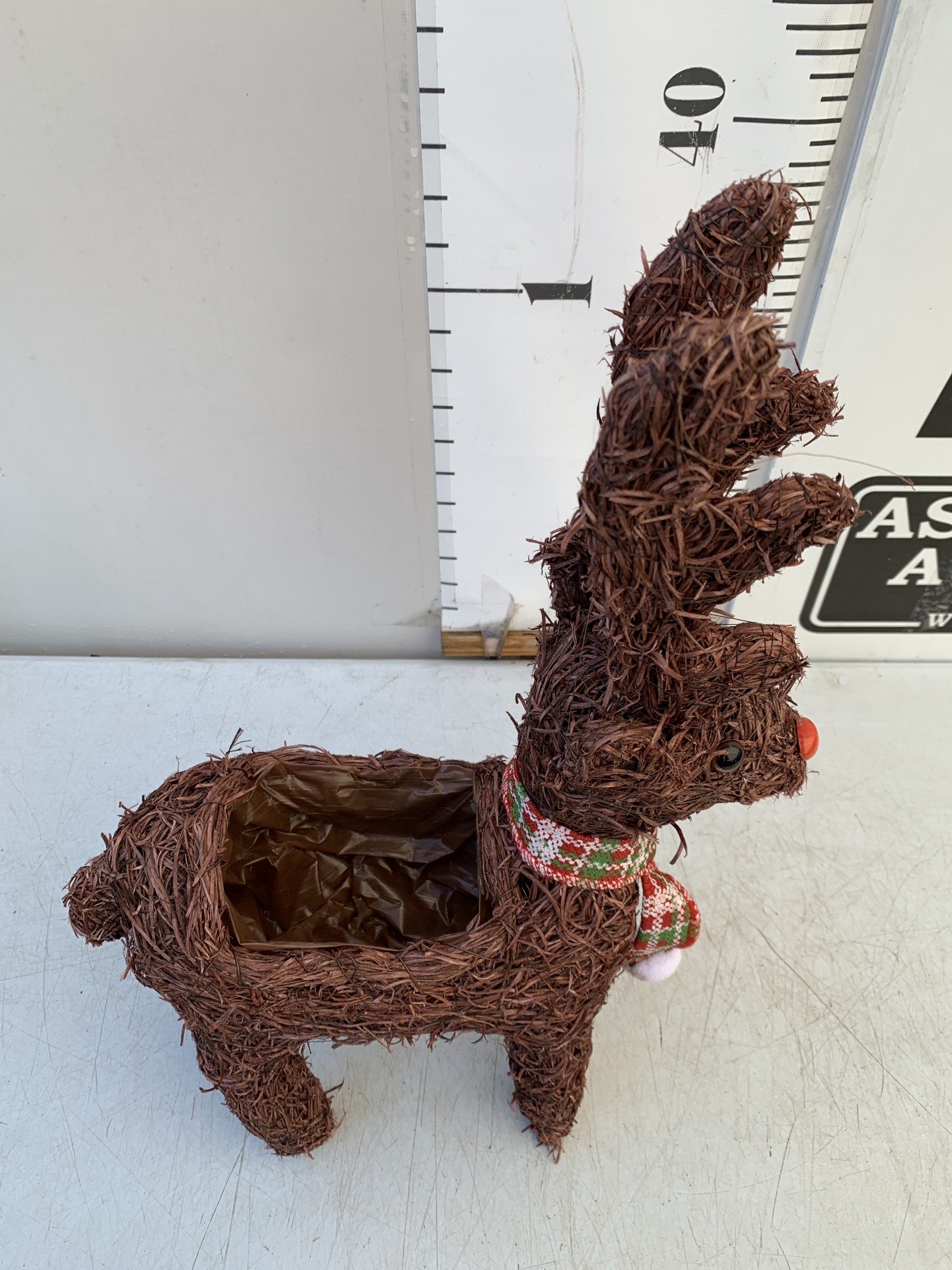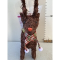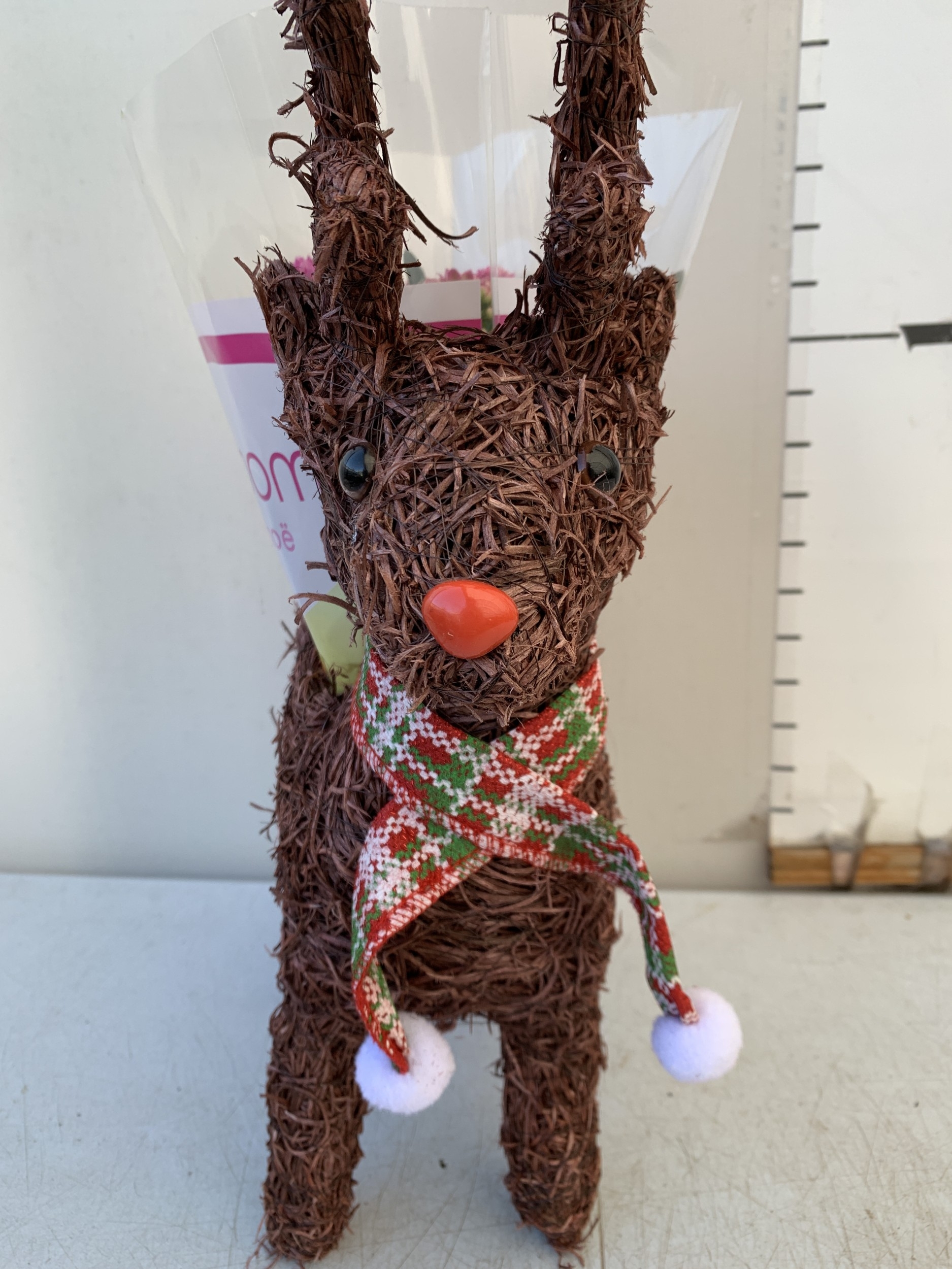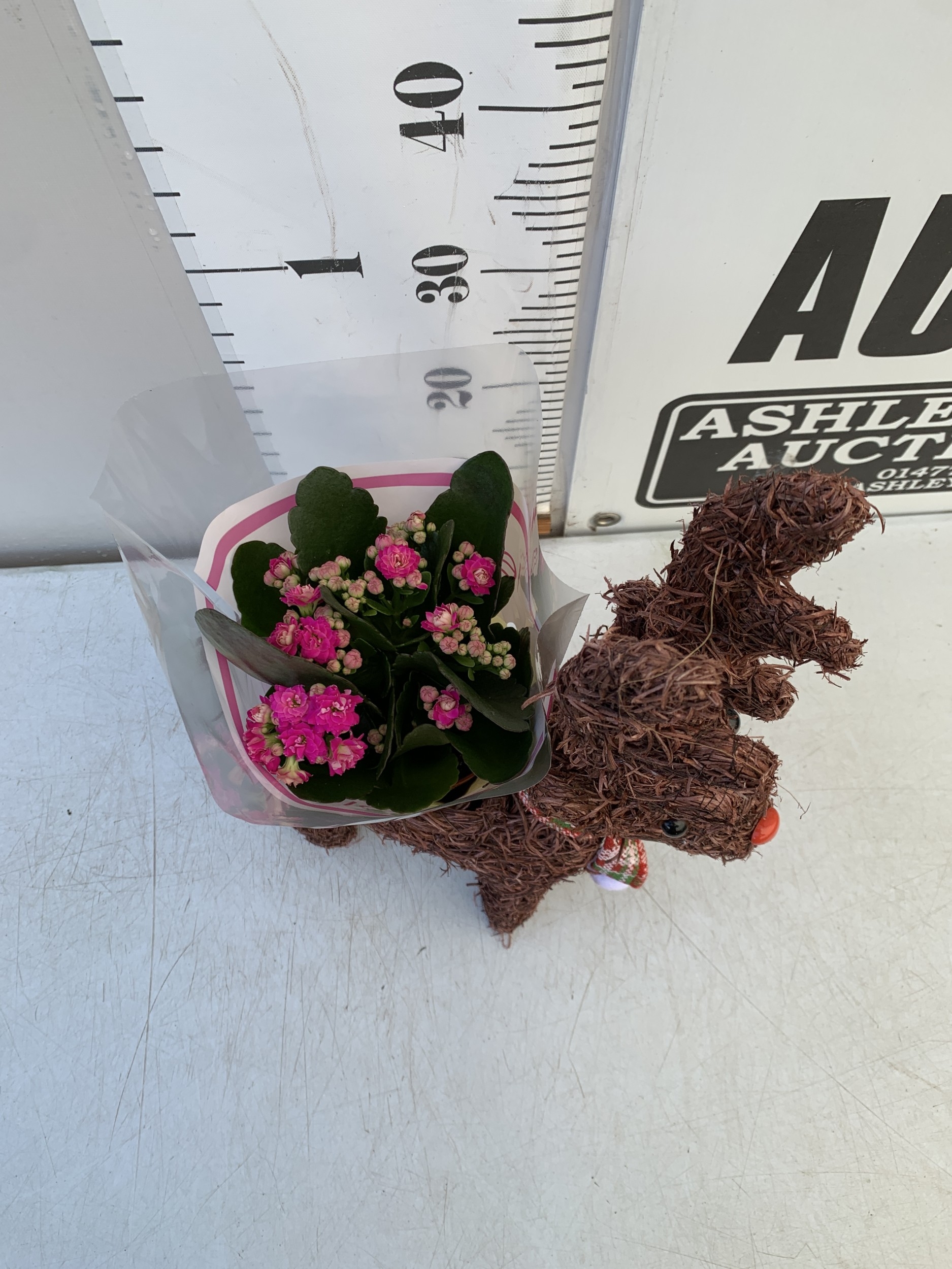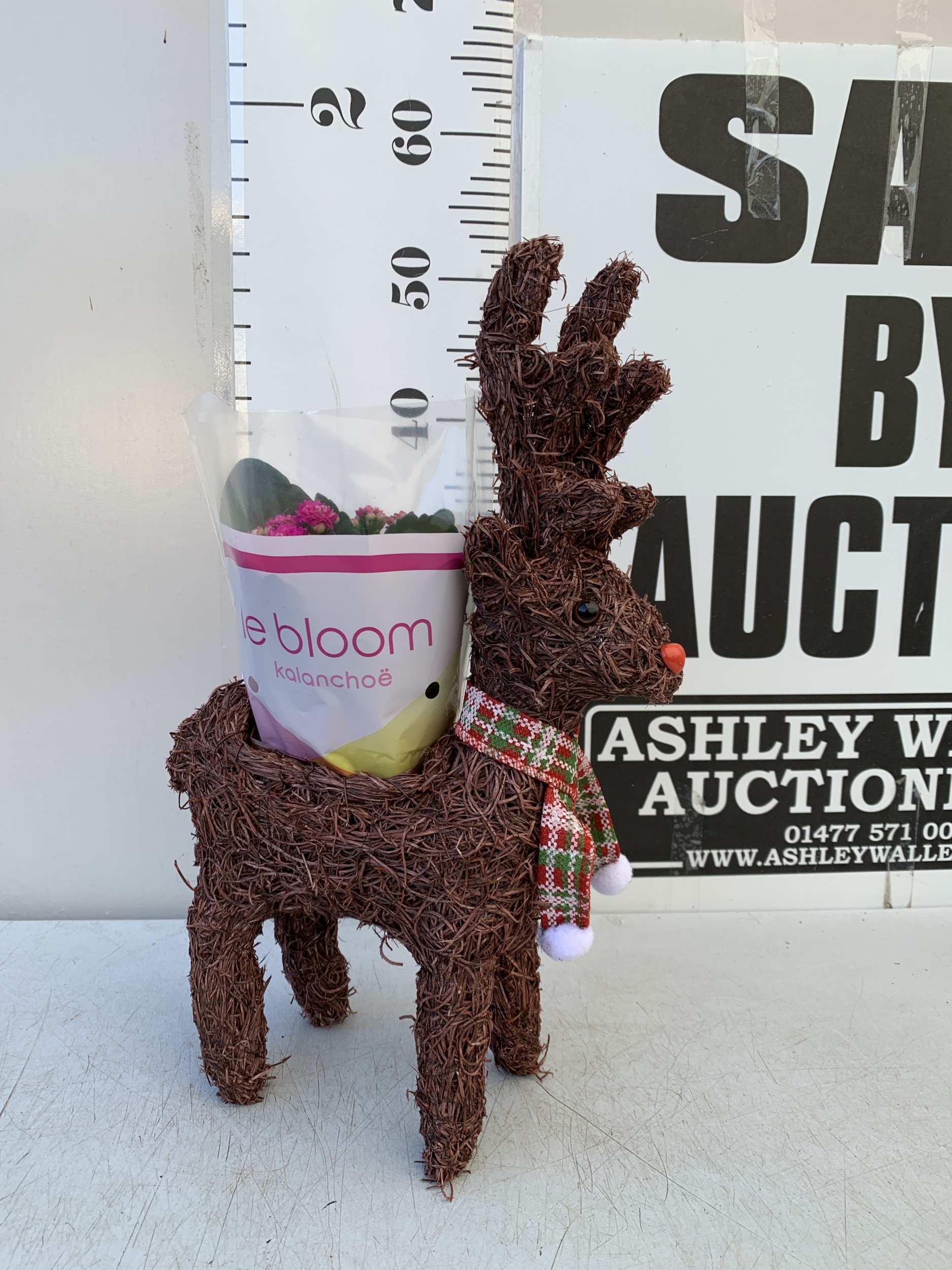 ONE CHRISTMAS REINDEER BASKET PLANTER WITH GIFT WRAPPED POTTED KALANCHOE CALANDIVA IN FLOWER. REINDEER STANDS 50CM TALL.