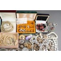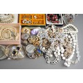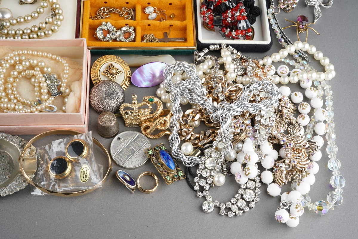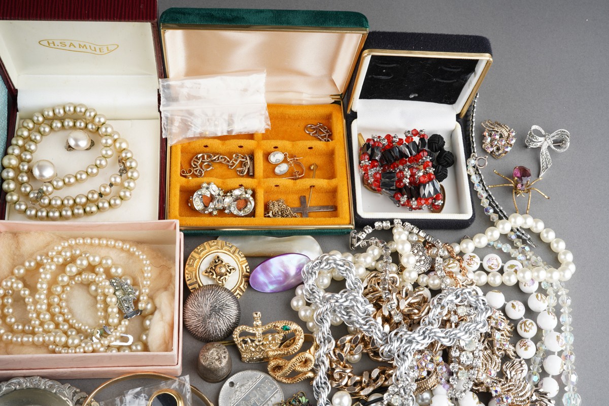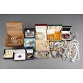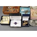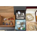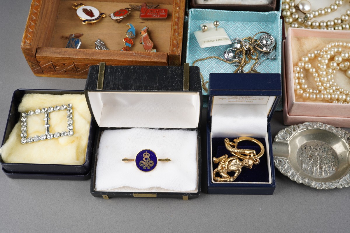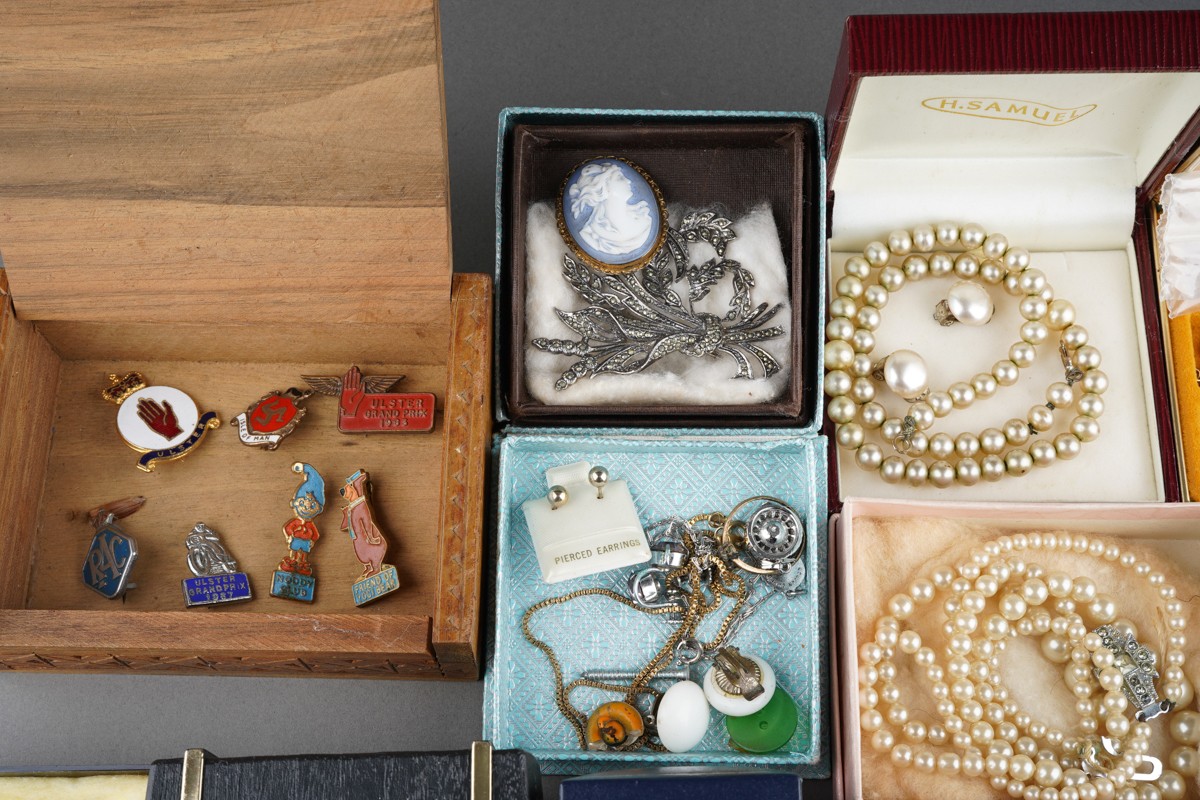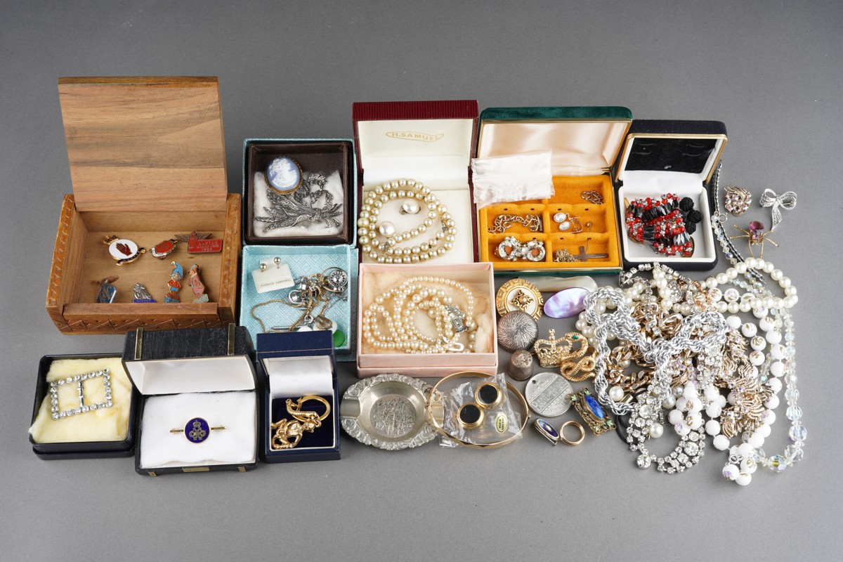 Costume jewellery lot to include pearsl, wedgwood style cameo, marcasite brooch, various yellow metal earrings, 1/5th 9ct gold bangle with bronze core ( 18.4g approx)
