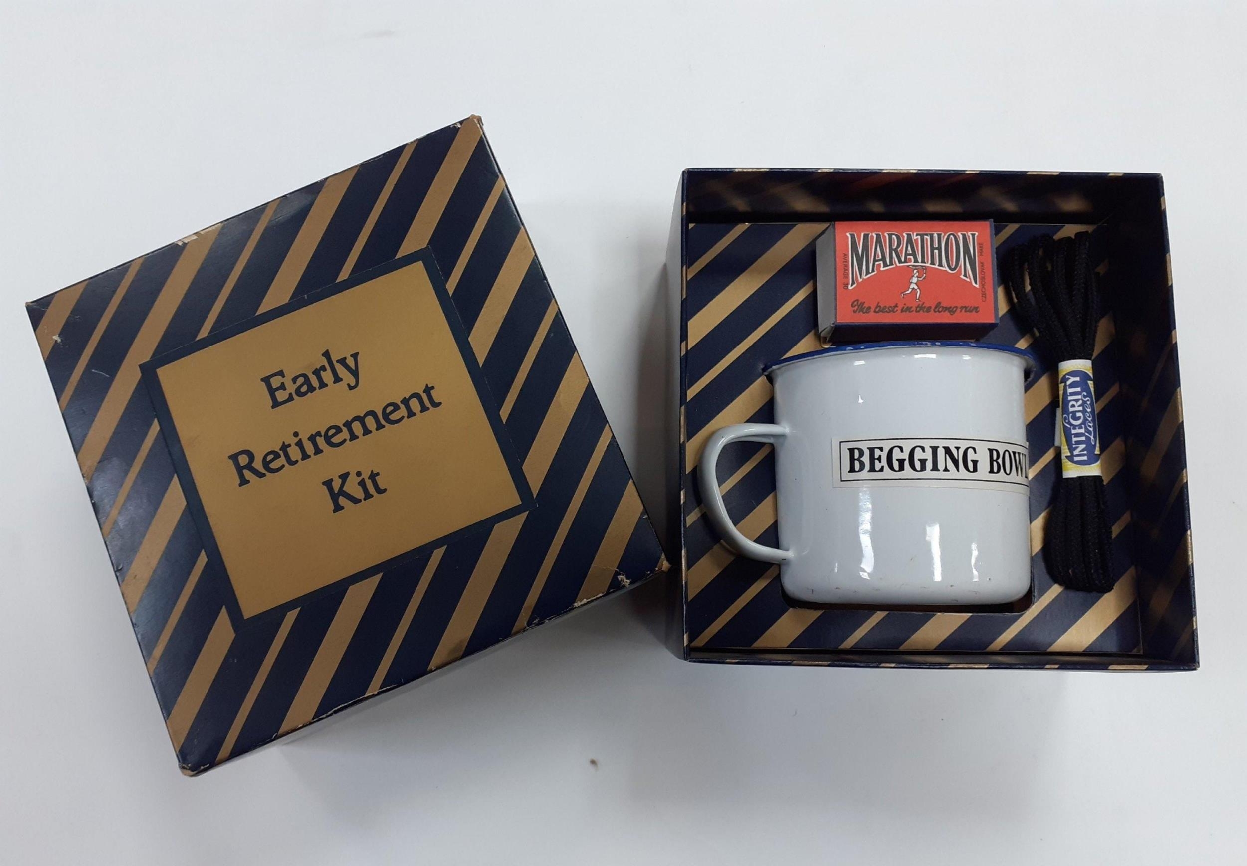 A TONGUE-IN-CHEEK lot for imminent RETIREES! An EARLY RETIREMENT KIT in original box to include a Begging Bowl, a box of Marathon - The best in the long run - matches and a pair of Integrity Shoe Laces. Happy Retirement!