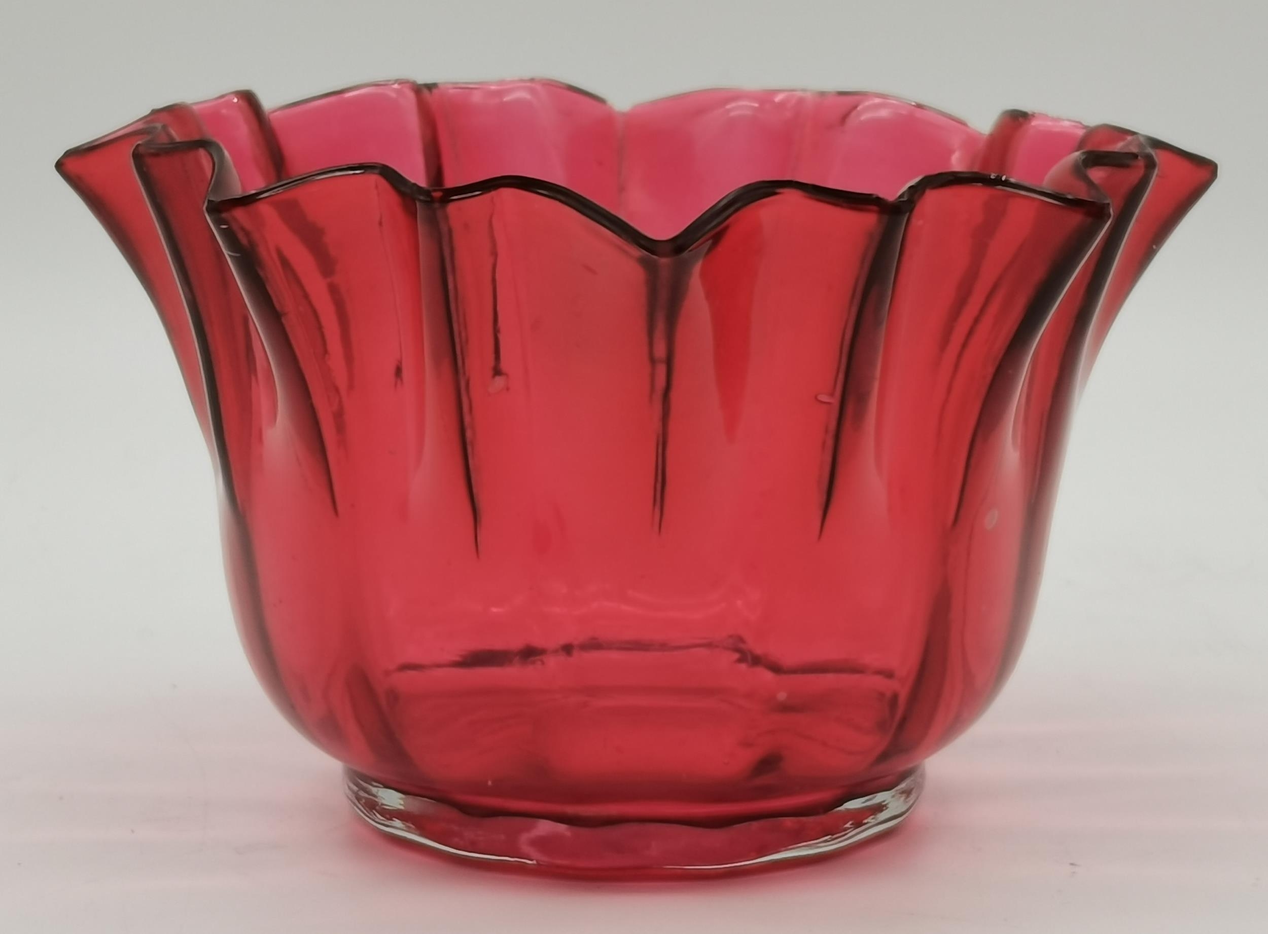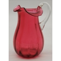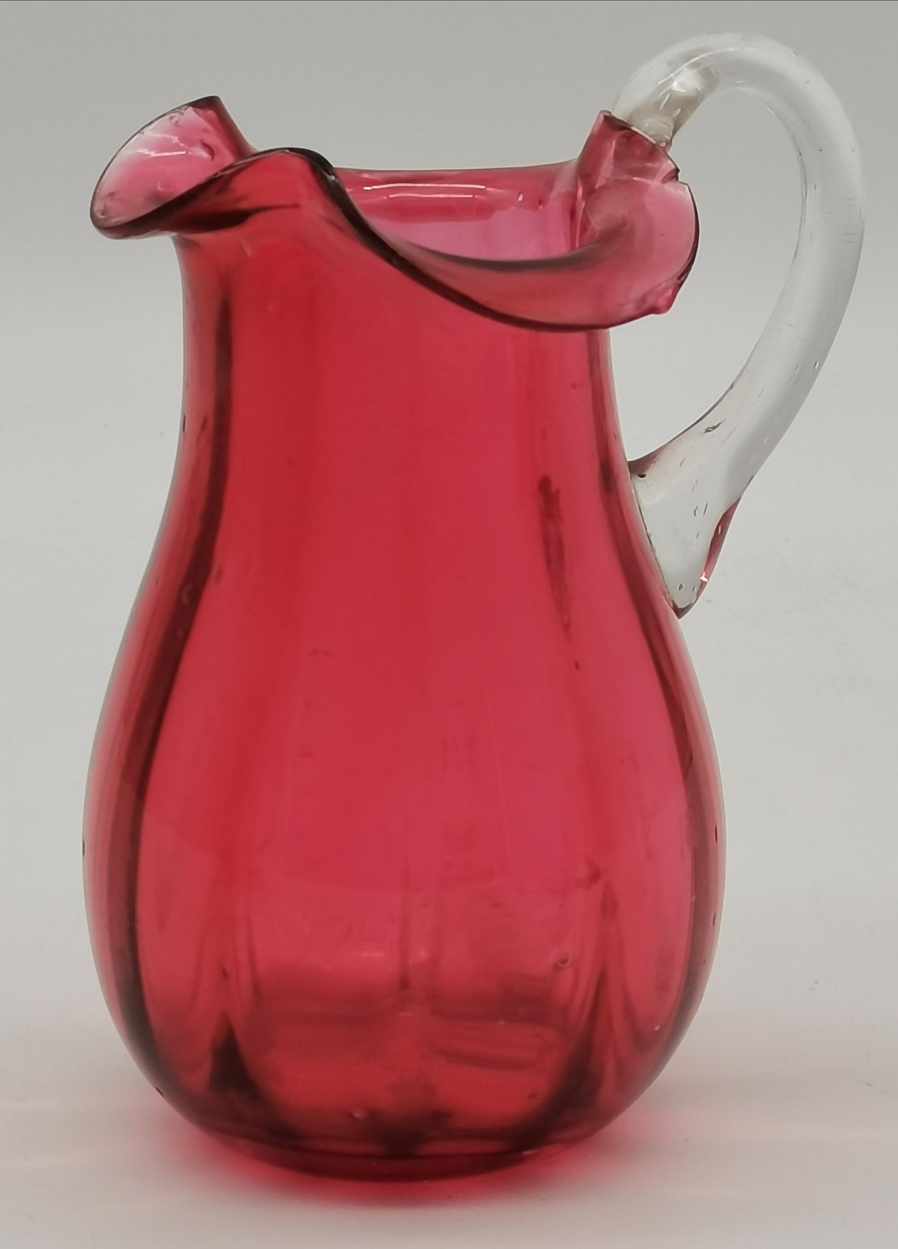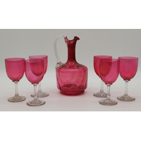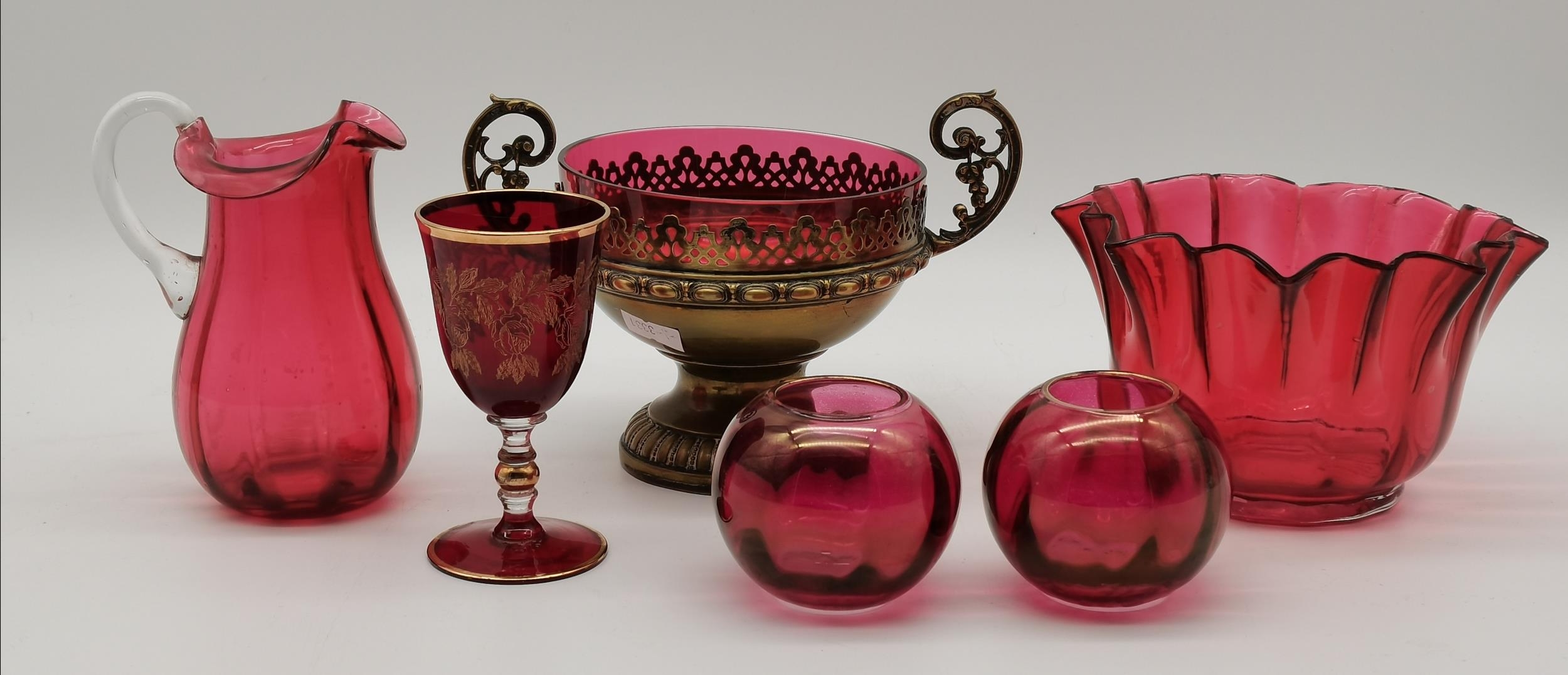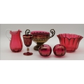 A group of cranberry glass wares comprising a fluted bowl, baluster jug, pair of small globular vases with gilded rims, a gilt-decorated goblet, and a twin-handled metal-mounted pedestal bowl. (6) Fluted bowl 15.5cm diameter