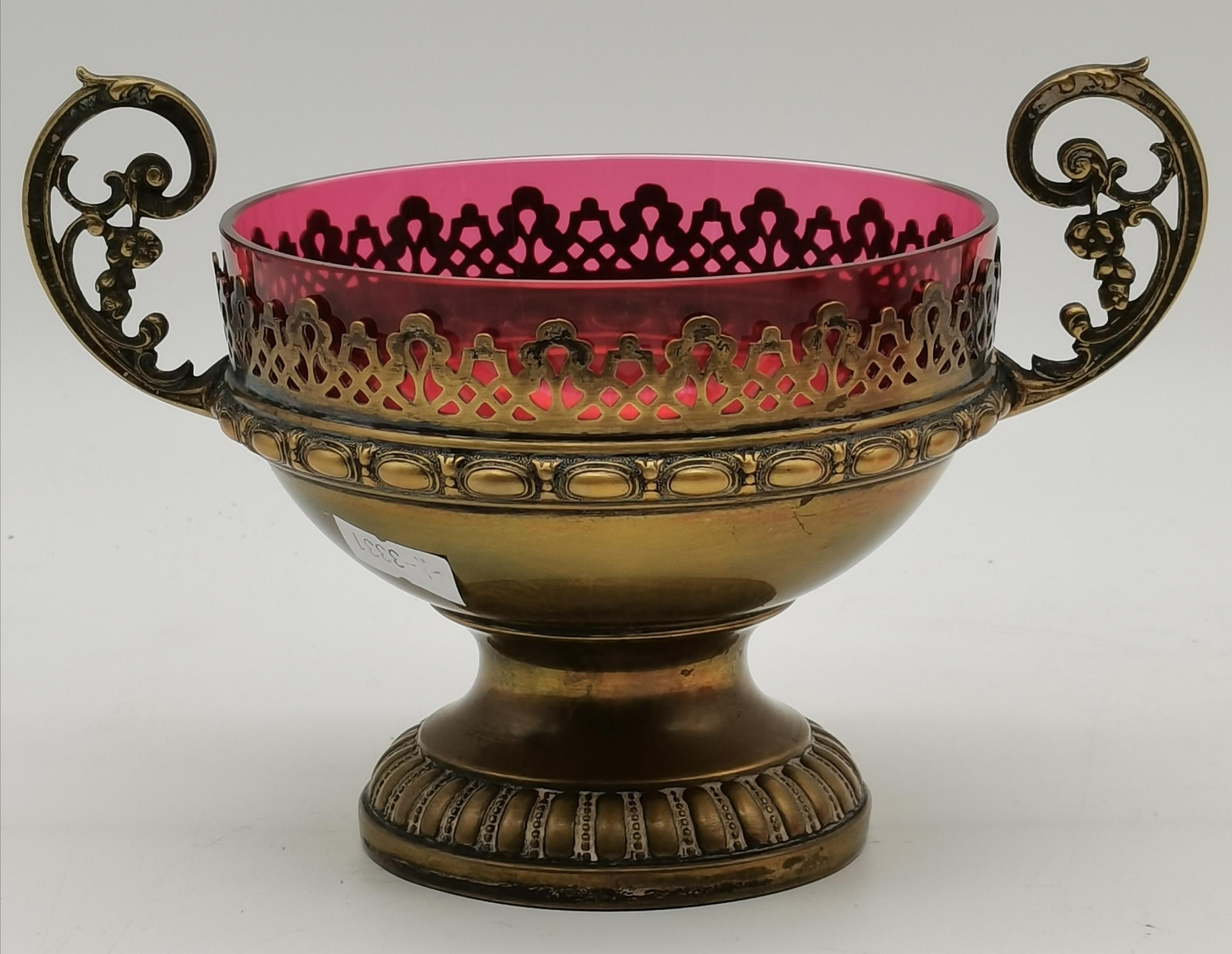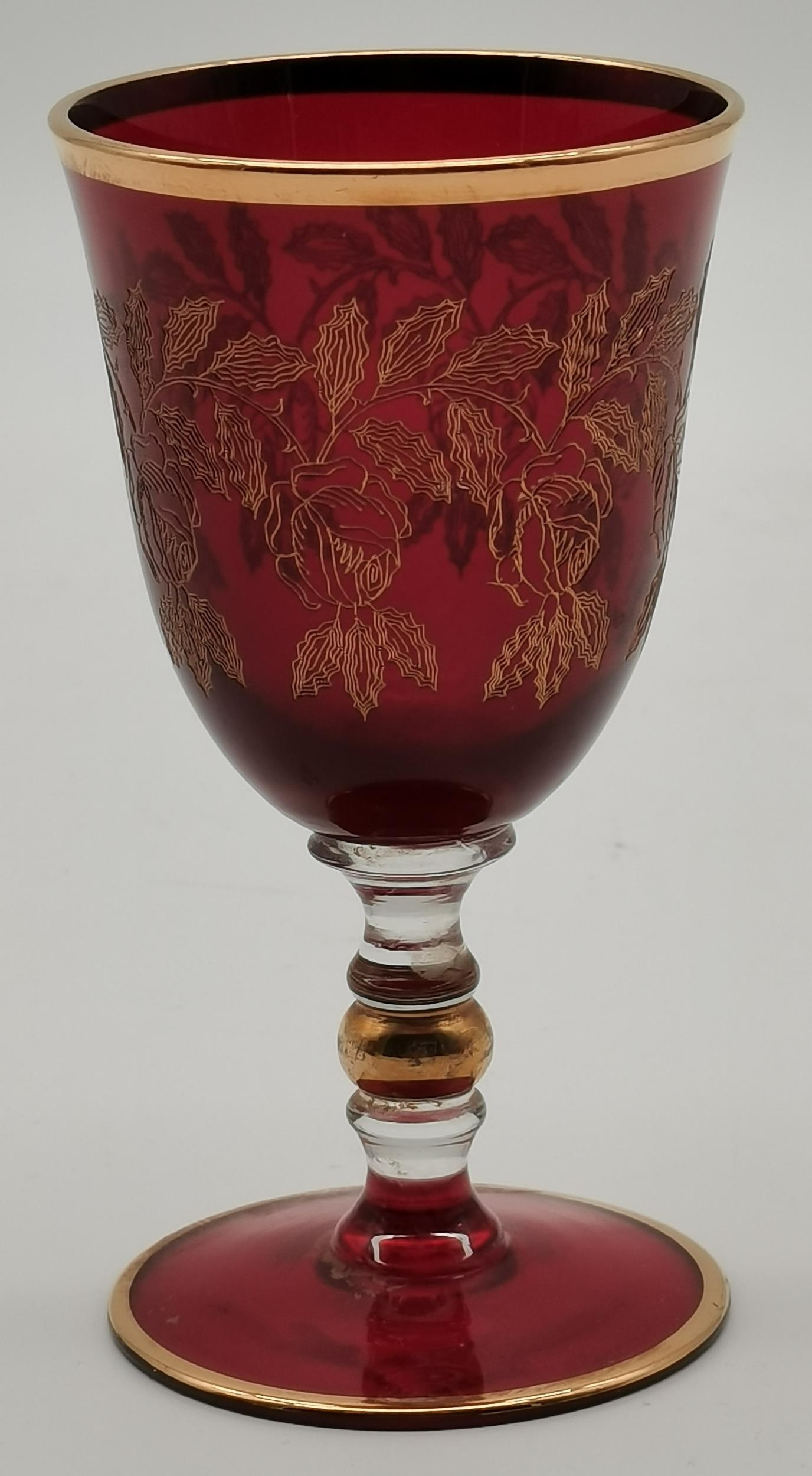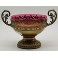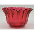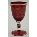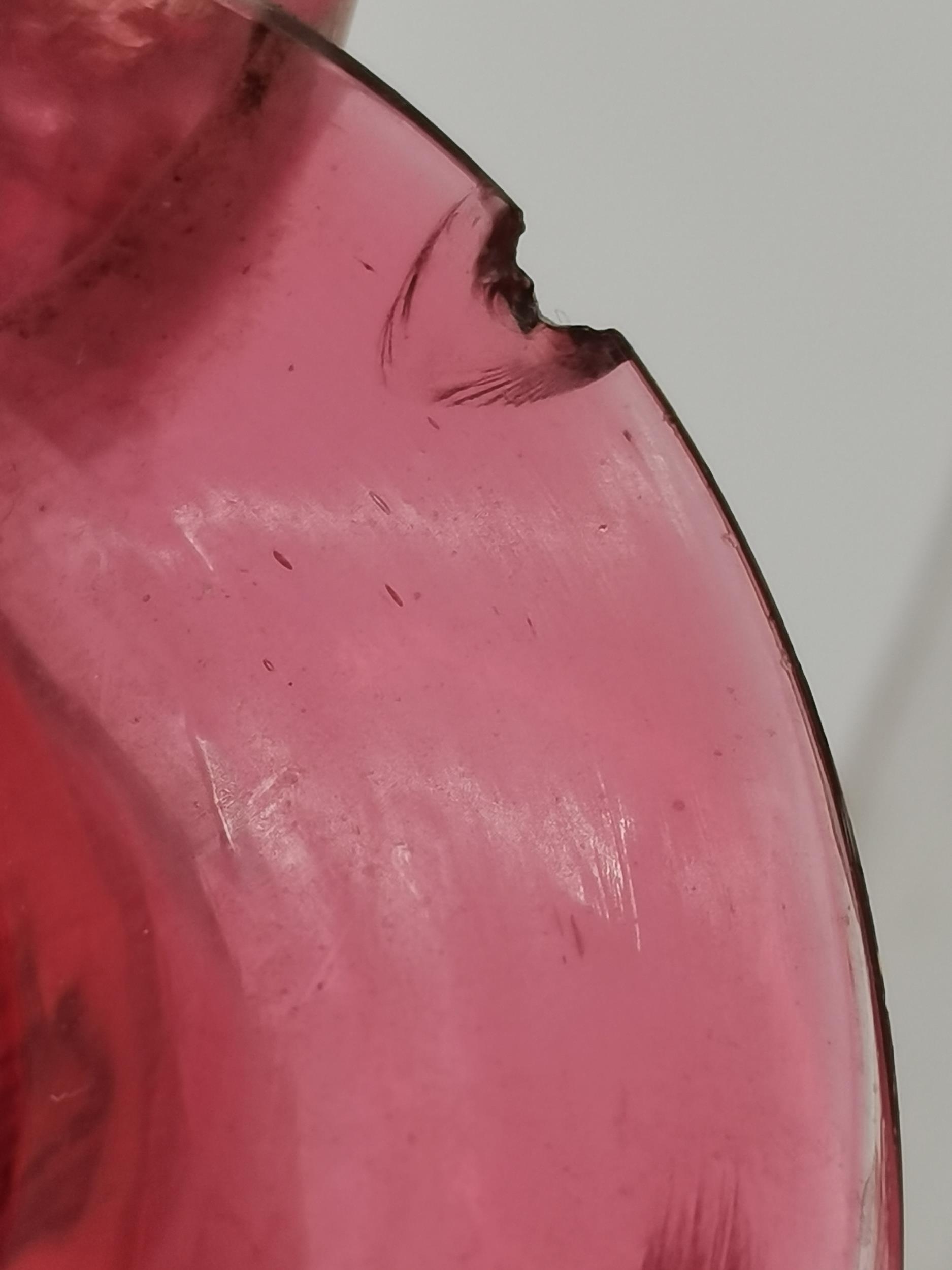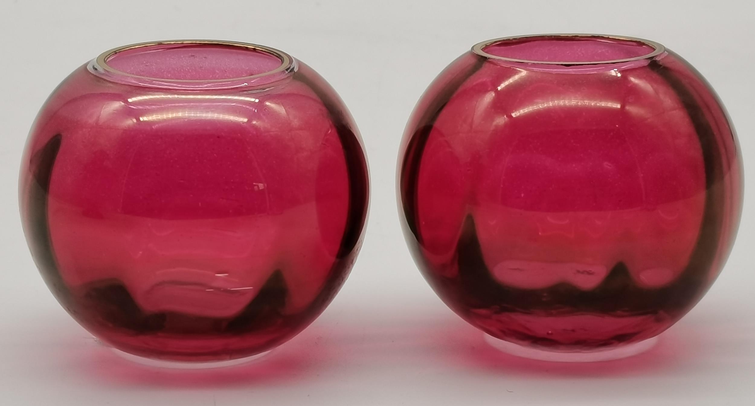 A group of cranberry glass wares comprising a fluted bowl, baluster jug, pair of small globular vases with gilded rims, a gilt-decorated goblet, and a twin-handled metal-mounted pedestal bowl. (6) Fluted bowl 15.5cm diameter