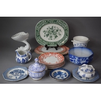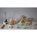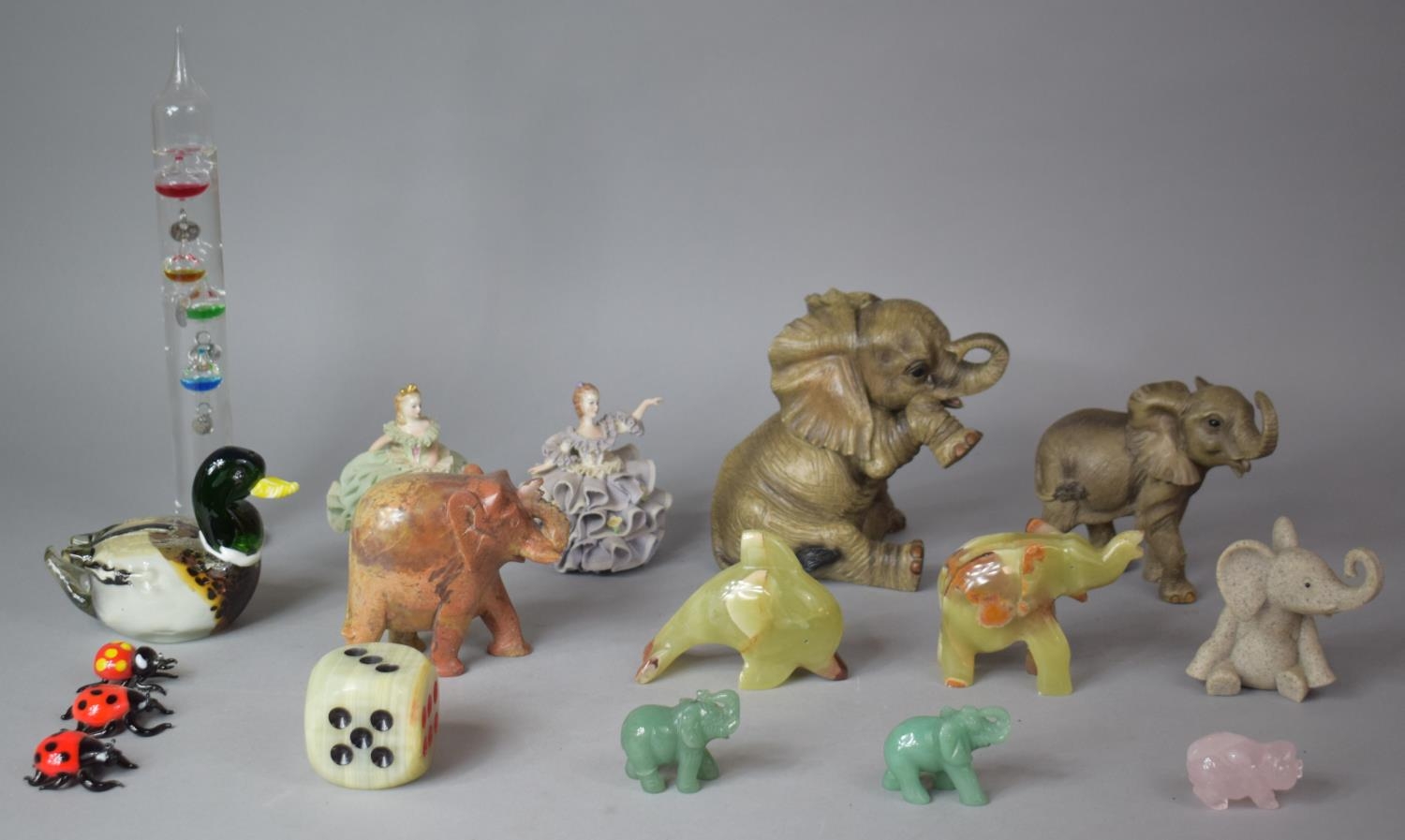 A Collection of Various Items to Include Glass Duck Paperweight, Glass Ladybug Figures, Stoneware Dice, Jadeite Carved Elephant, Pig, Alabaster Examples, Two Dresden Porcelain Ladies (AF) Etc