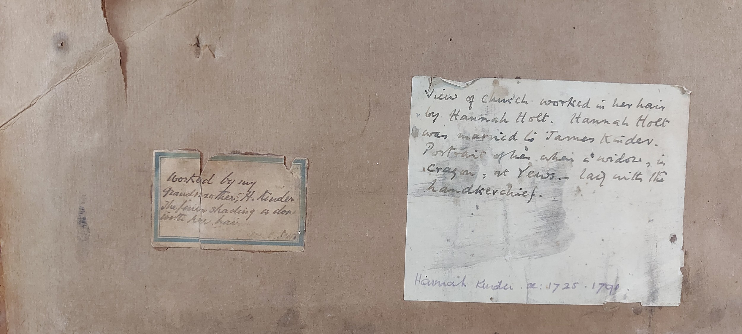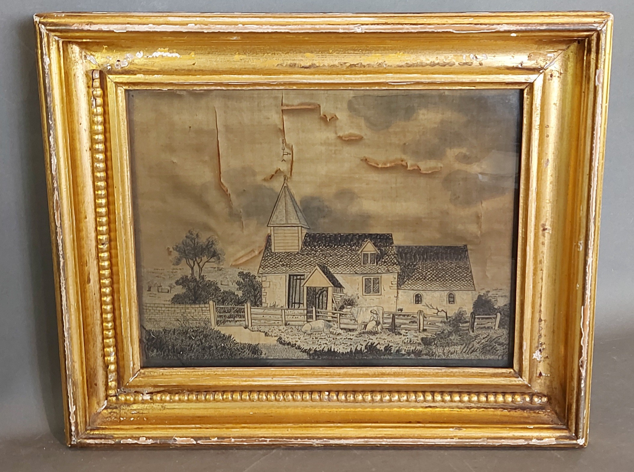 An 18th Century silk and hair embroidery, view of a chhurch by Hannah Holt, 19.5cms x 26.5cms