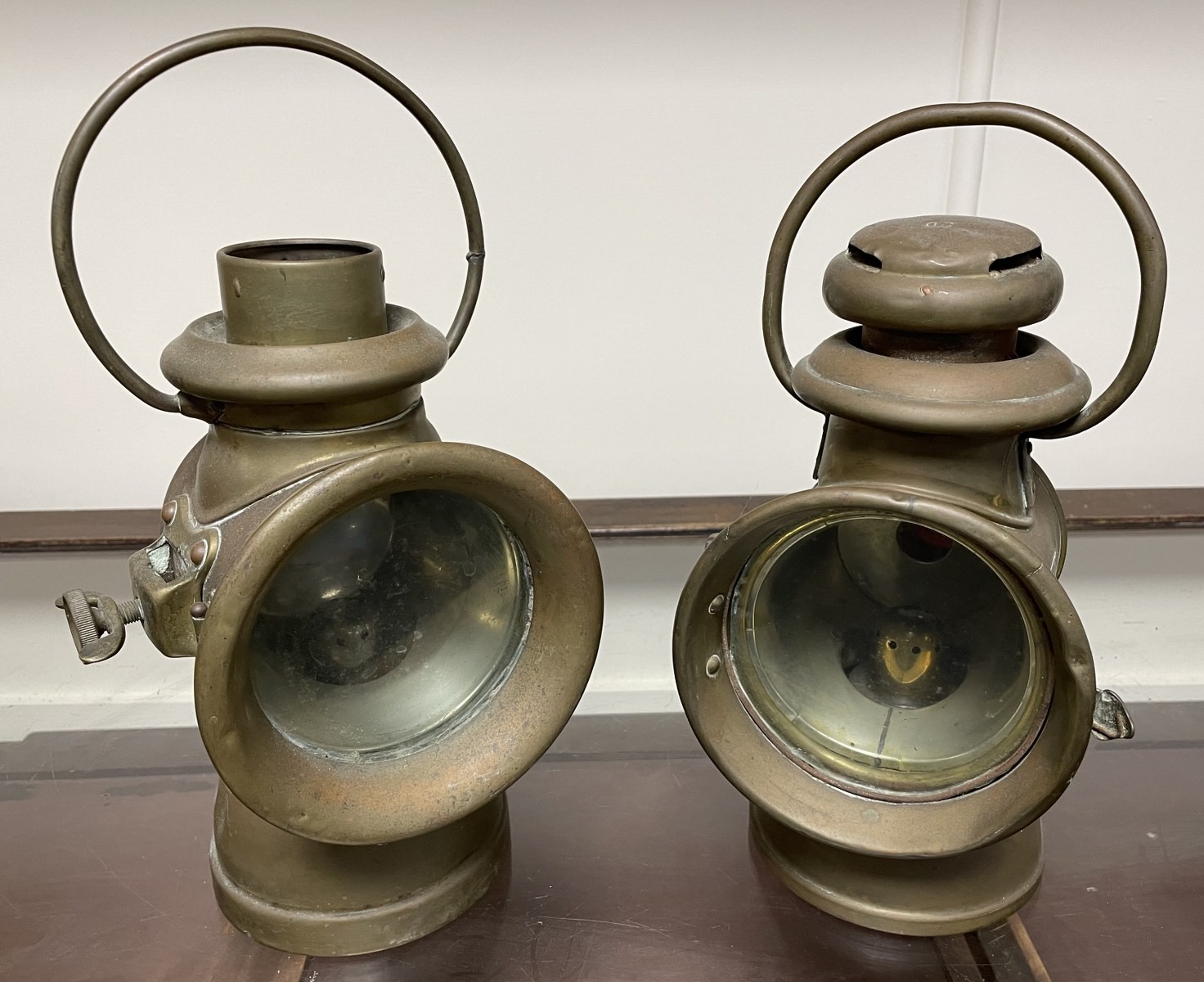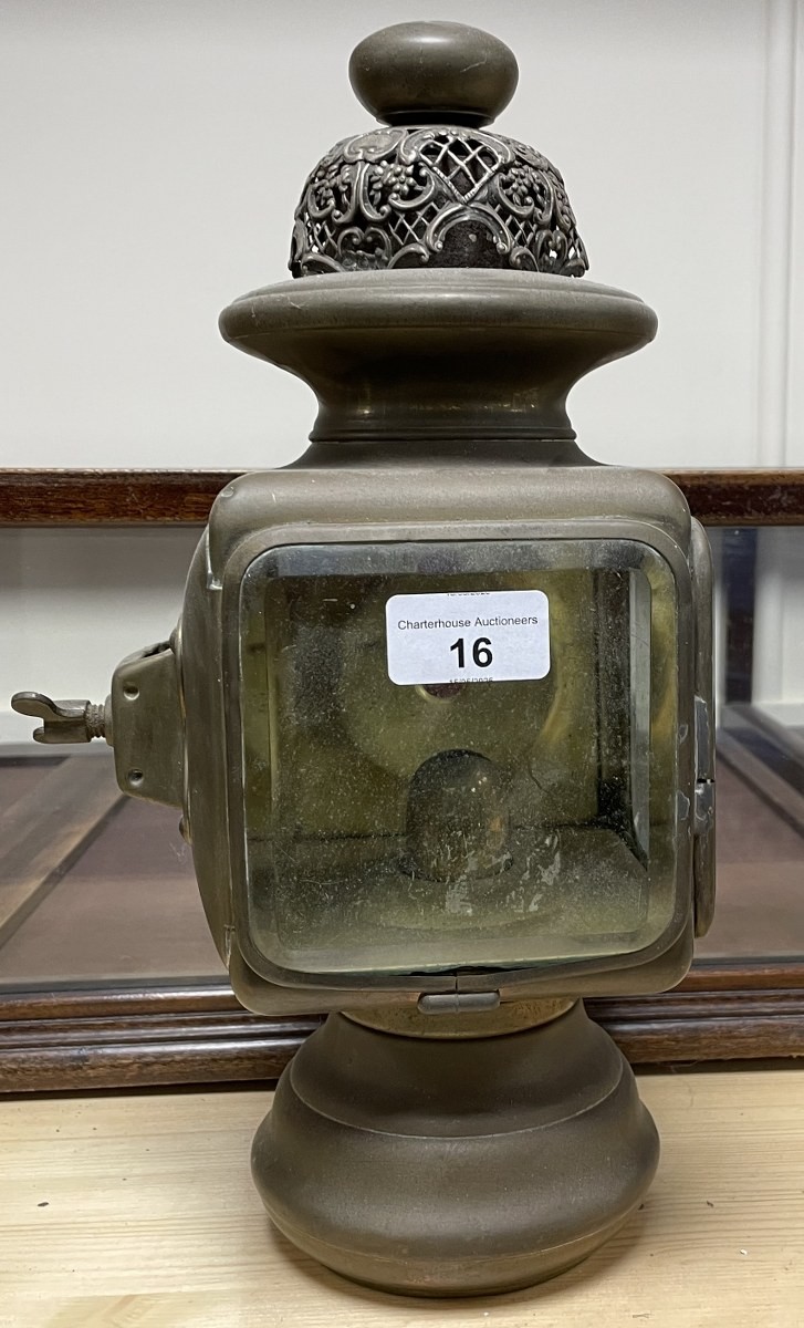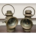 Two vintage brass car lamps, and another similar (3)