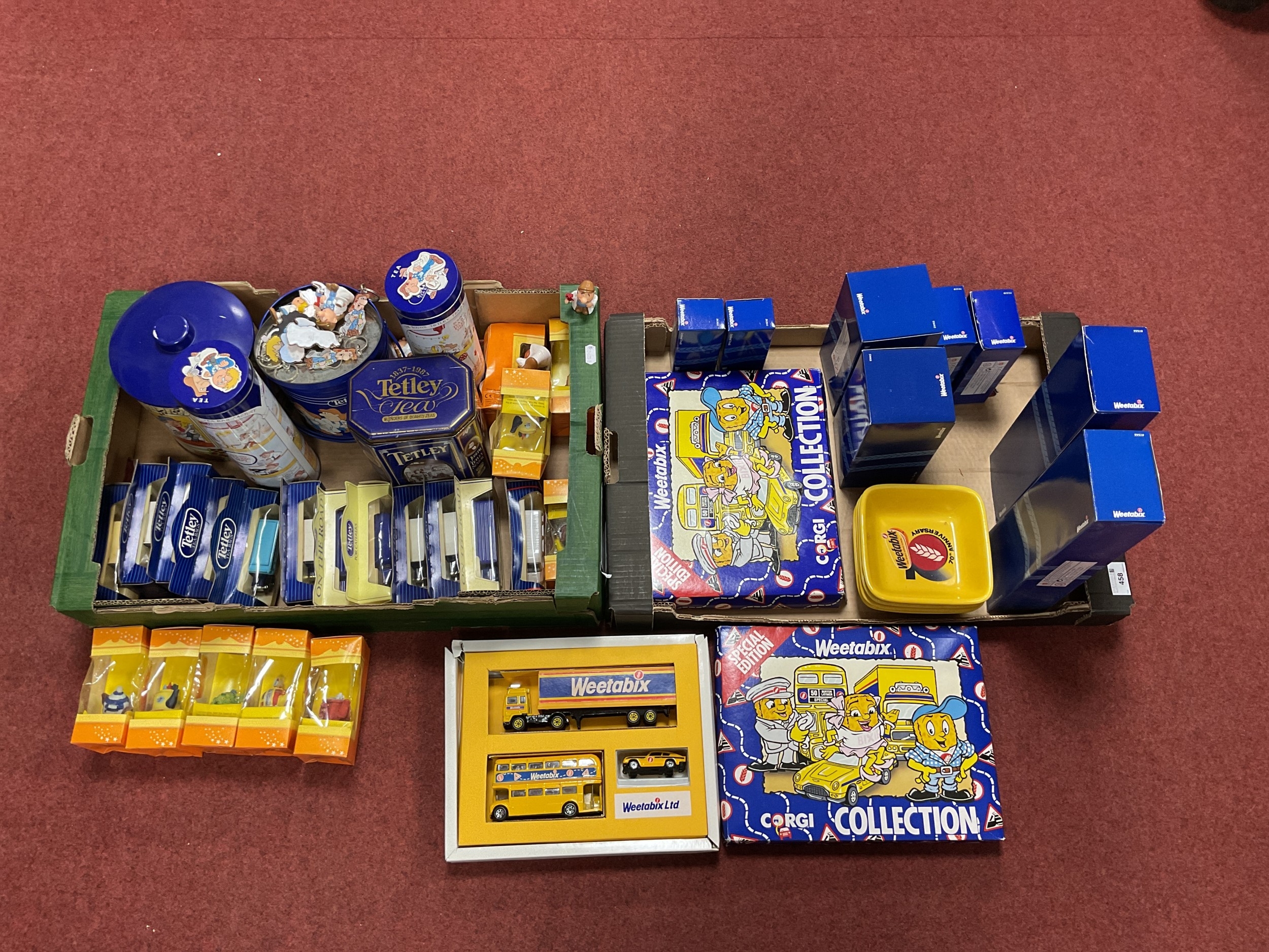 A Collection of Weetabix and Tetley Tea themed Diecast Model Vehicles by Corgi, Lledo. Together with Four Weetabix 70th Anniversary Cereal Bowls, Tetley Tea Folk Plastic Figures, Teaspoons, etc. (Two Boxes).