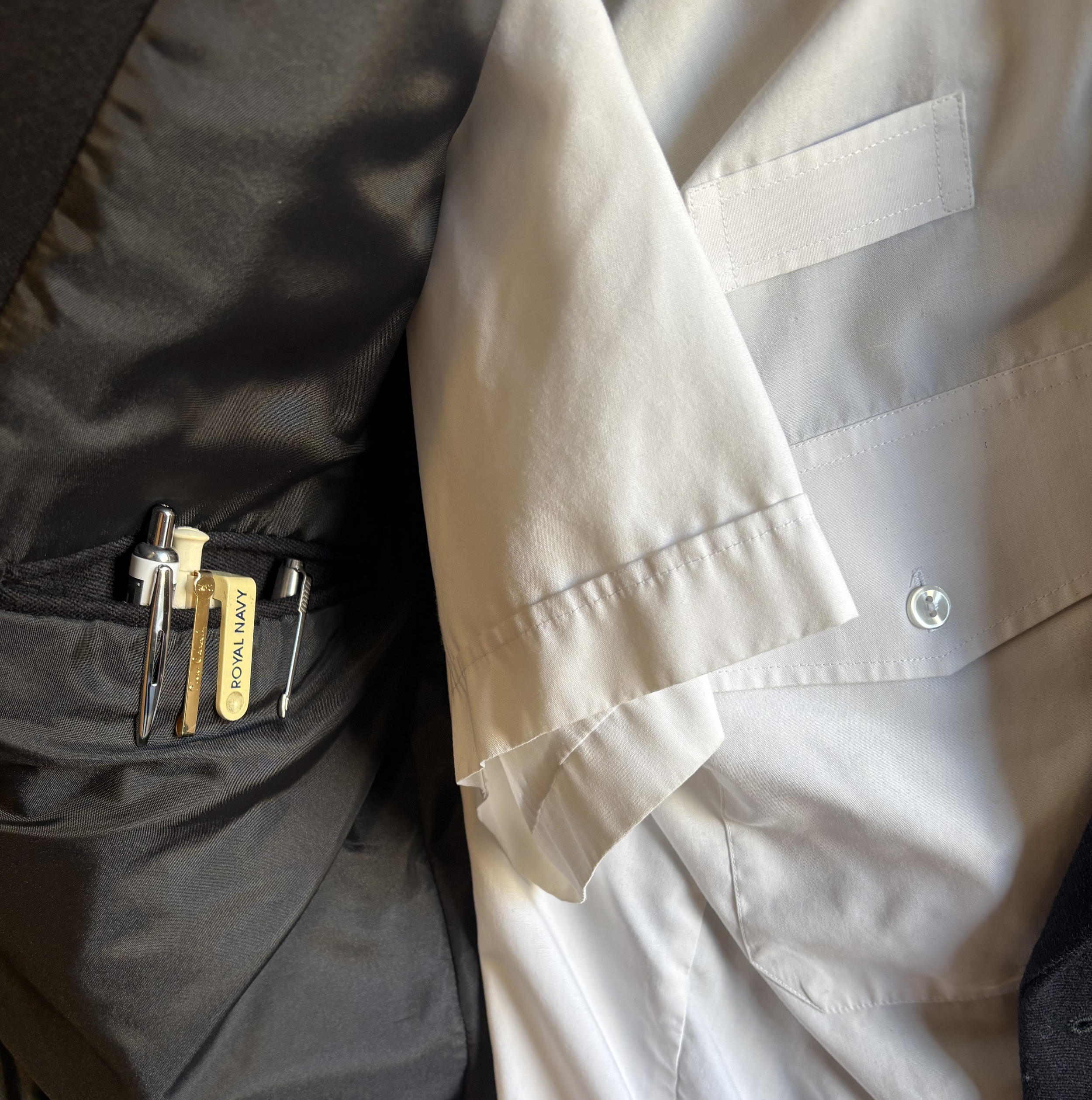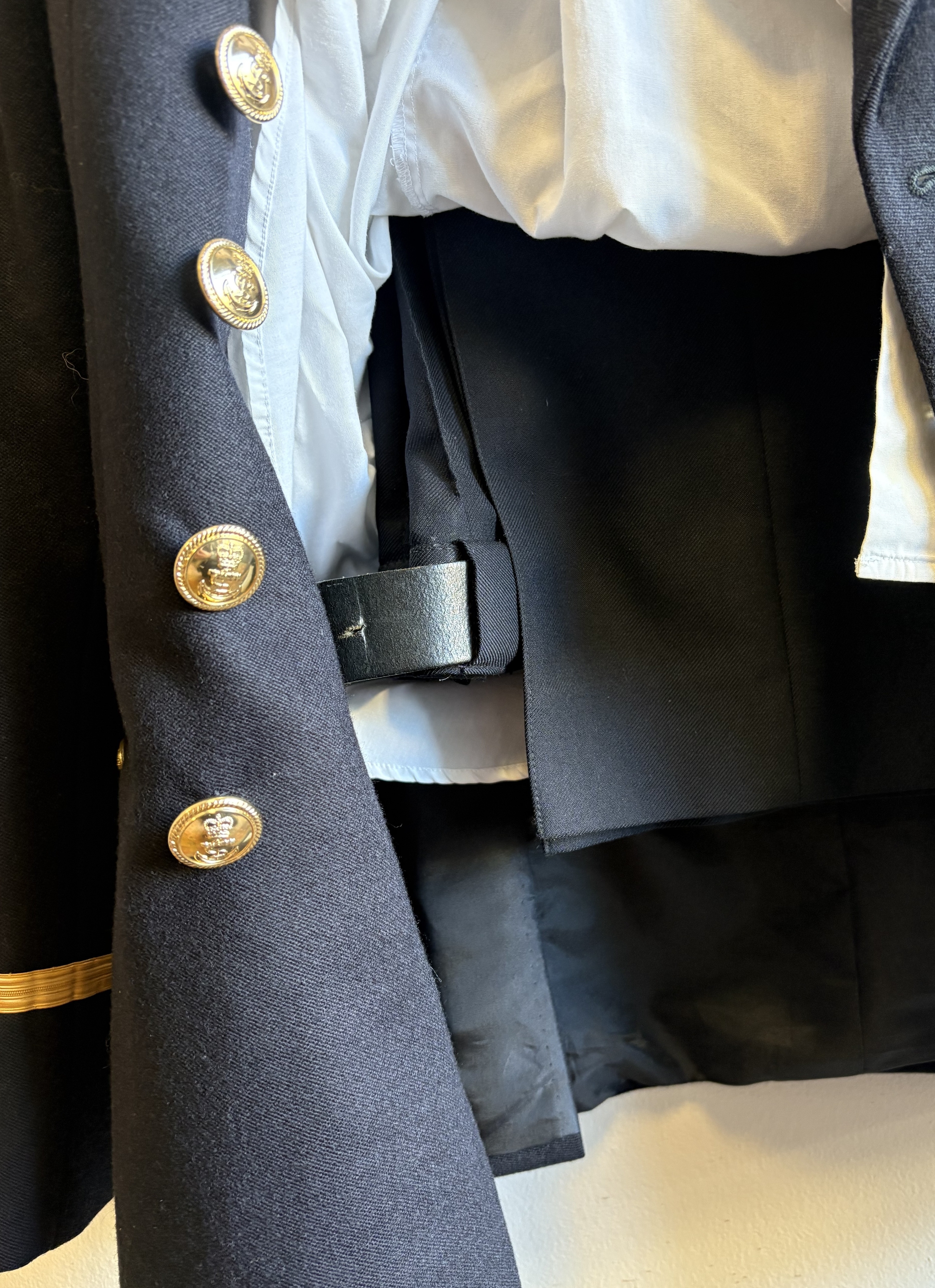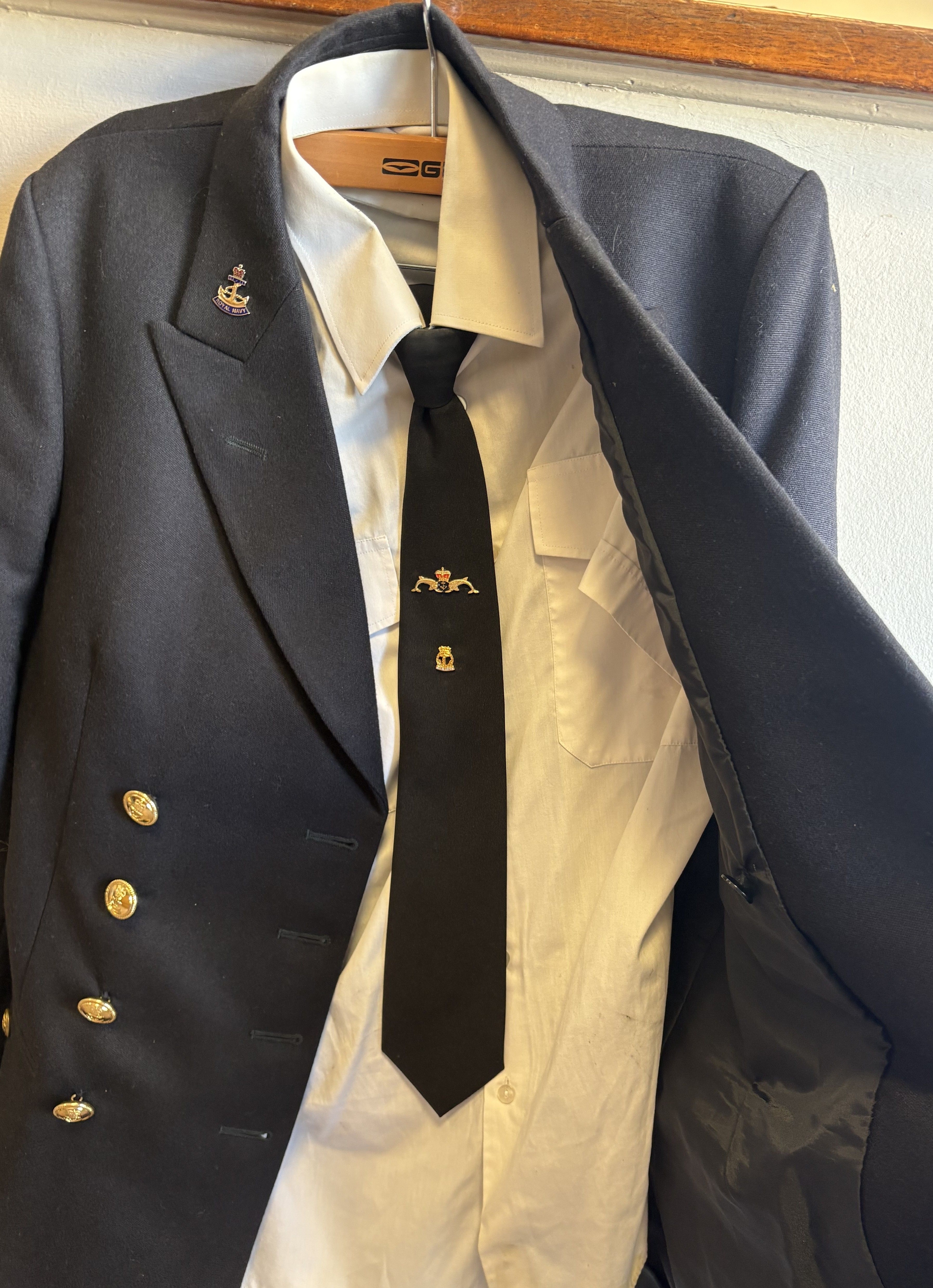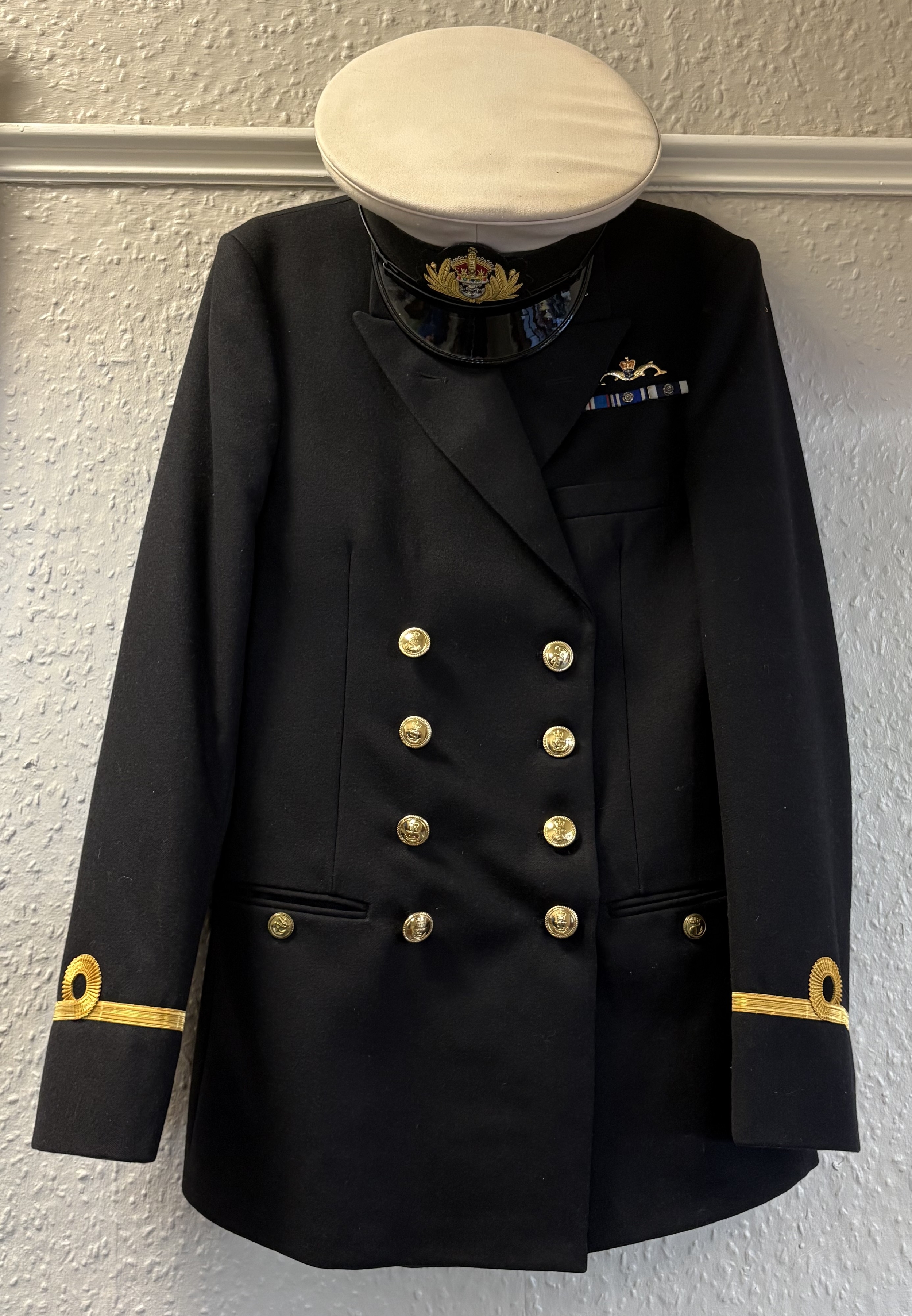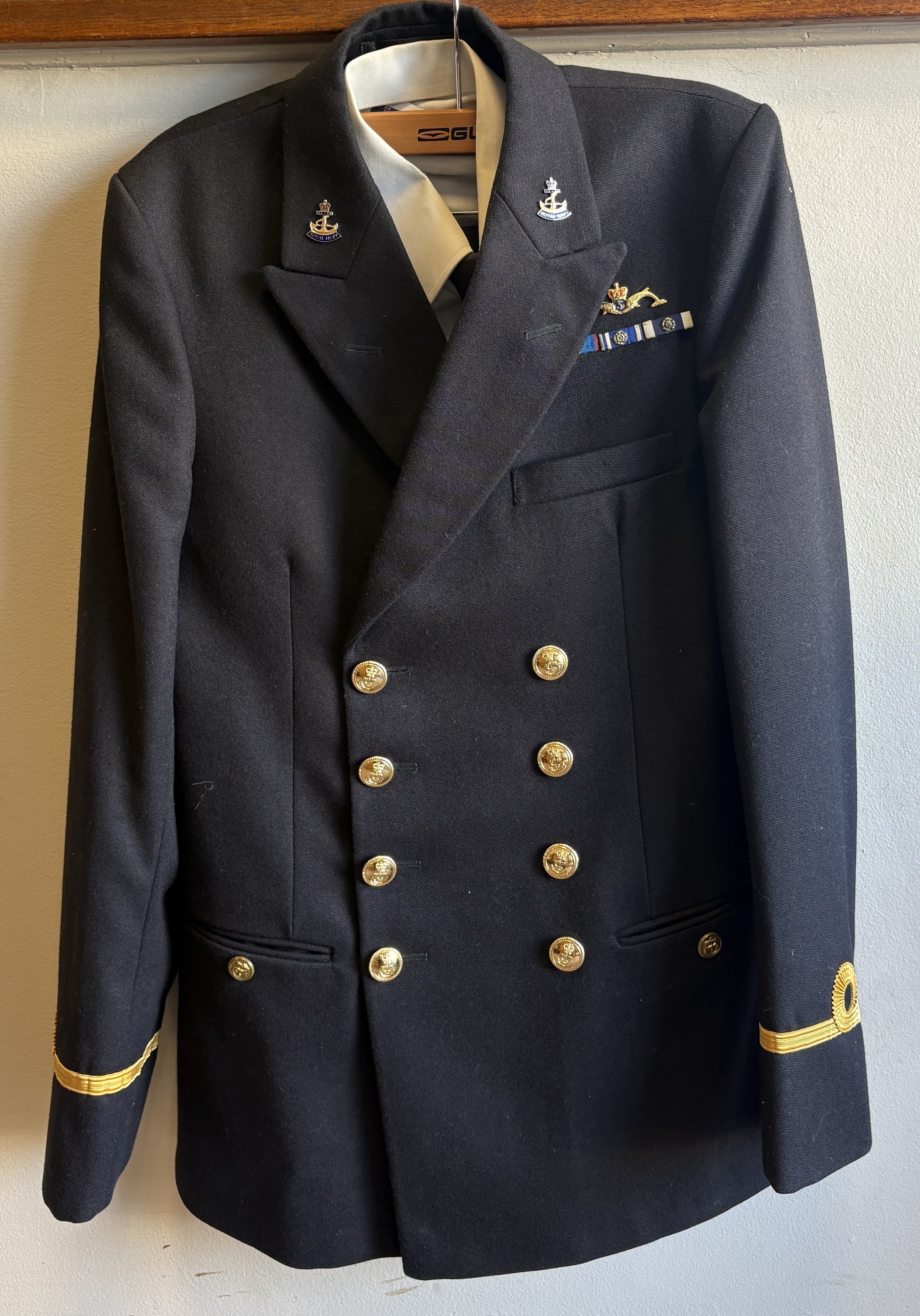 A Royal Navy Officer's dress uniform together with cap. Est. £20 - £30.