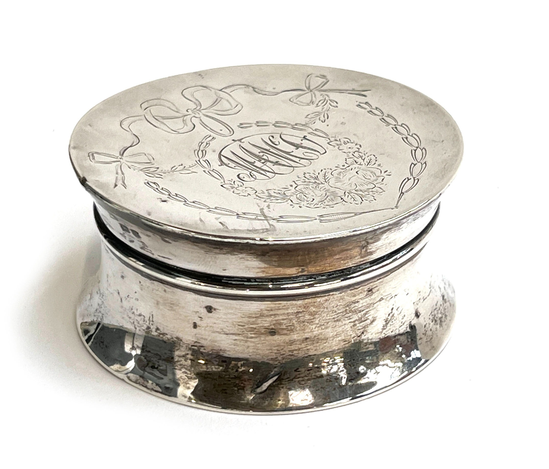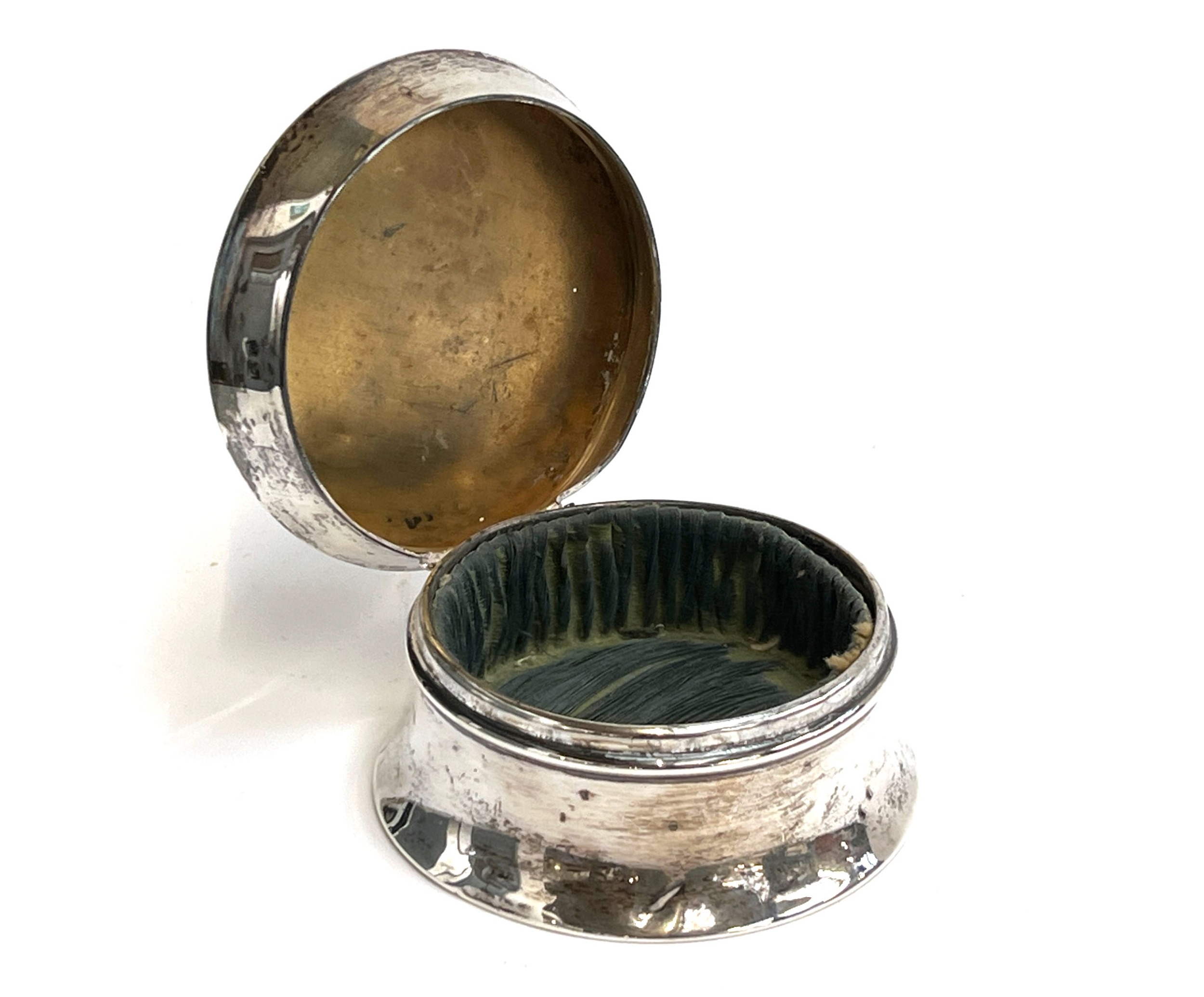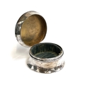 An early 20th century silver dressing table pot with loaded base, the engraved lid with monogram, 9cmD, gross weight 160g
