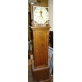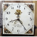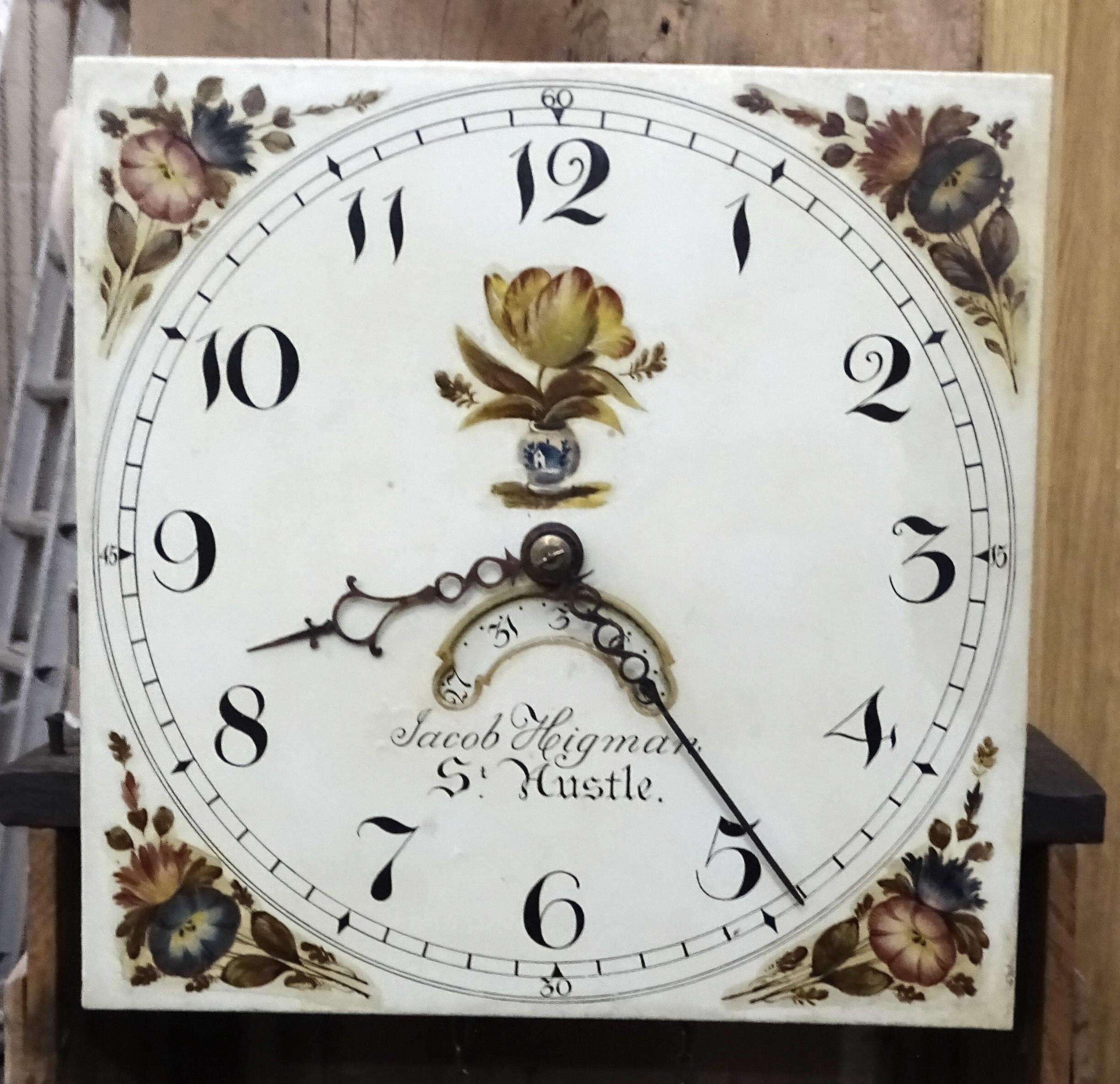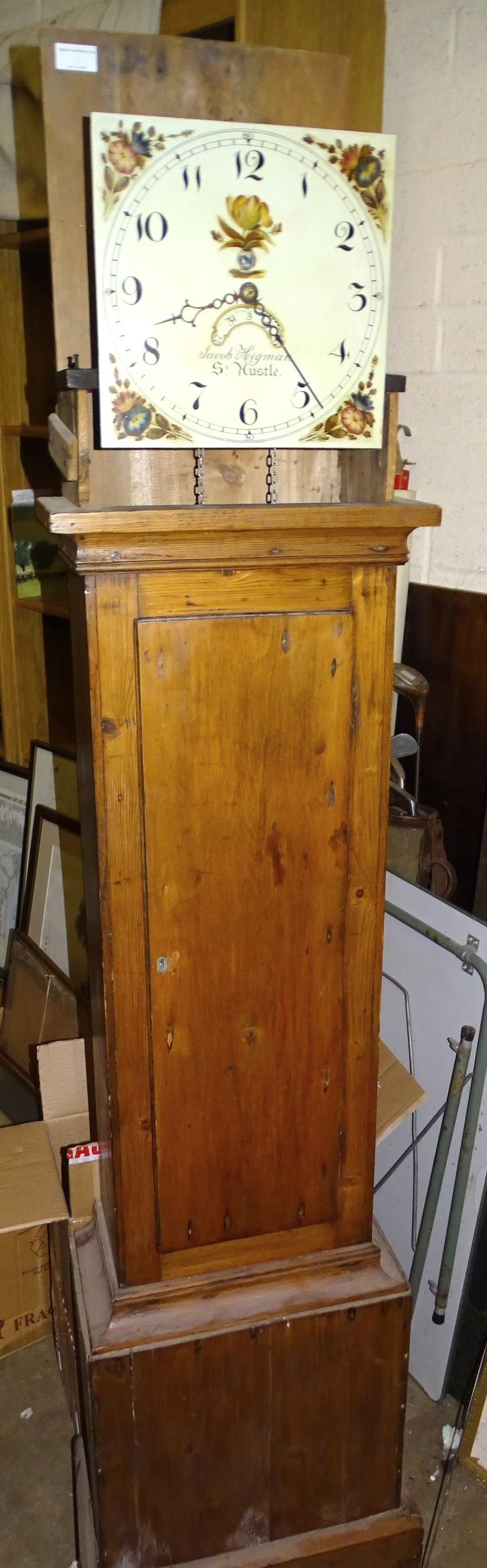A 19th century pine longcase clock, the face painted with floral sprays and named Jacob Higman, St Austle, 187.5cm high to top of backboard, (hood and key missing).