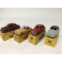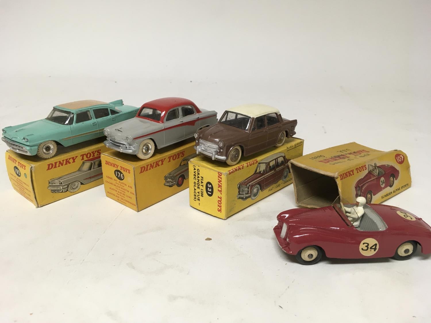 Dinky toys, #192 De Soto Fireflite sedan, #176 Austin A105 saloon and #107 Sunbeam Alpine sports, boxed