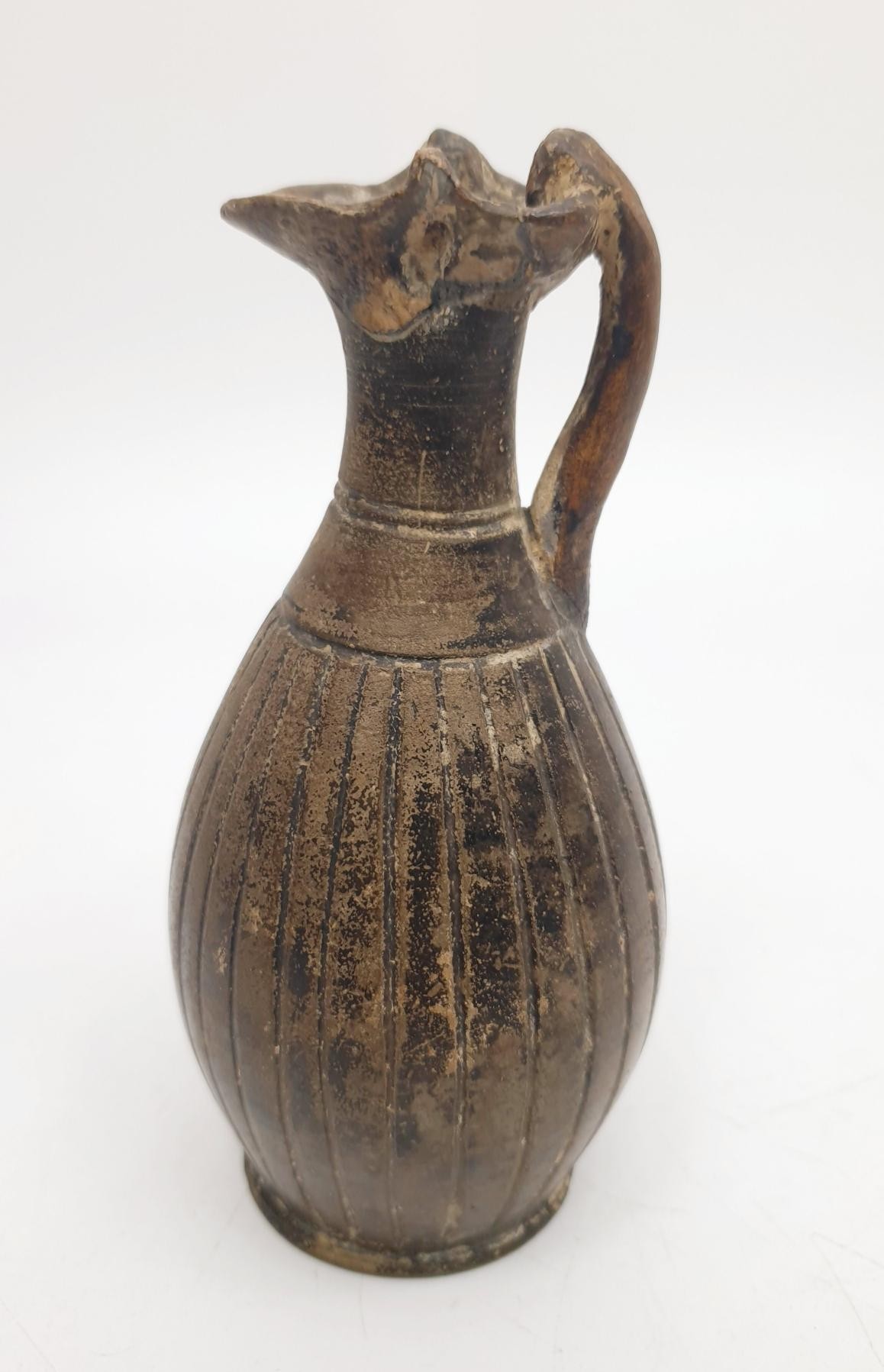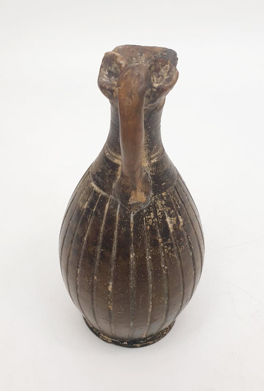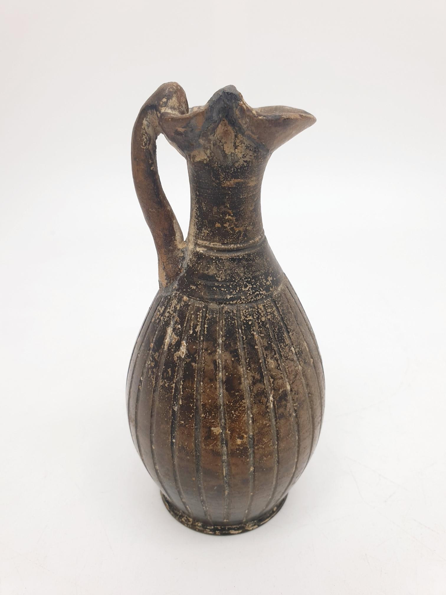 An ancient ceramic Apulian/Greek Oinochoe, having ribbed body and trefoil mouth, height 13cm. No shipping. Arrange collection or your own packer and shipper, please. Electricals are sold as scrap.