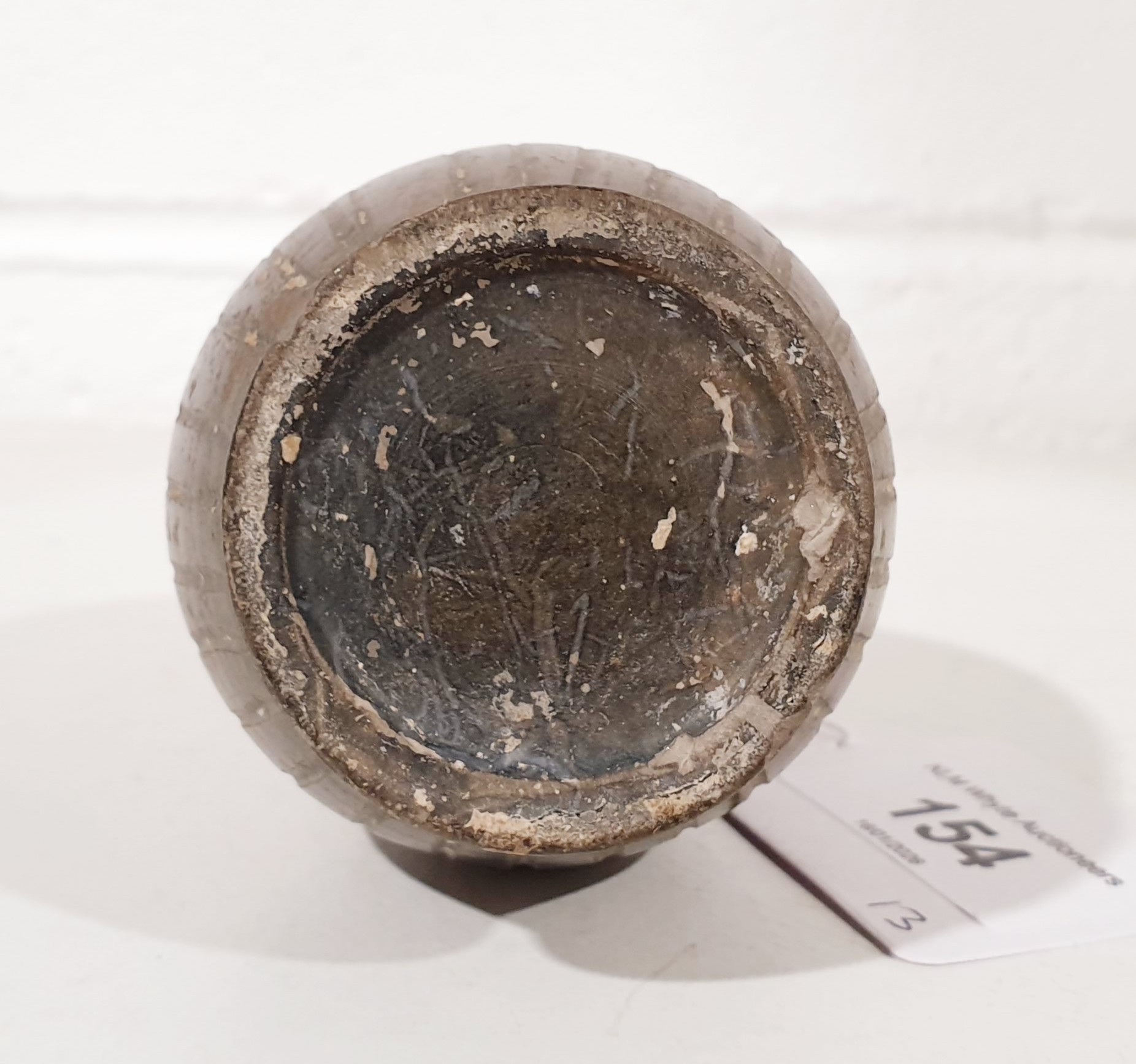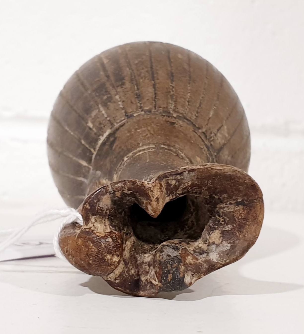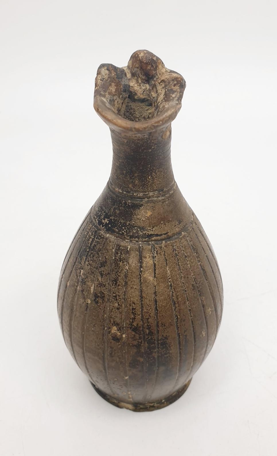 An ancient ceramic Apulian/Greek Oinochoe, having ribbed body and trefoil mouth, height 13cm. No shipping. Arrange collection or your own packer and shipper, please. Electricals are sold as scrap.