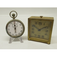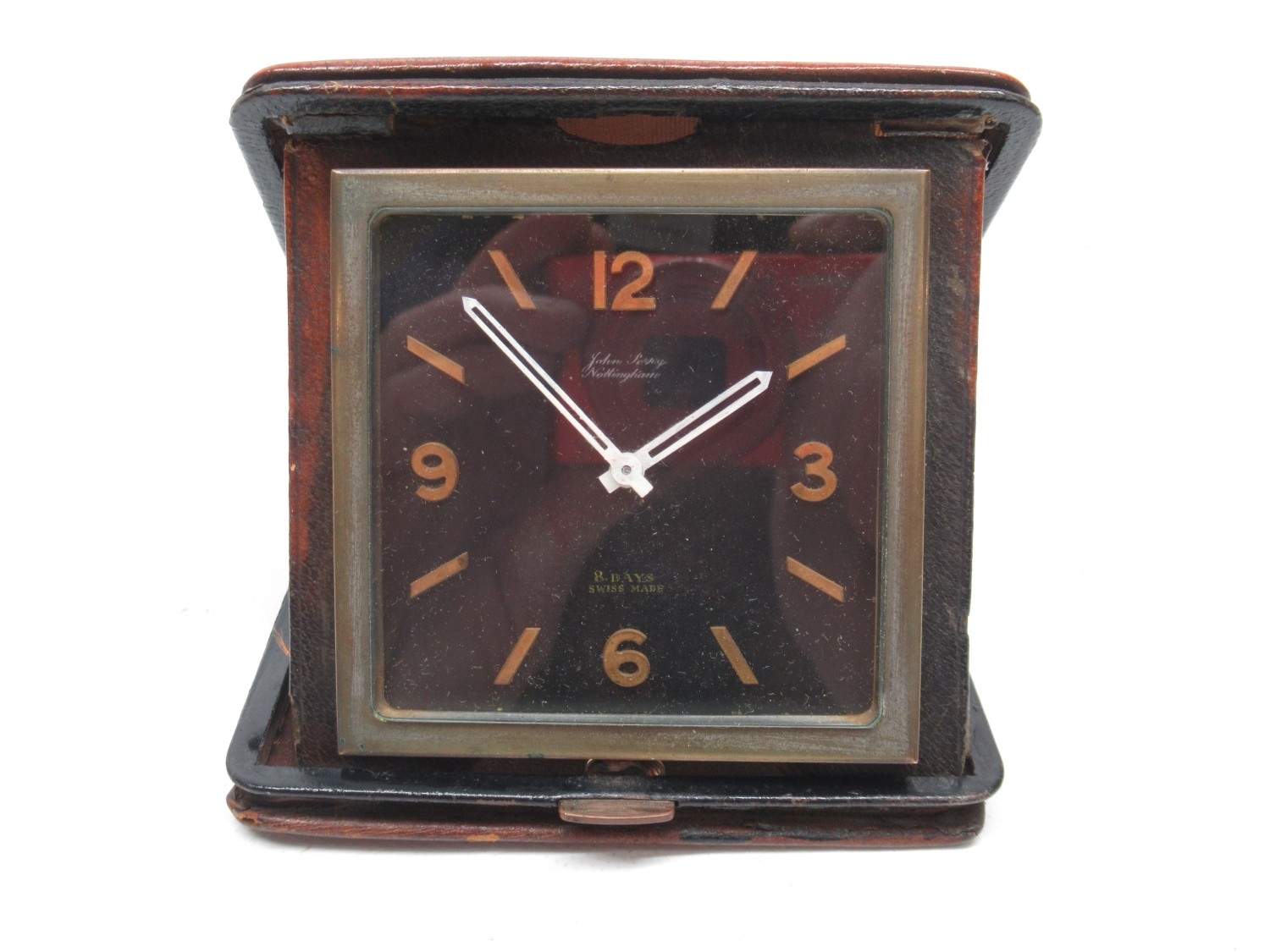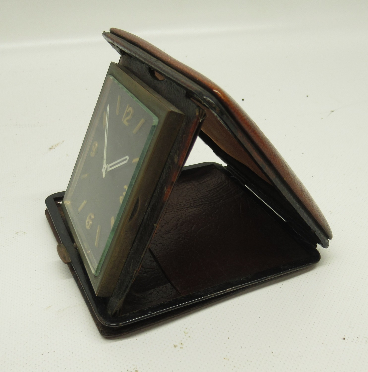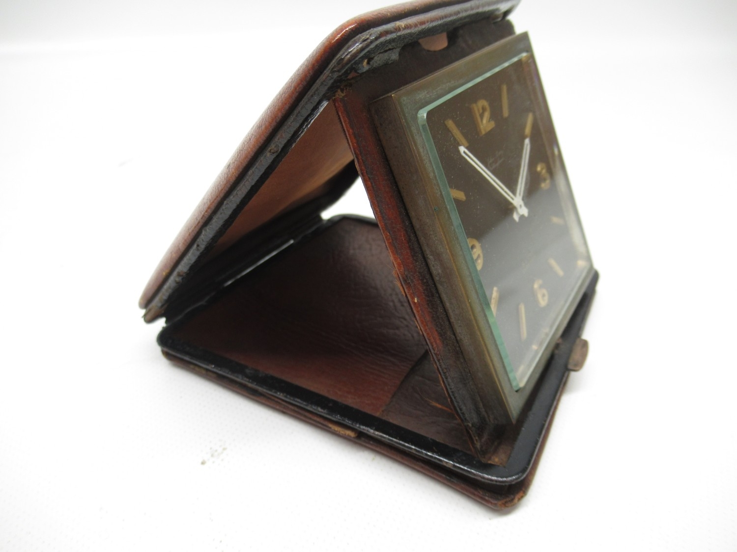 Travel clock runs intermittently, case worn requiring attention, as does the hinge, other age related wear.