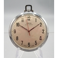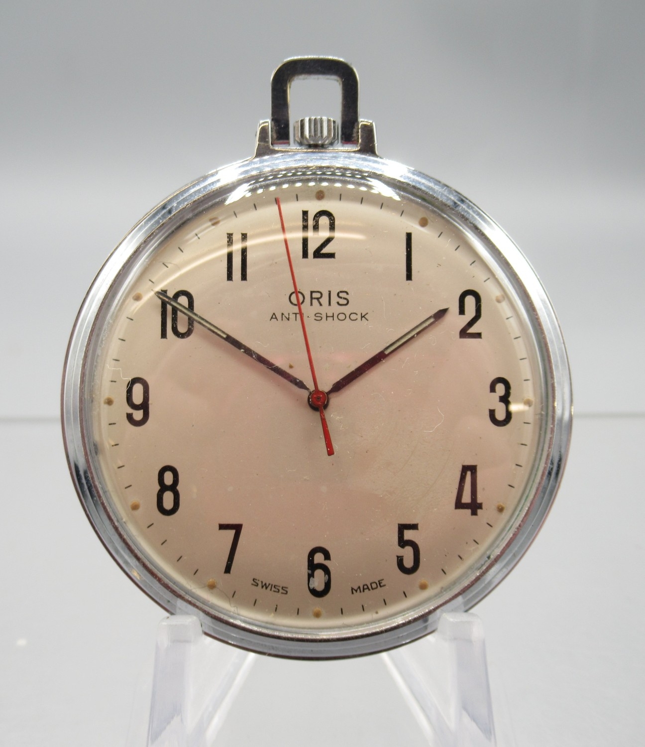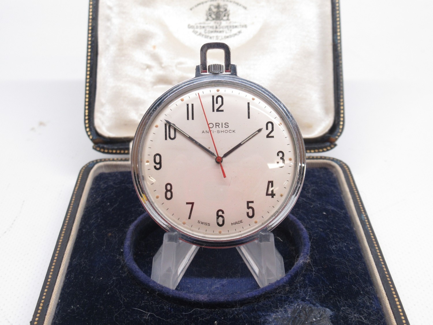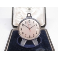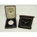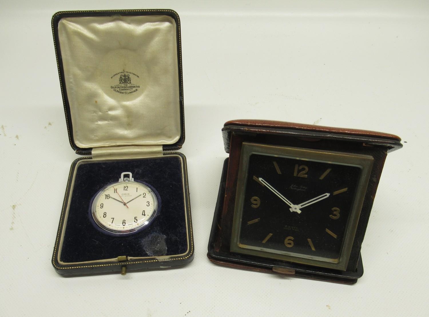 Oris chrome keyless pocket watch, signed silver Arabic dial with centre seconds, signed snap on case back, Oris 652 KIF 7 jewel movement, D47.6mm and Swiss 8 day leather case travel clock retailed by John Perry Nottingham, H11cm
