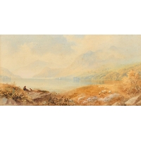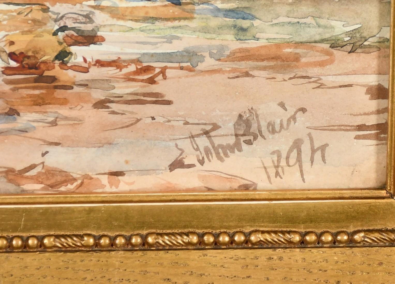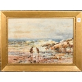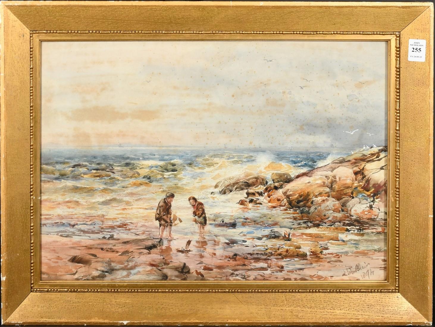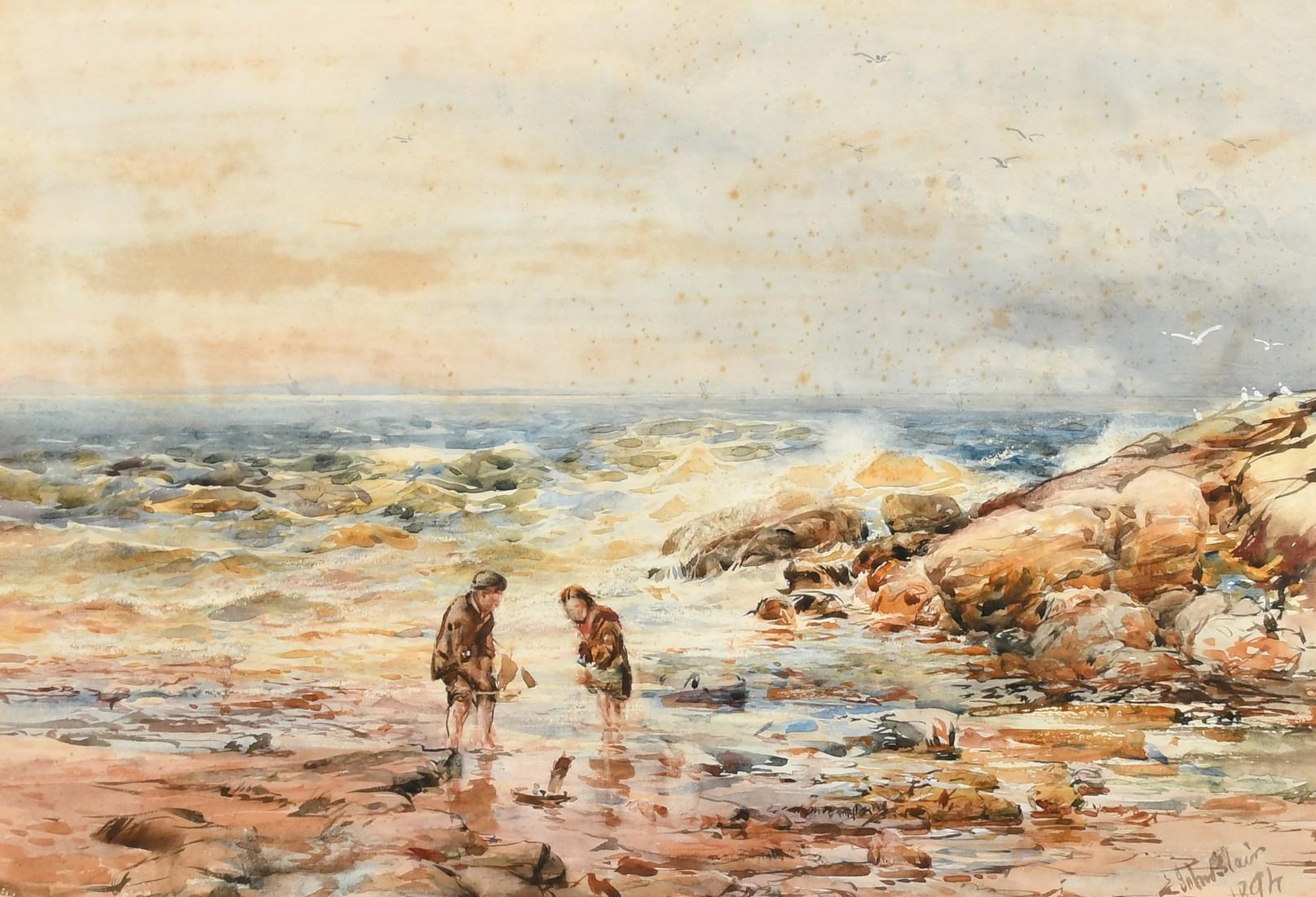 John Blair (fl.1885-1888), A rugged coastal scene with two children playing with toy boats, watercolour, signed and dated 1894, 13.5" x 19.5", (34x49.5cm).
