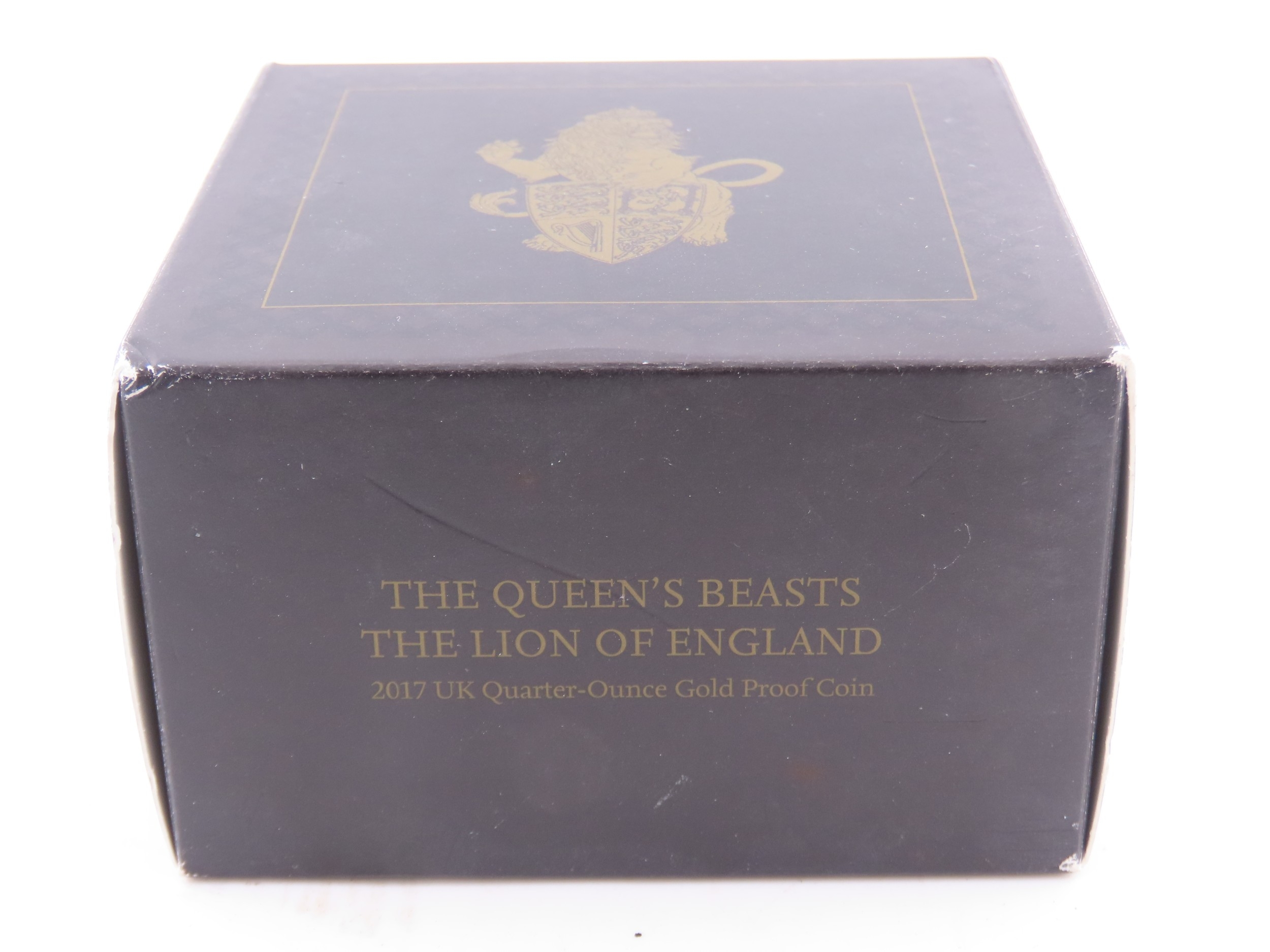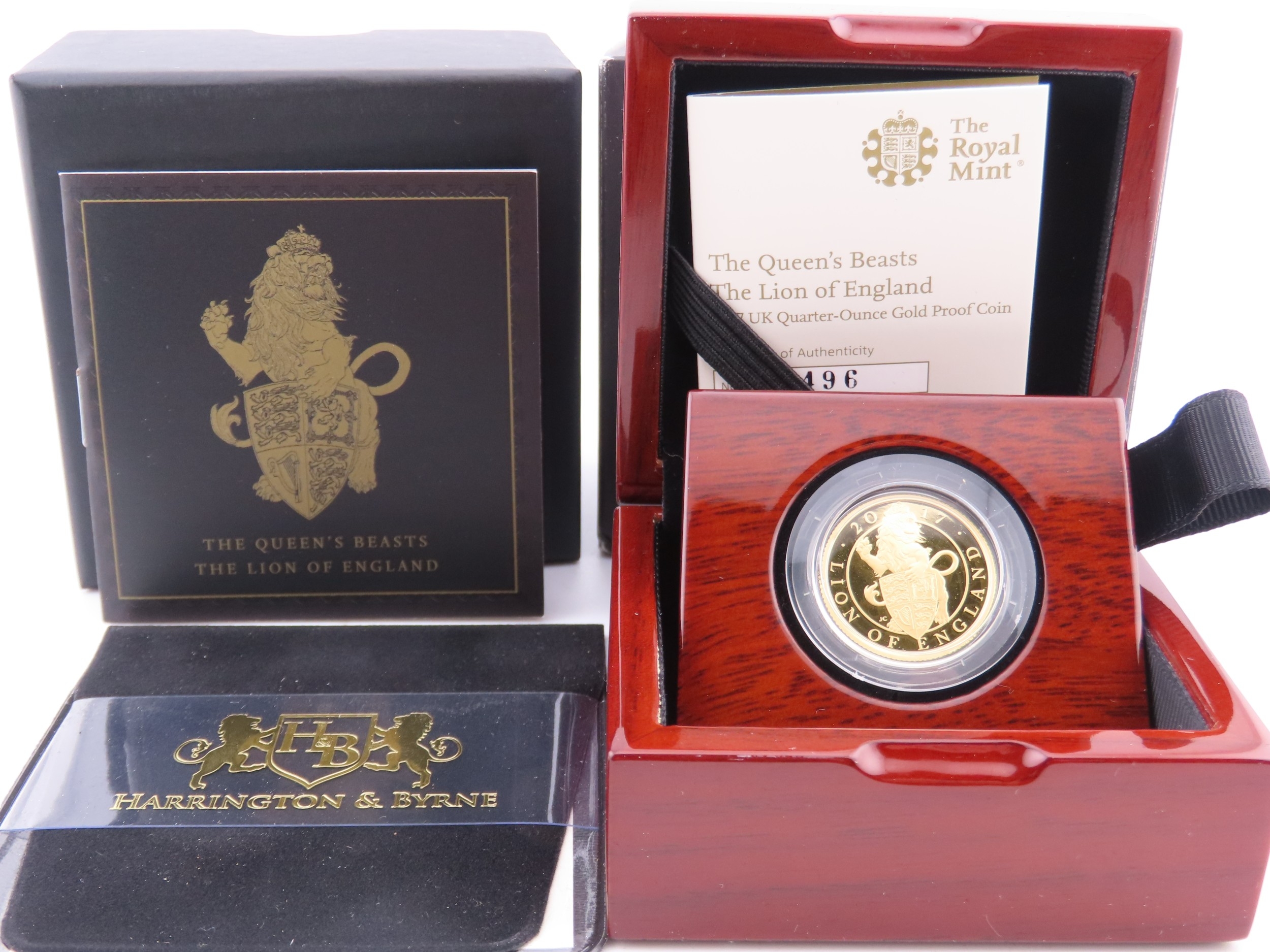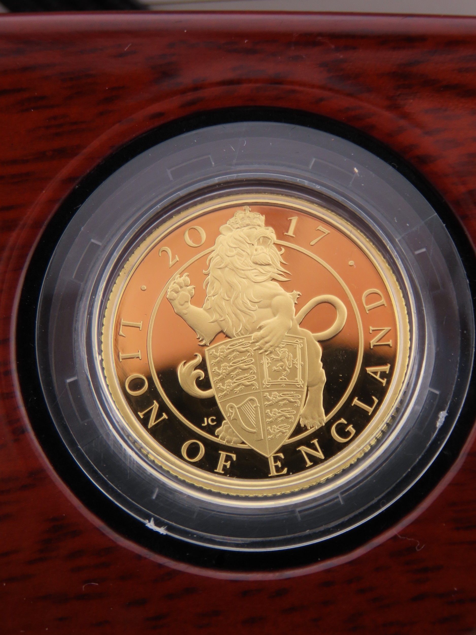 The Royal Mint Queens Beasts The Lion of England gold proof coin. A United Kingdom 25 pound gold proof coin from The Royal Mint Queen?s Beasts series, The Lion of England. Struck in 999.9 fine gold, weighing 7.80 grams and measuring 22.00 millimetres in diameter. Issued in proof quality with a maximum coin mintage of 2,500. Presented in the original Royal Mint wooden presentation case with outer packaging and certificate of authenticity.