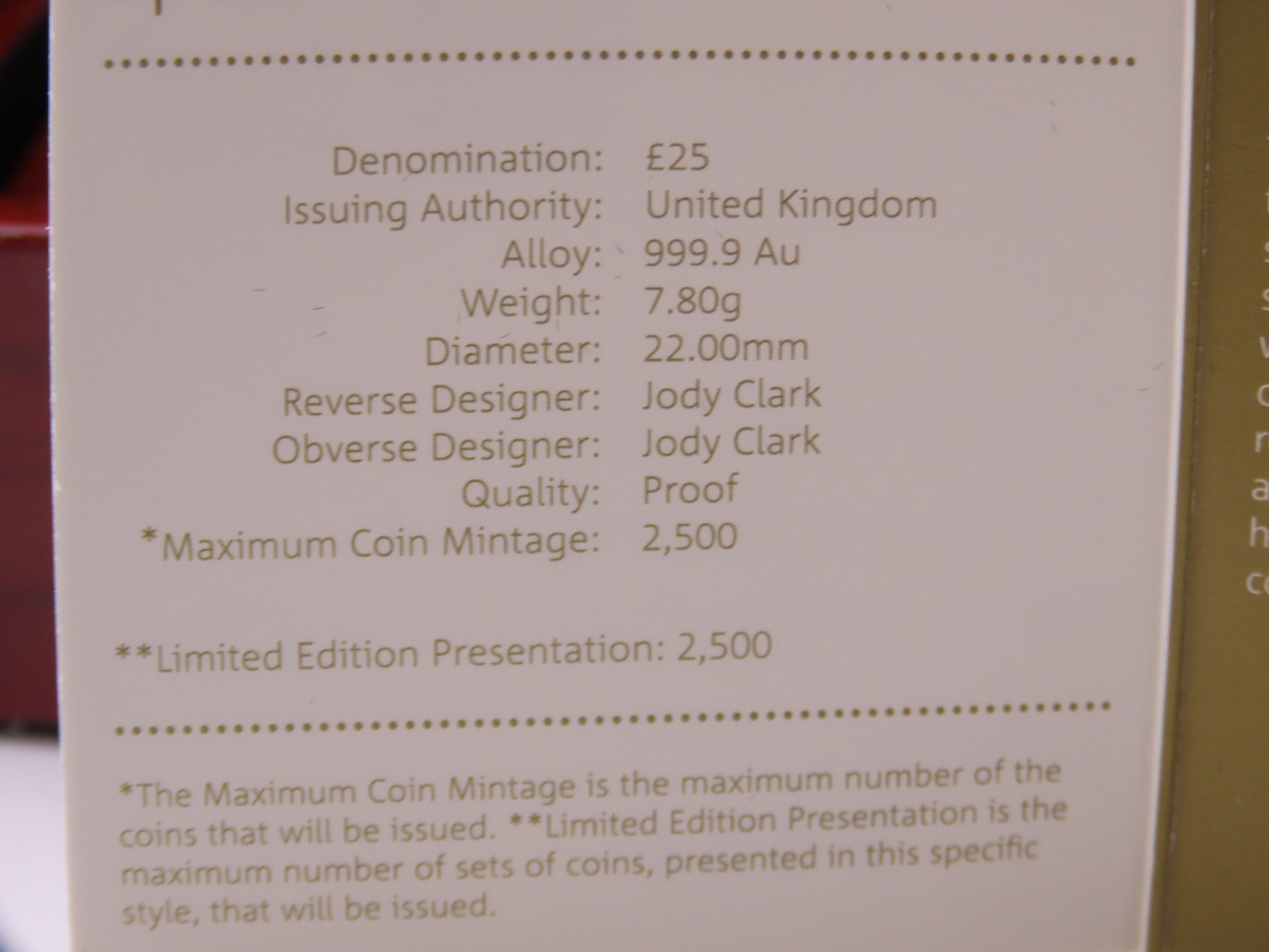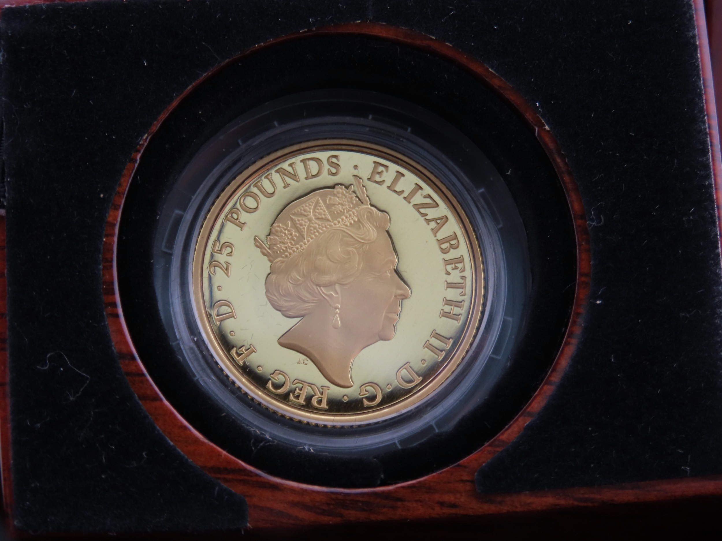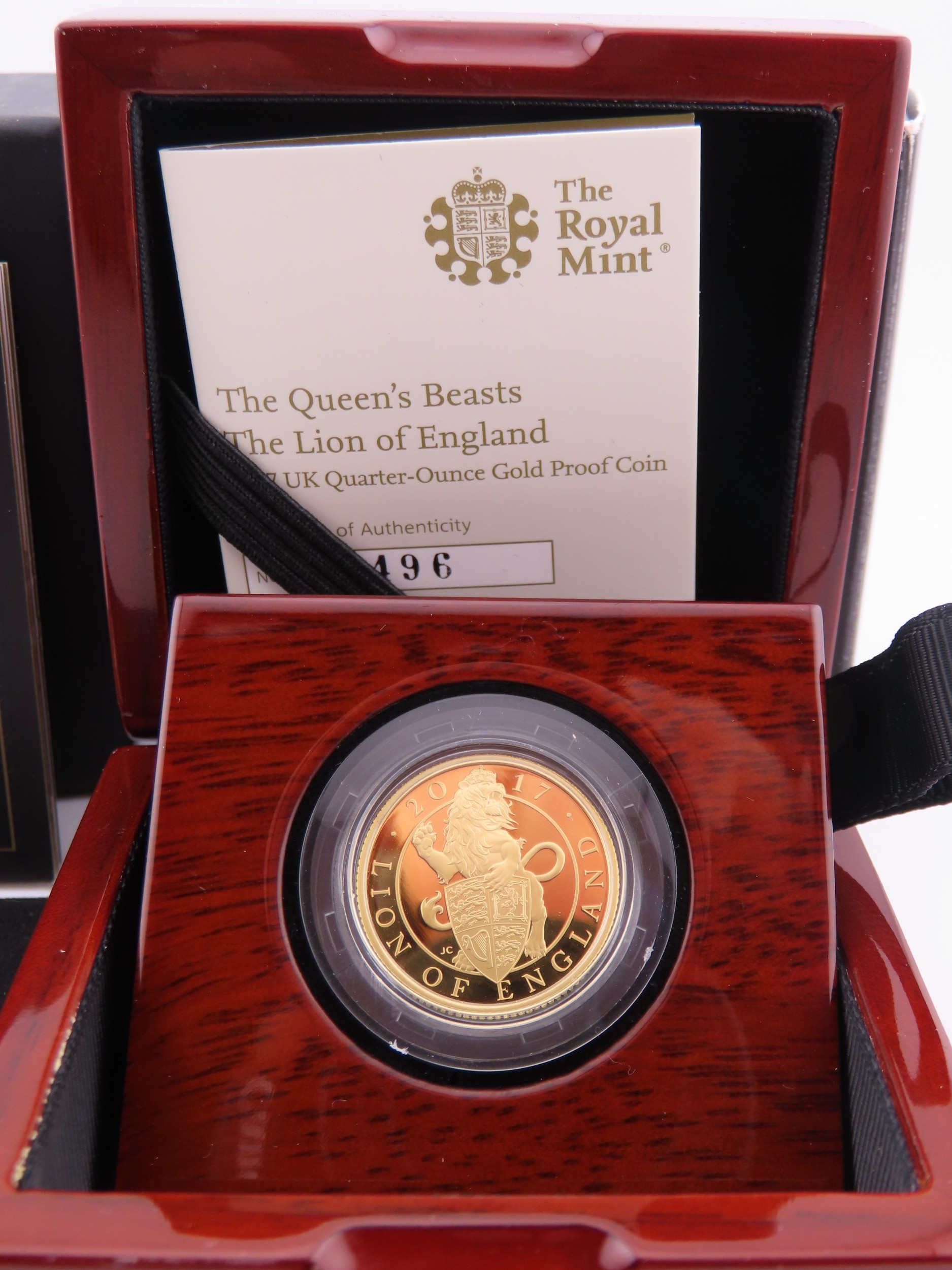 The Royal Mint Queens Beasts The Lion of England gold proof coin. A United Kingdom 25 pound gold proof coin from The Royal Mint Queen?s Beasts series, The Lion of England. Struck in 999.9 fine gold, weighing 7.80 grams and measuring 22.00 millimetres in diameter. Issued in proof quality with a maximum coin mintage of 2,500. Presented in the original Royal Mint wooden presentation case with outer packaging and certificate of authenticity.