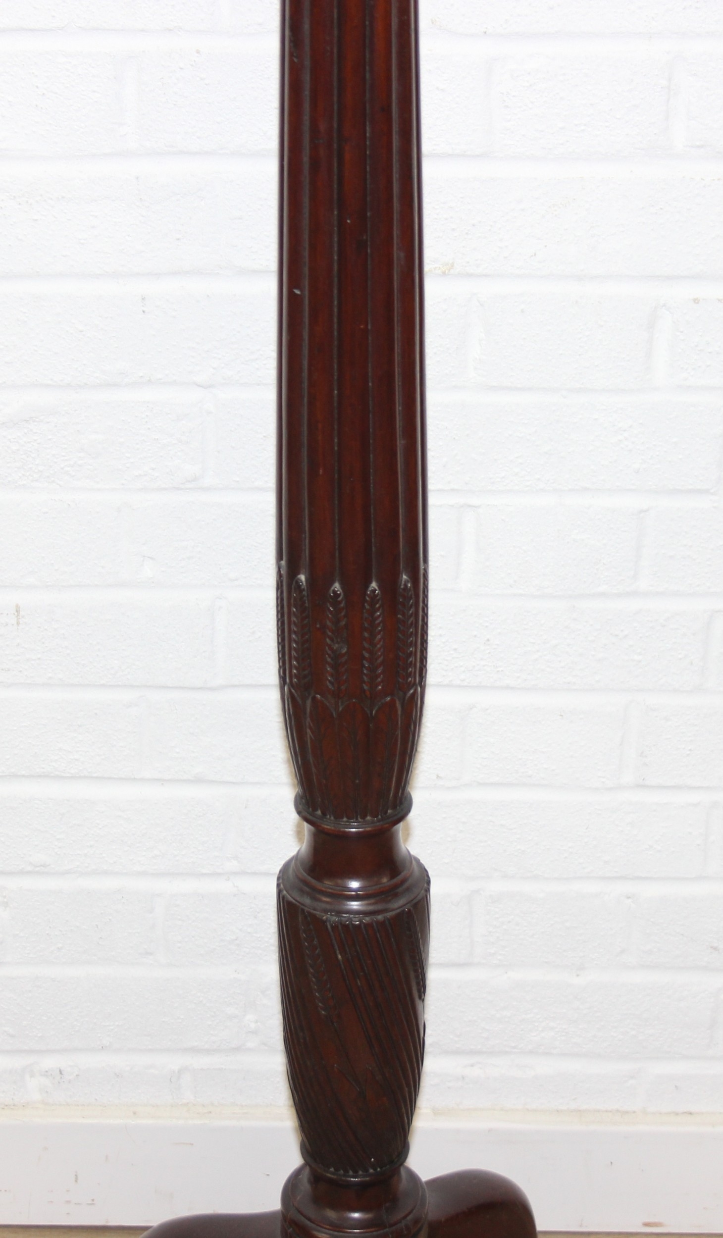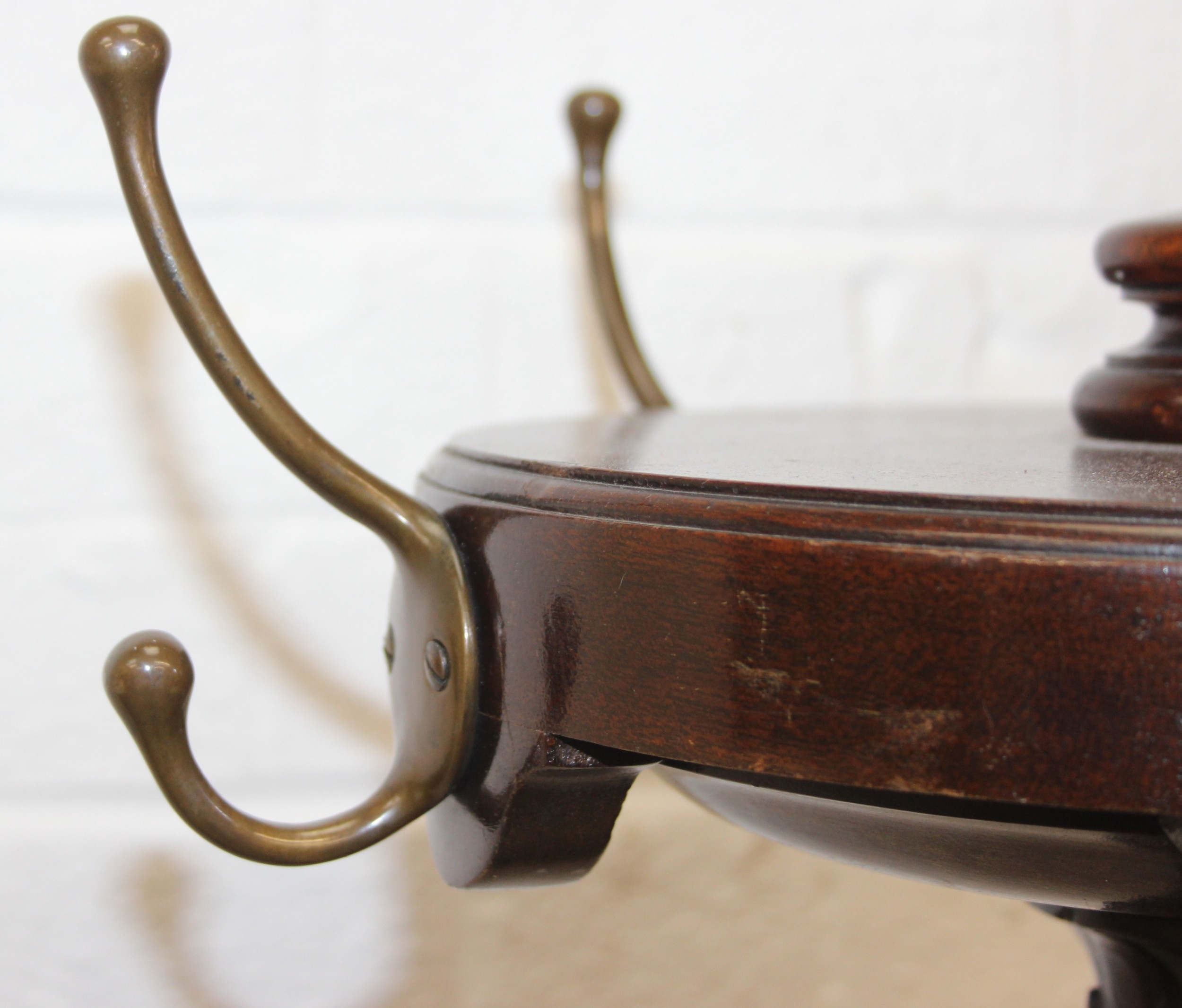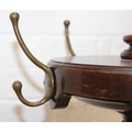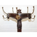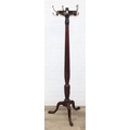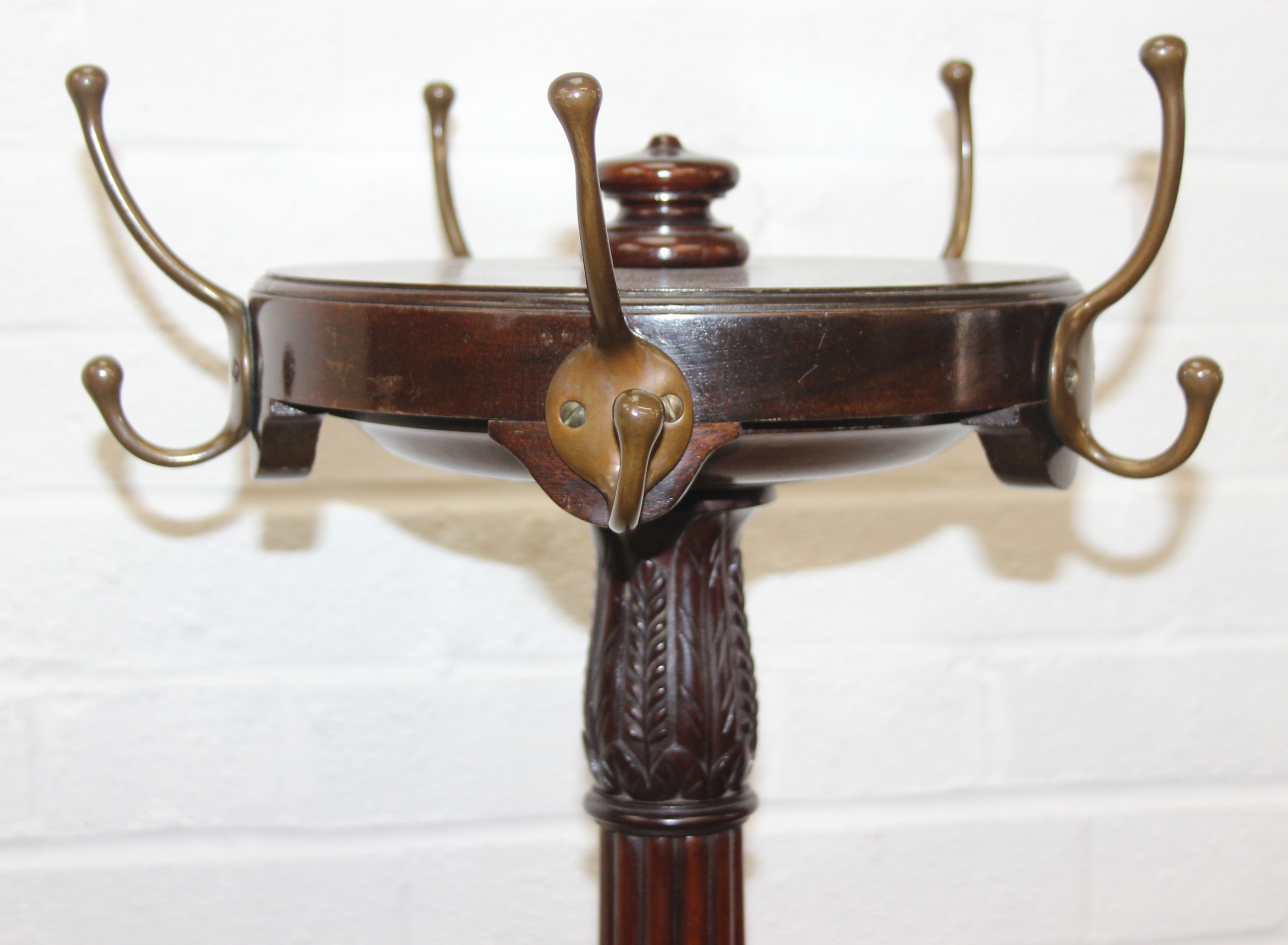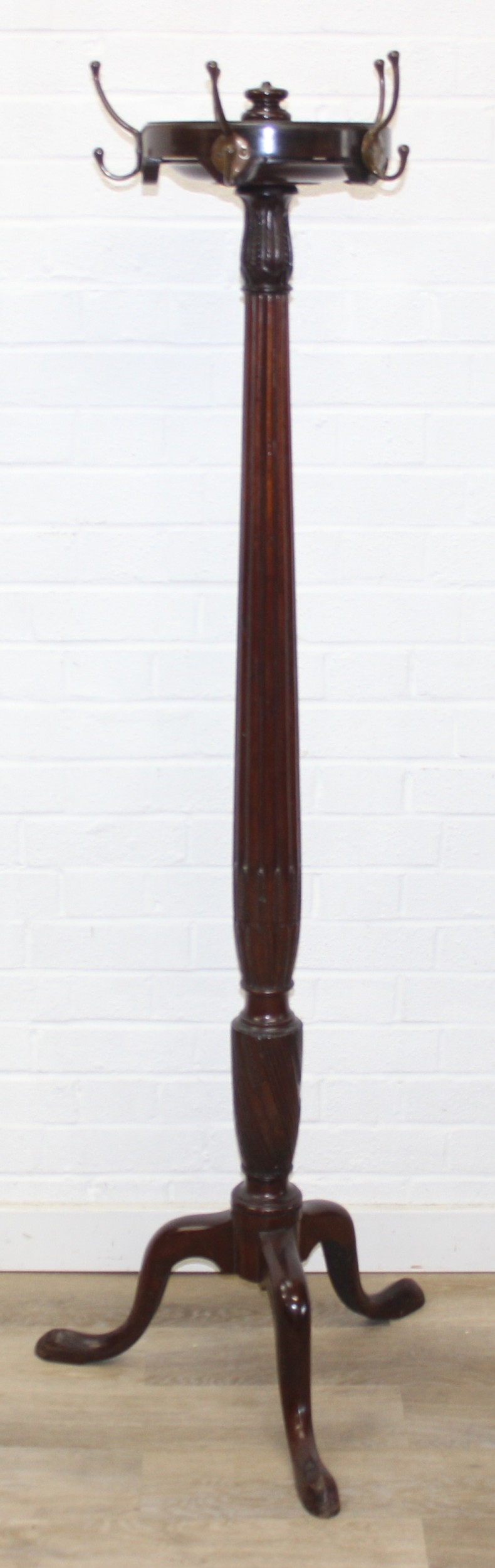 An antique mahogany coat stand with reeded pillar and carved with wheat sheaths, five brass hooks and tripod base with pad feet, 162cm tall