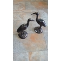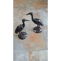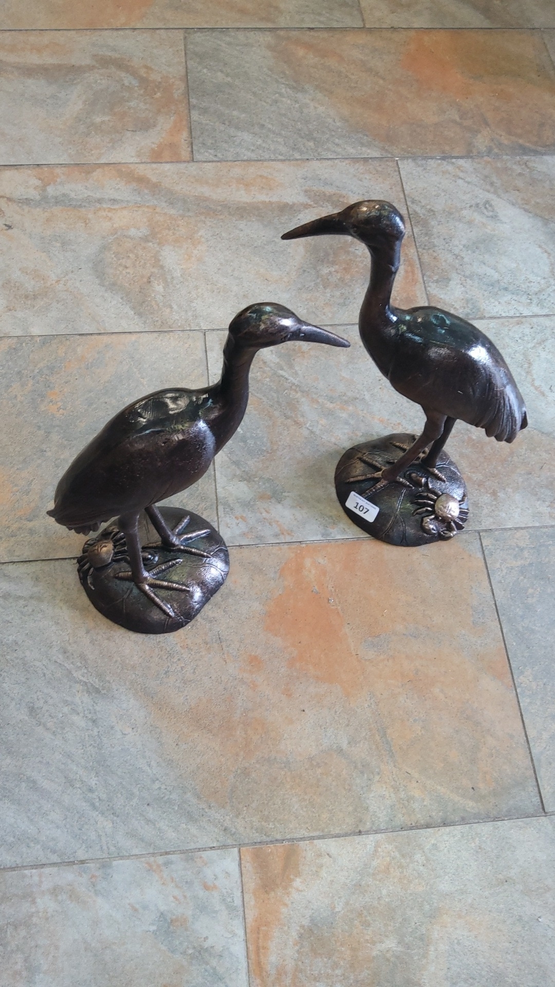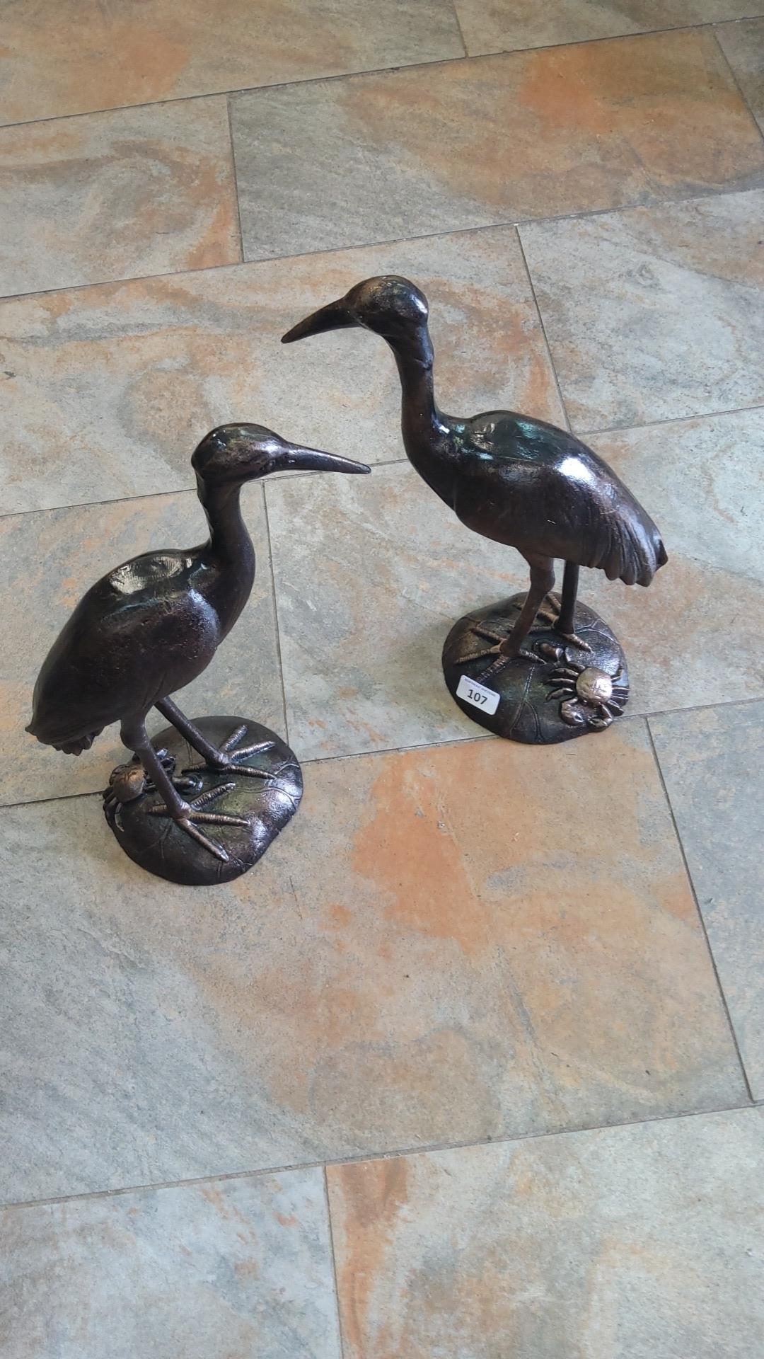 A pair of cast iron herons, mounted on textured oval bases with applied crab and reed motifs, the surfaces in a dark patinated finish.(16" tall)