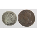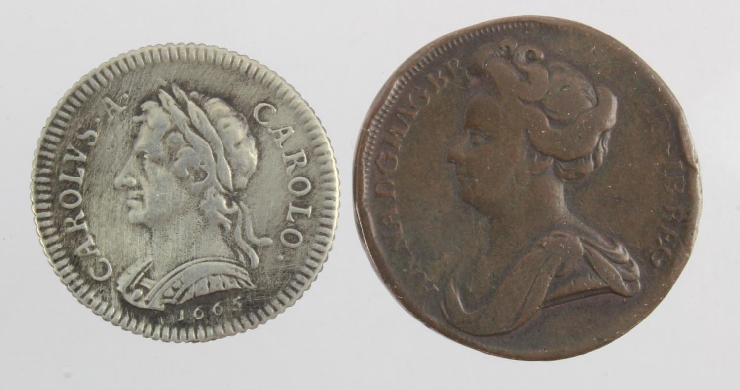 Patterns (2?): Queen Anne copper Halfpenny, Peck #731 (re-strike 1737-1745) aF, edge knocks; along with a what seems to be a Charles II silver Farthing 1665 straight grained edge as Peck 407, but this is probably a modern cast copy.