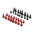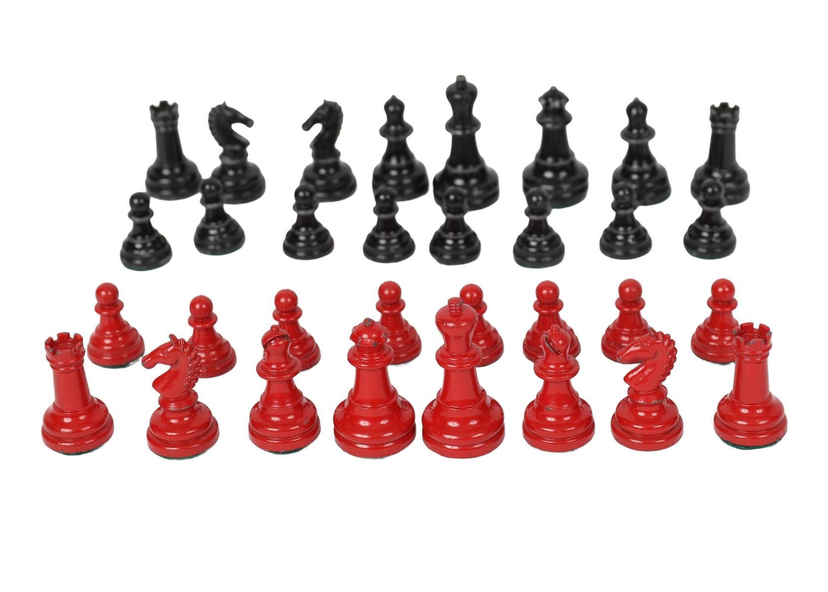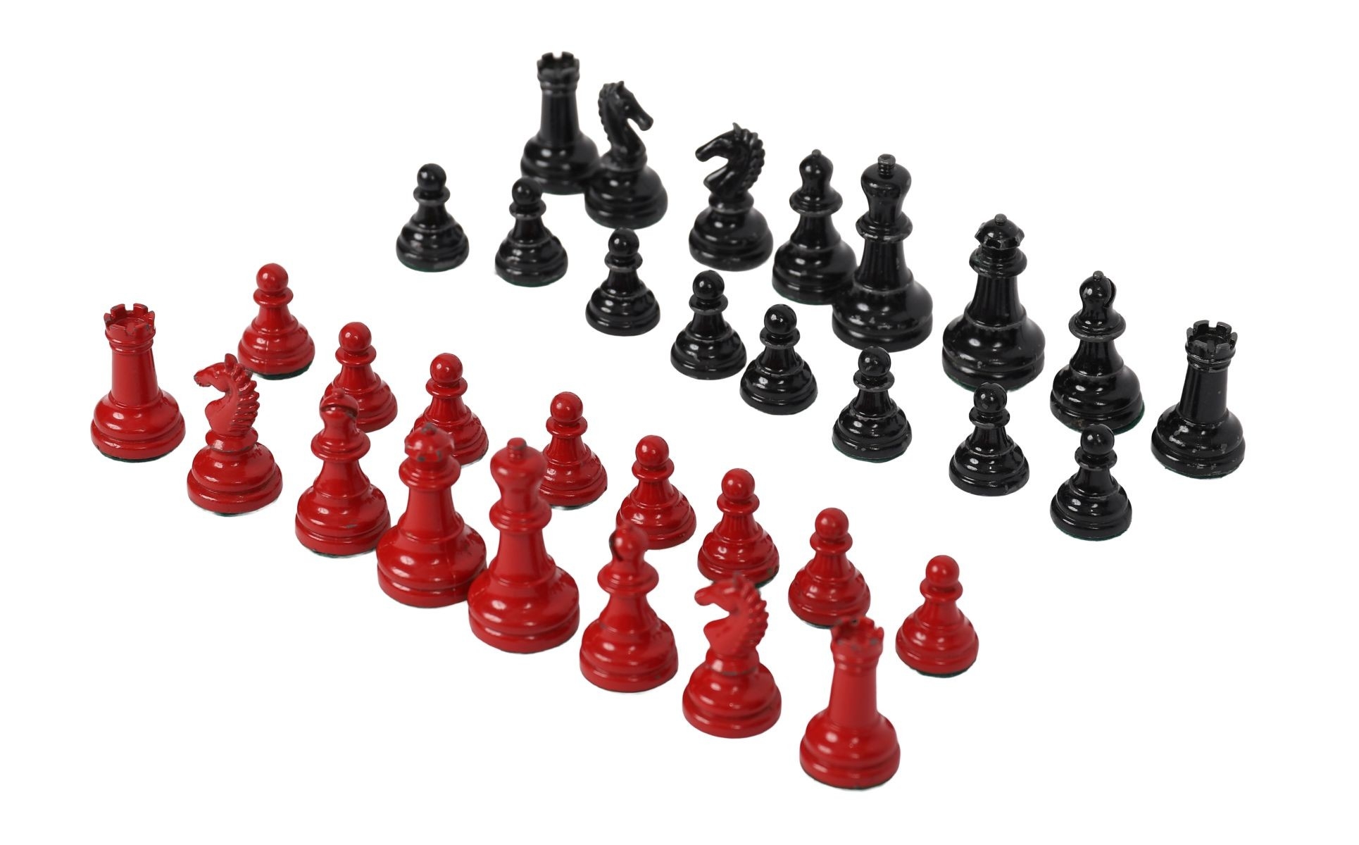 Mid-20th century boxed chess set containing red and black playing pieces in original presentation case.