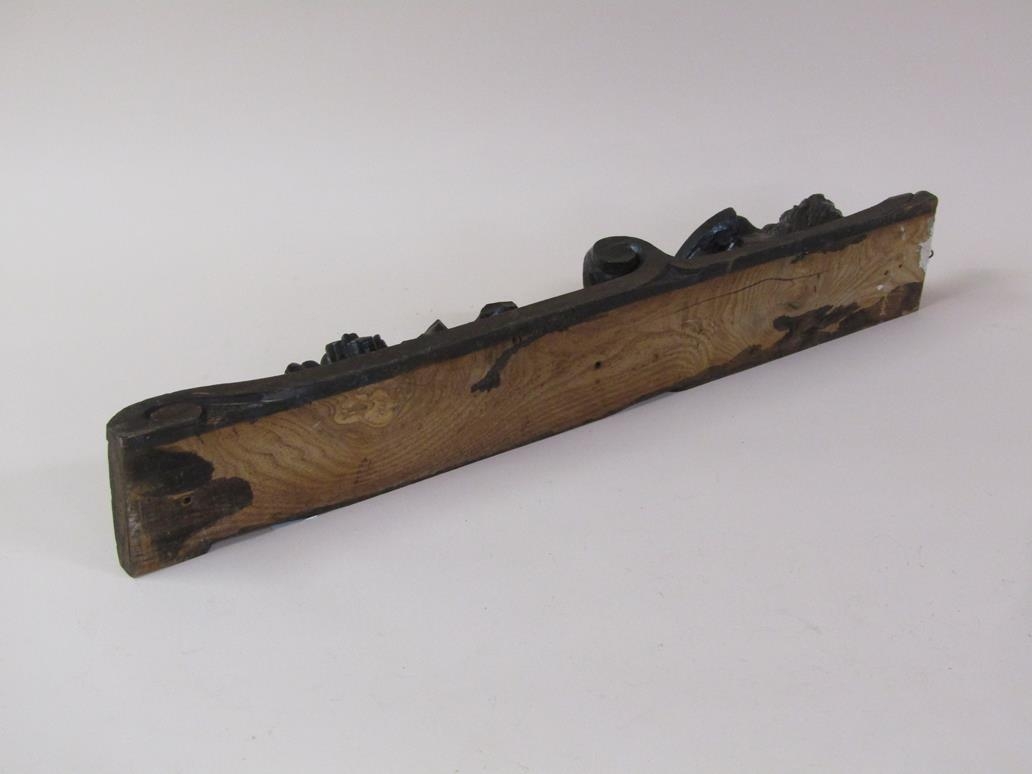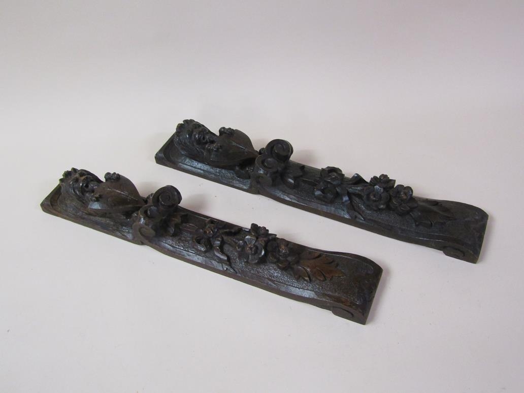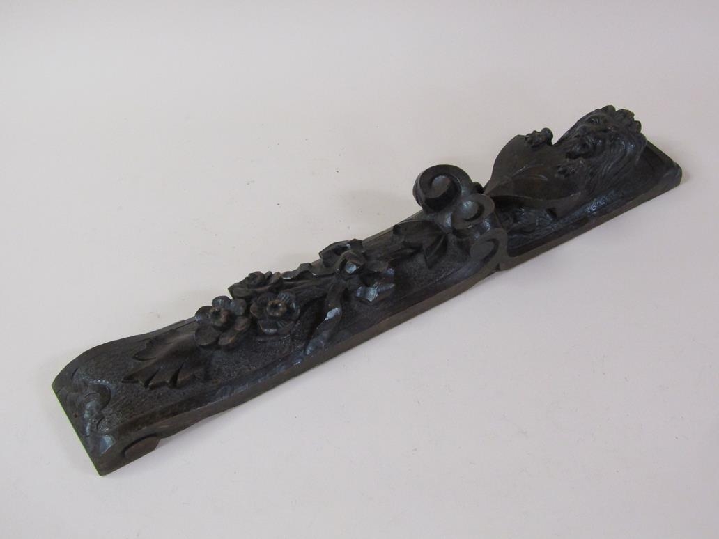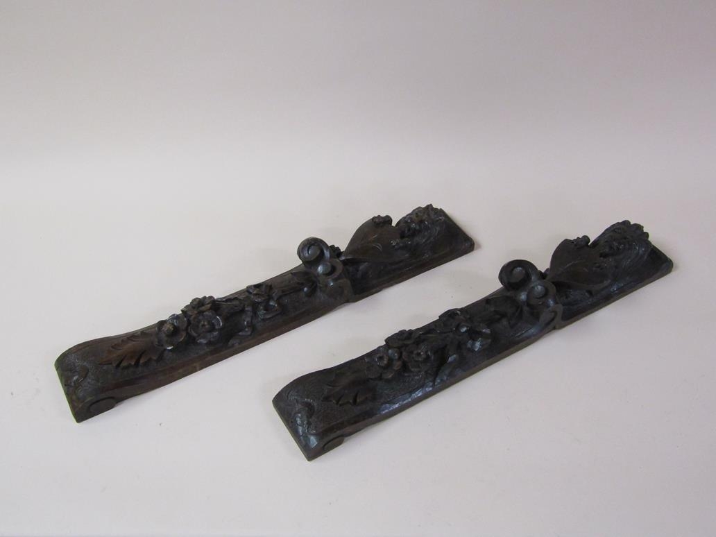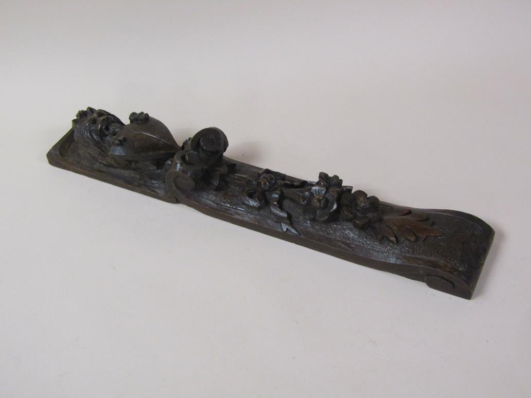 A pair of 19c oak furniture mounts carved with lion and shield, over suspended bow and flowers, each 66cm l.