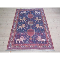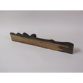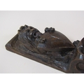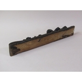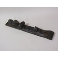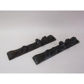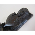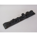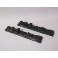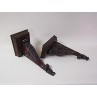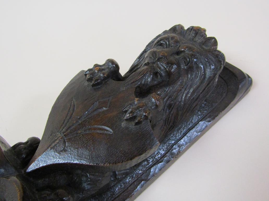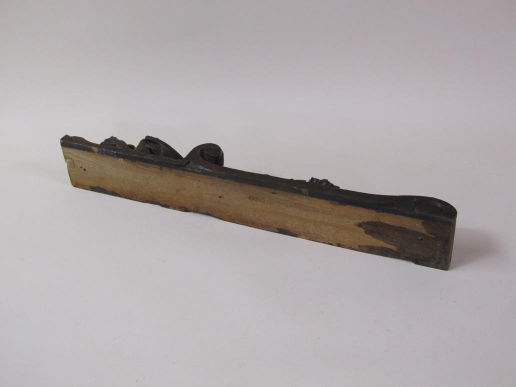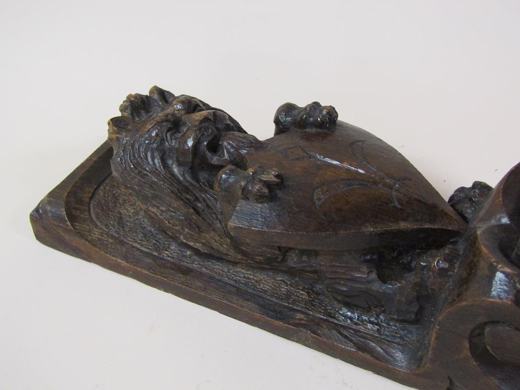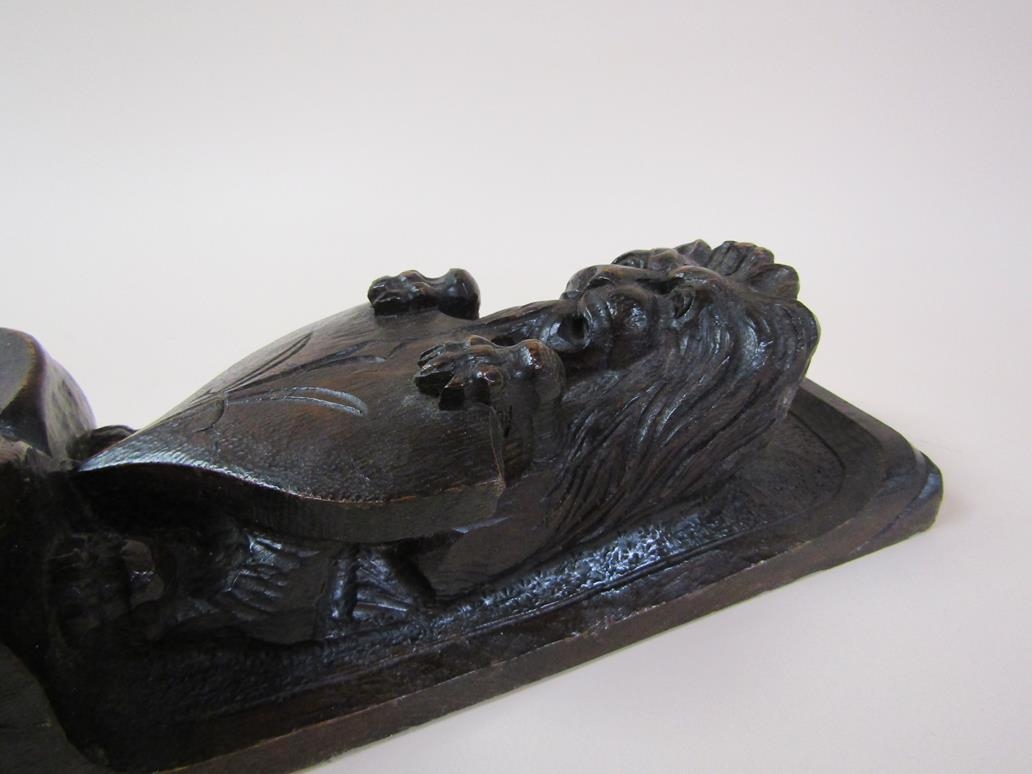 A pair of 19c oak furniture mounts carved with lion and shield, over suspended bow and flowers, each 66cm l.