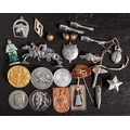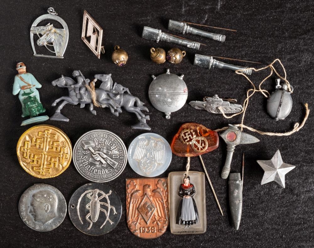A small group of WWII German lapel pins: comprising three stick grenade pins, a Kriegsmarine mine stick pin (missing pin) and others (a lot)