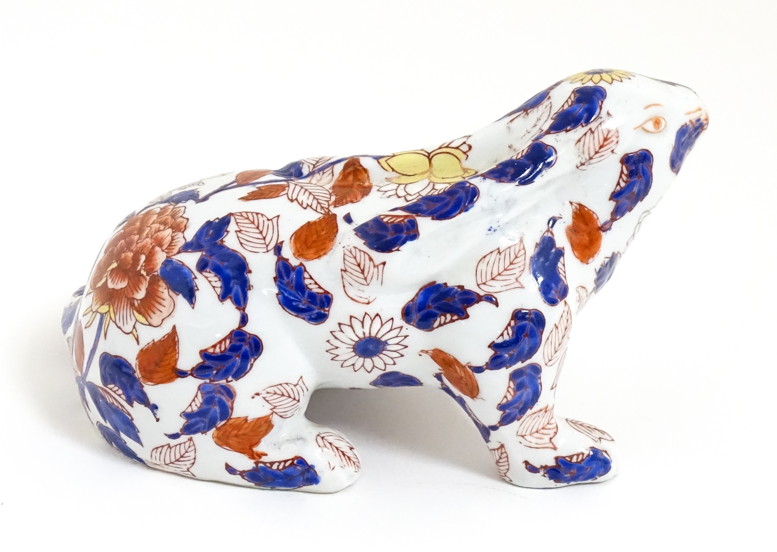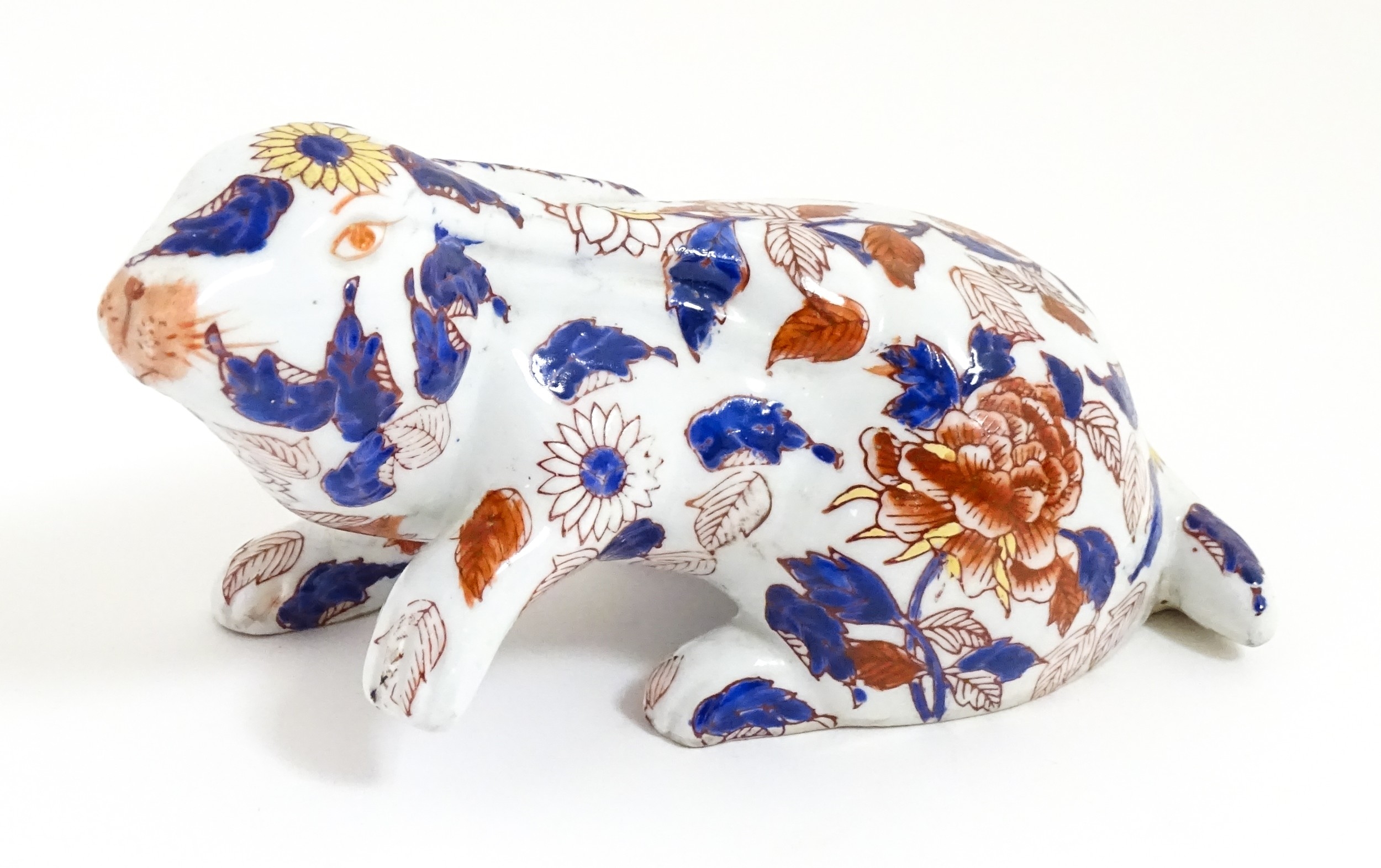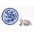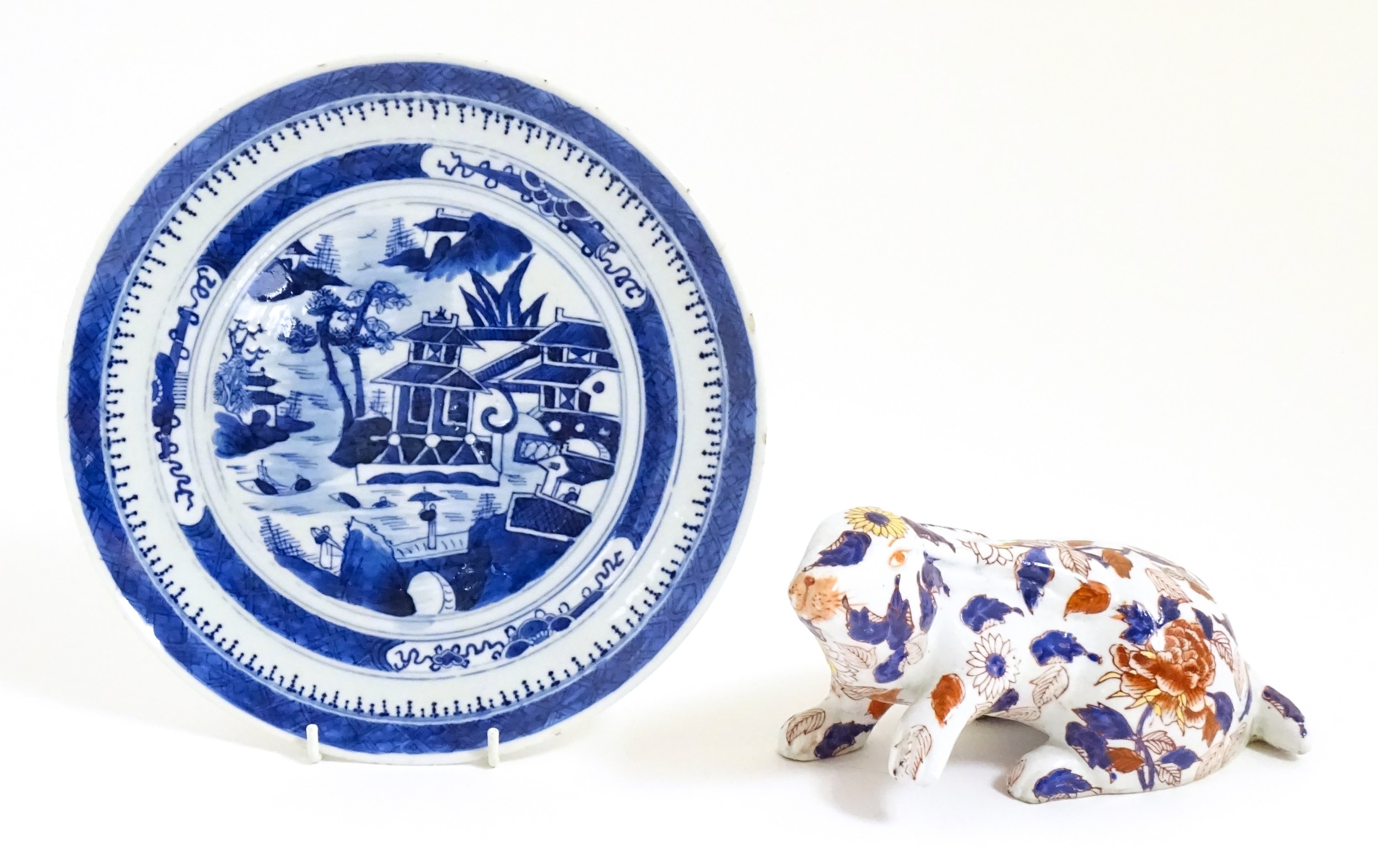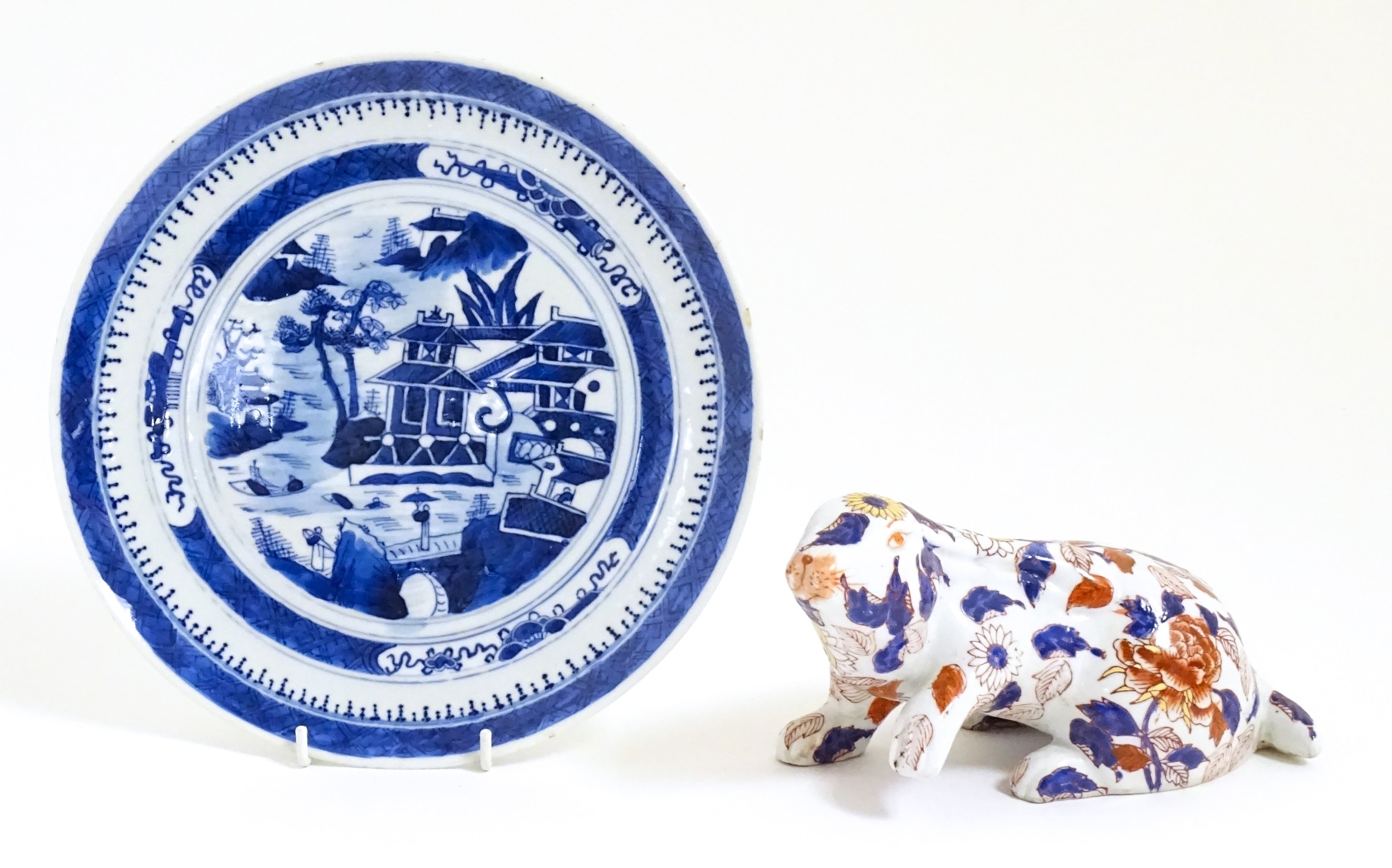 A Chinese export blue and white plate decorated with a river landscape with figures, pagodas, etc. Together with an Oriental model of a rabbit decorated in the Imari palette. Plate approx. 9 1/2" wide (2)