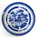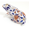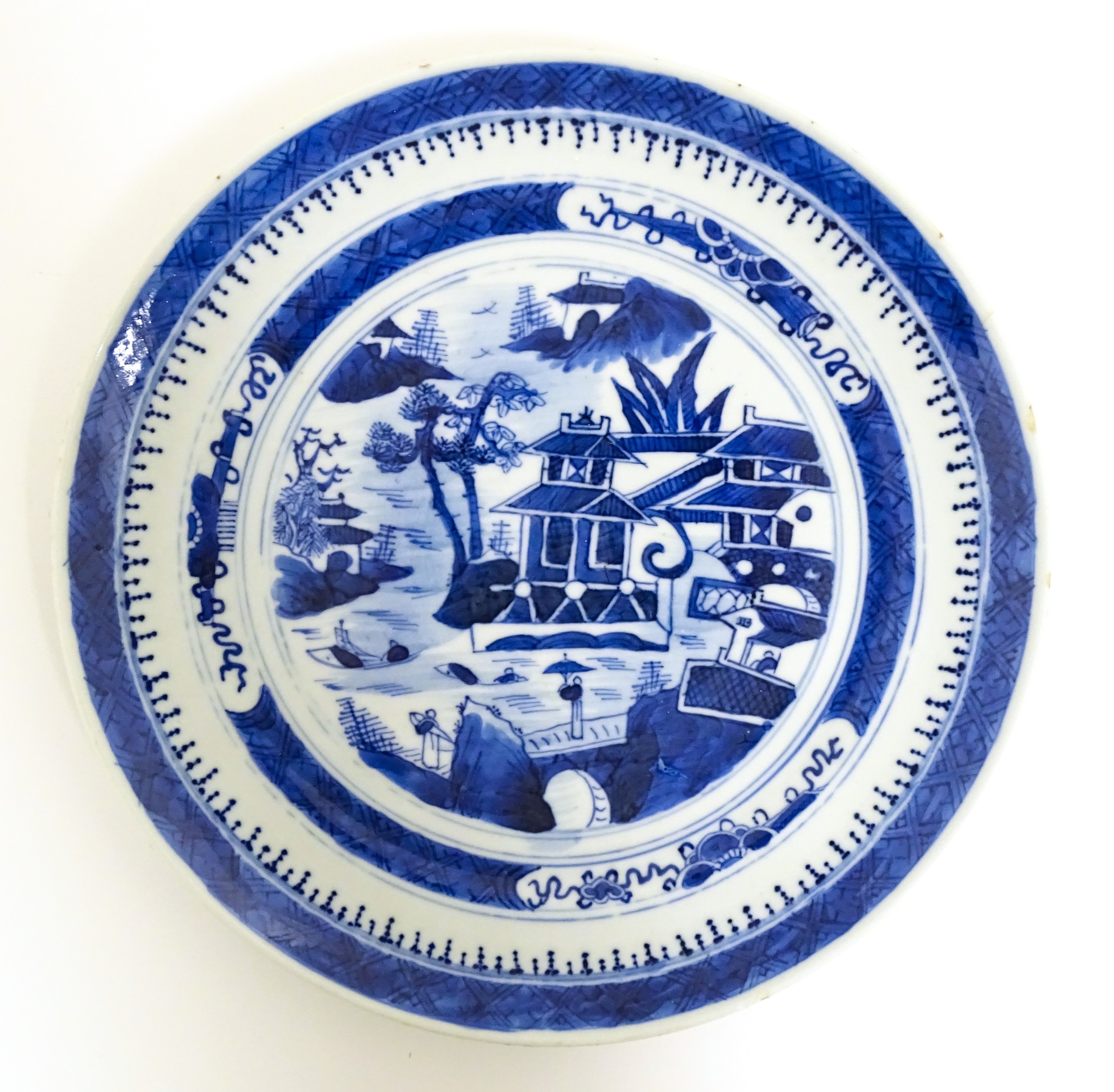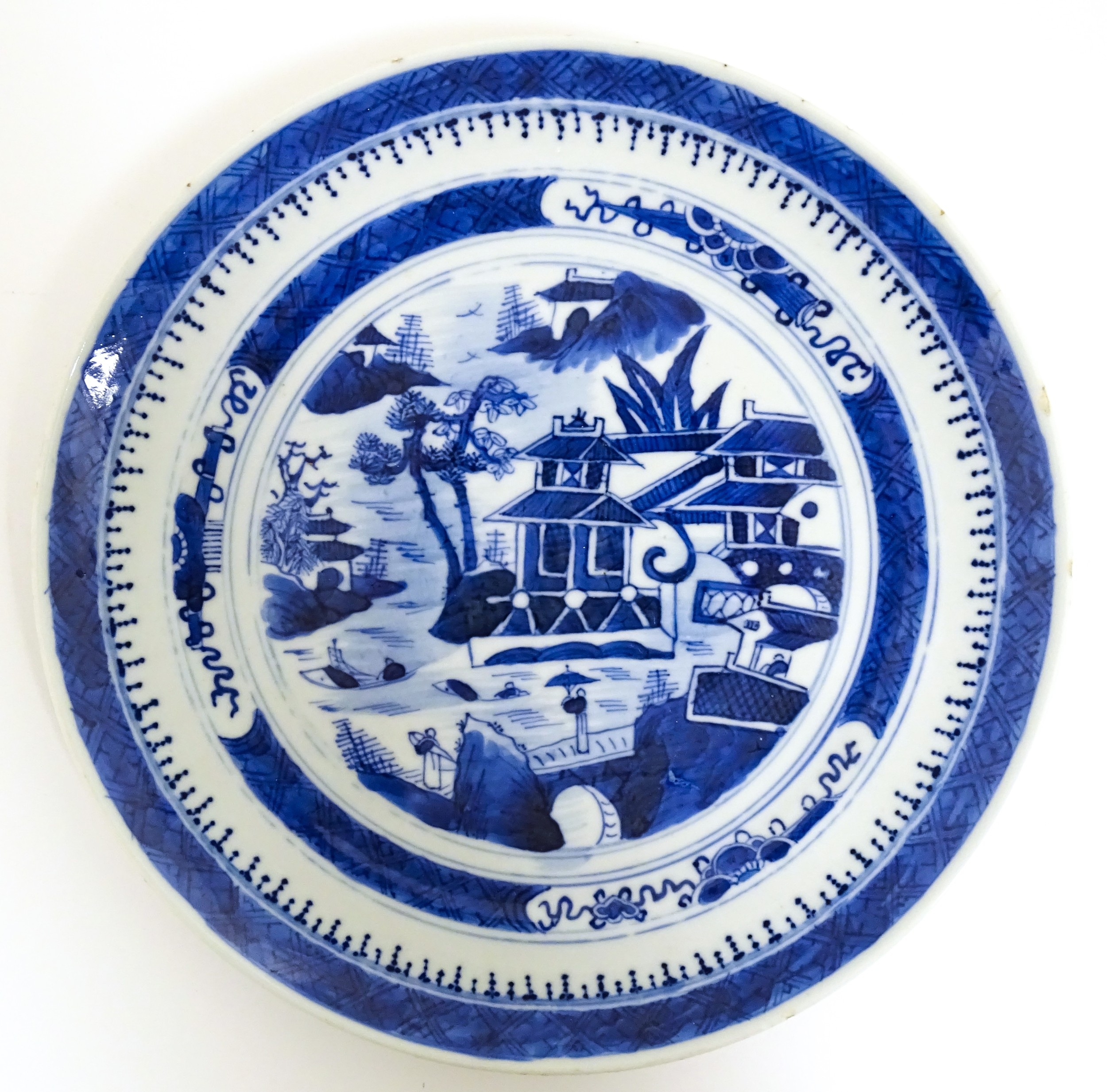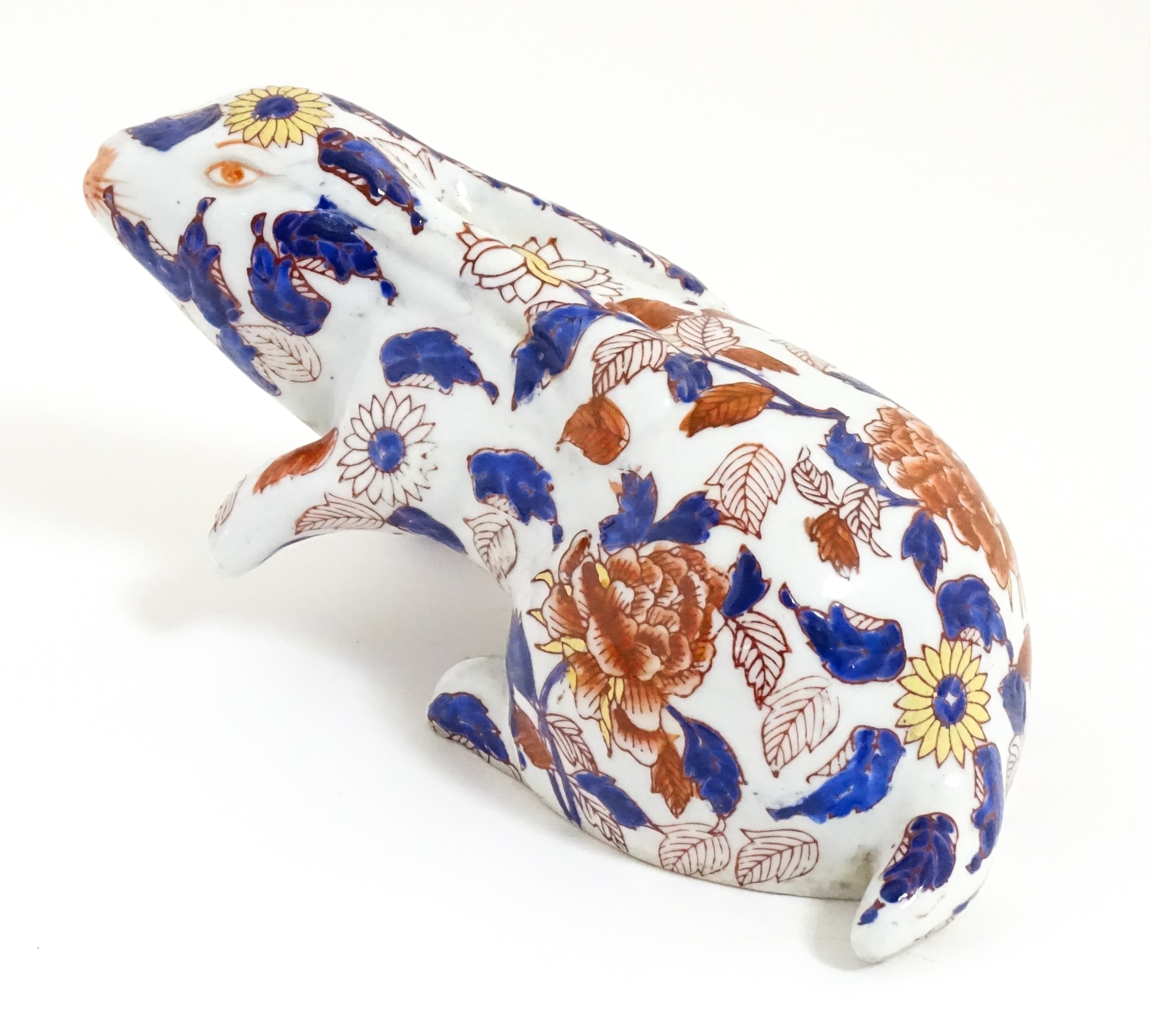 A Chinese export blue and white plate decorated with a river landscape with figures, pagodas, etc. Together with an Oriental model of a rabbit decorated in the Imari palette. Plate approx. 9 1/2" wide (2)