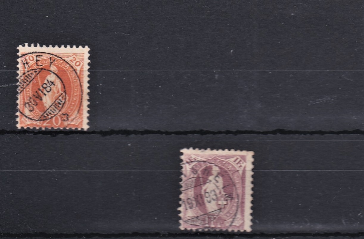 Switzerland 1882 SG 134 used 20c and 1891-1898 11 1/2 x11 perf SG 152c used 1f 'claret'