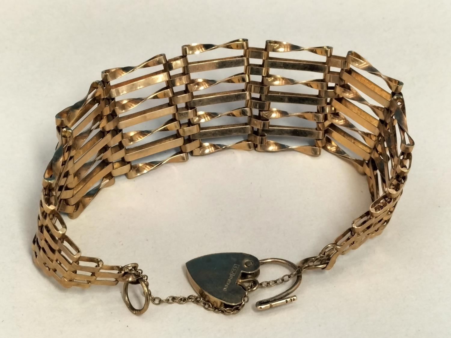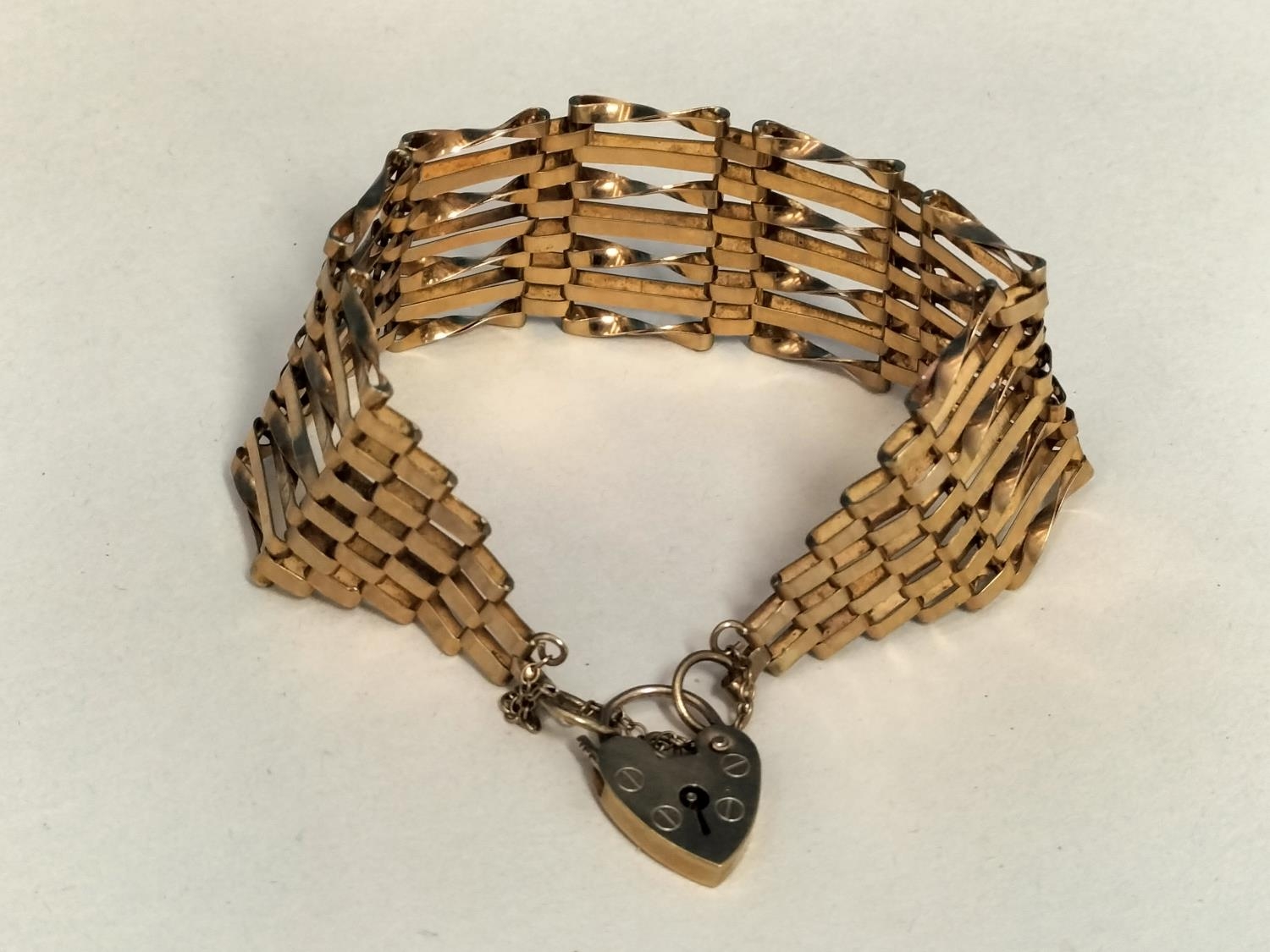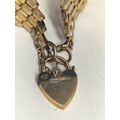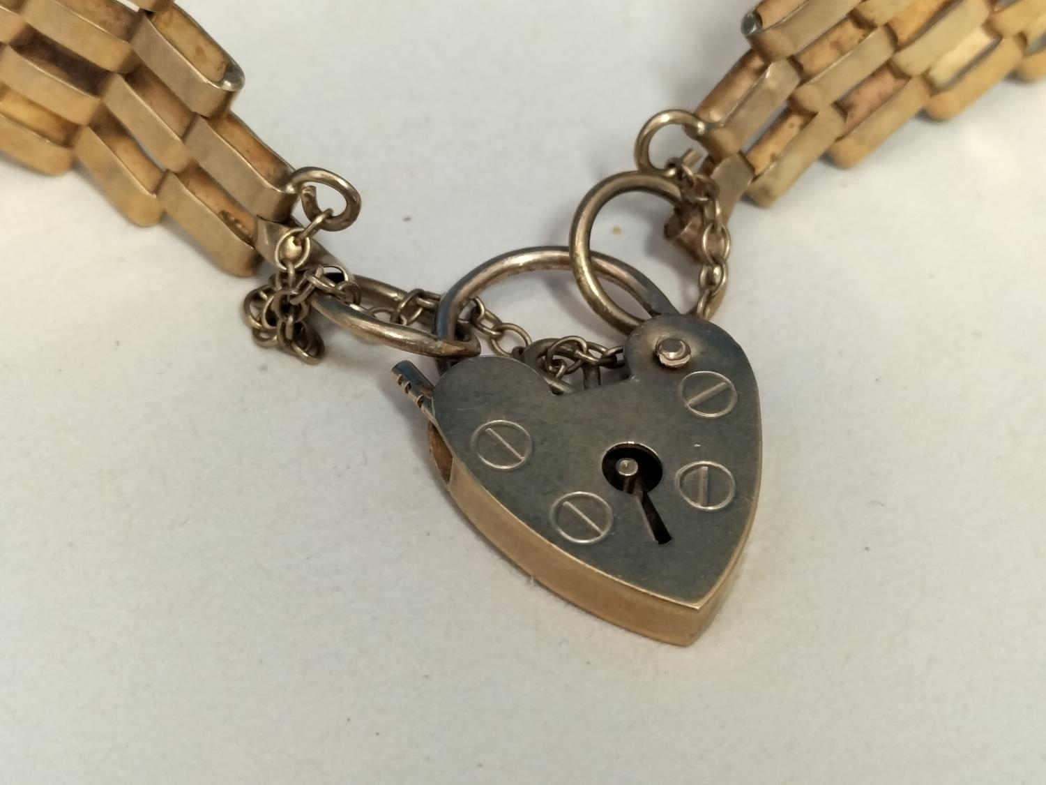 9ct Gold 375 Gate Bracelet (6") with Heart Locket. Weight 13.9 Grams.