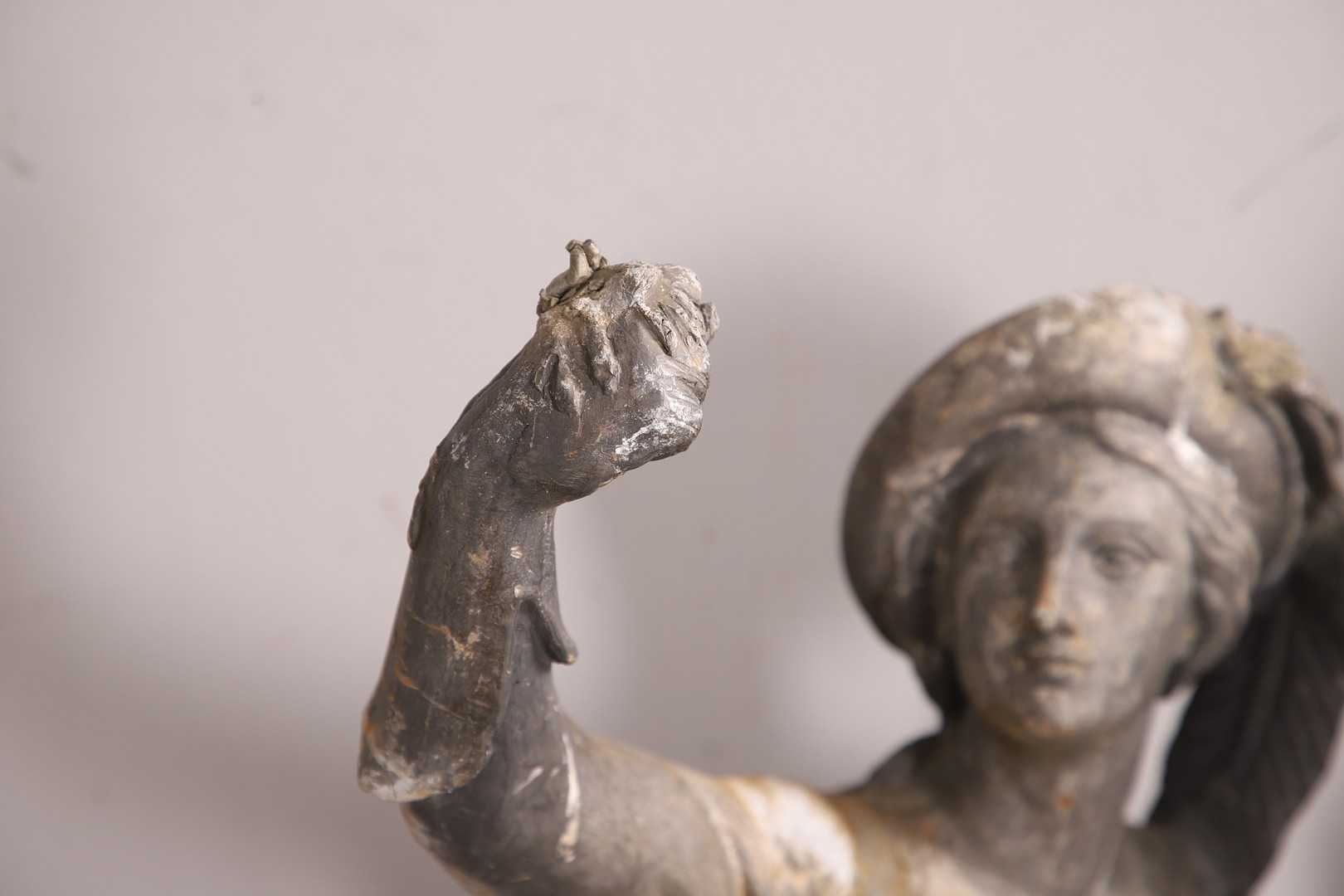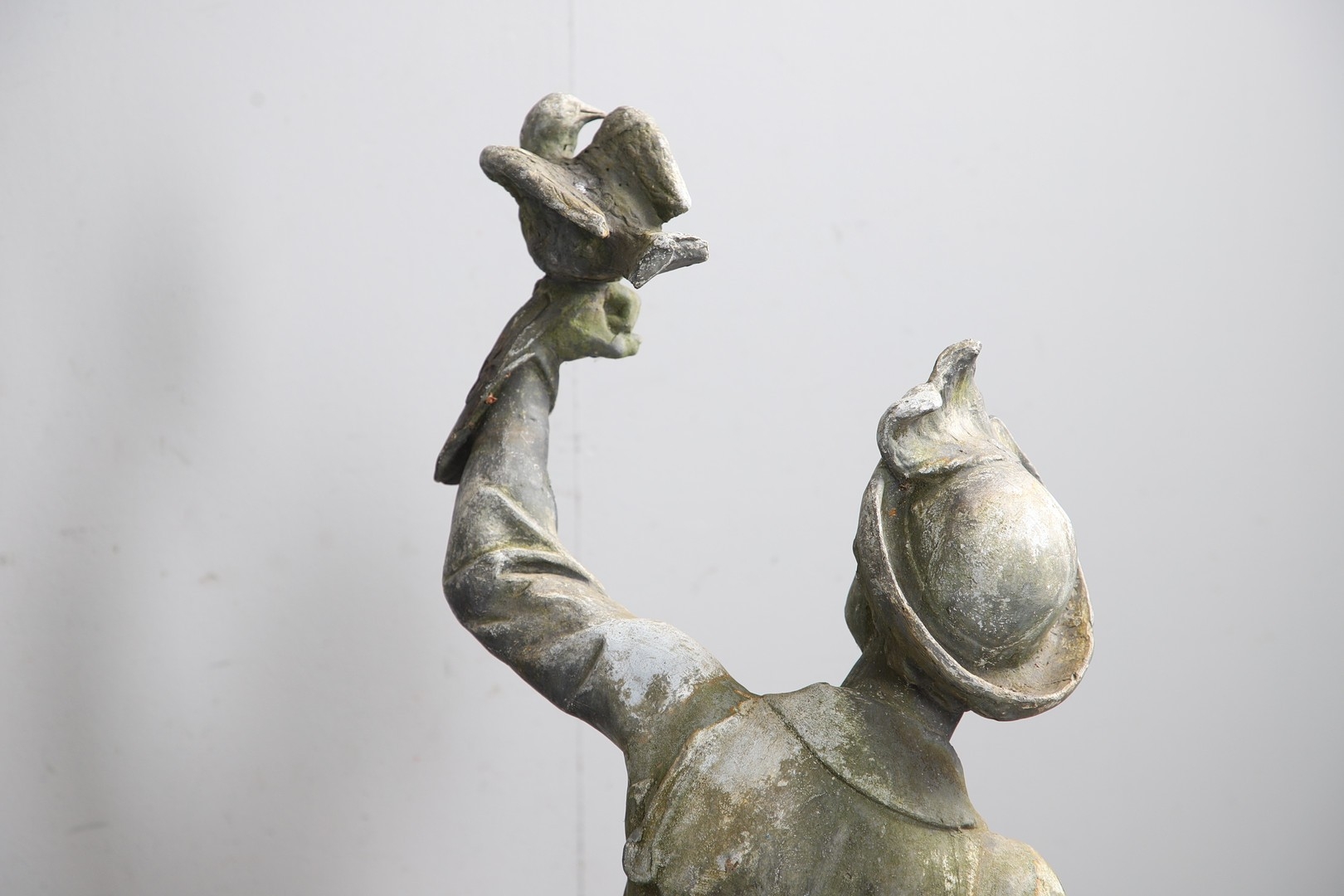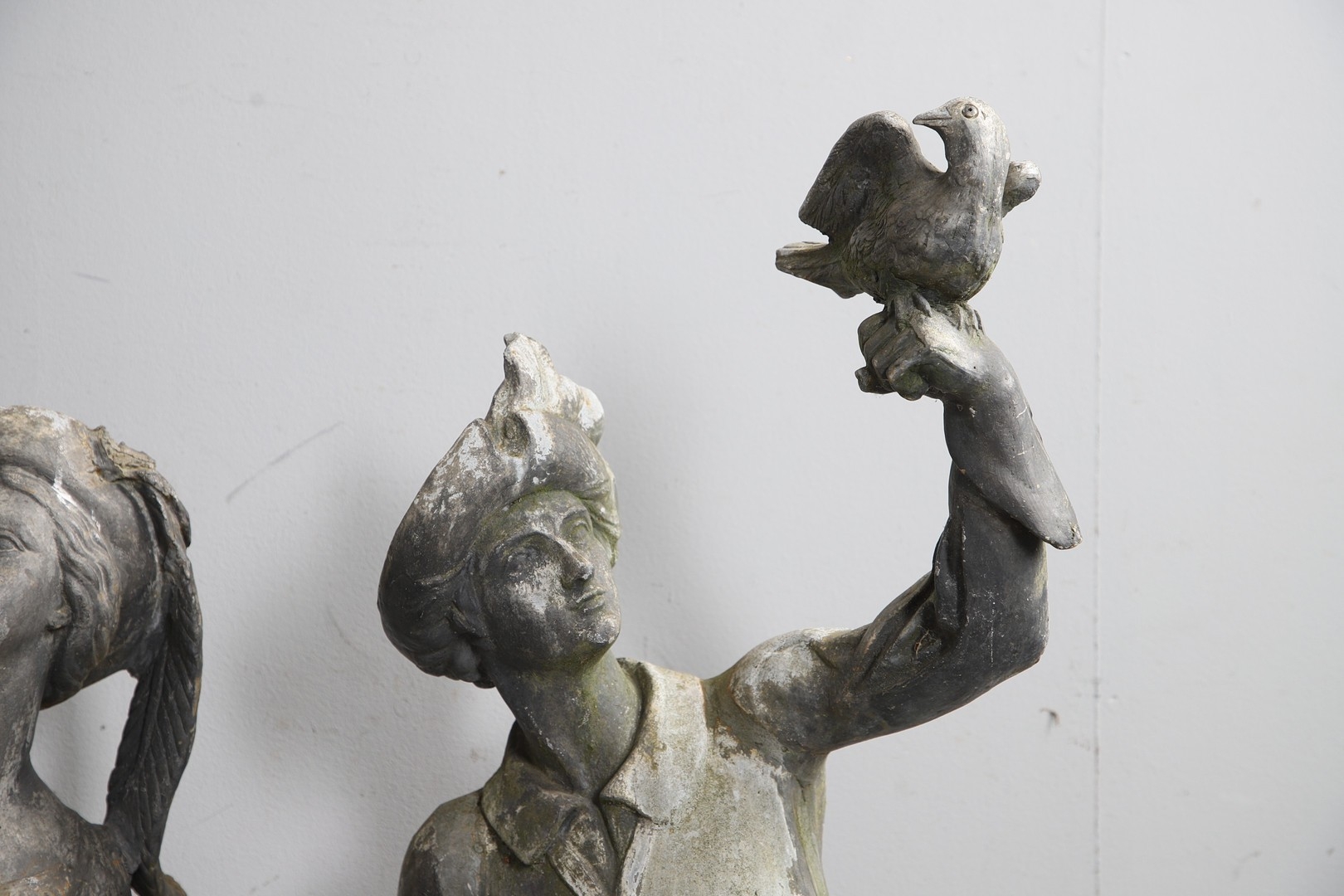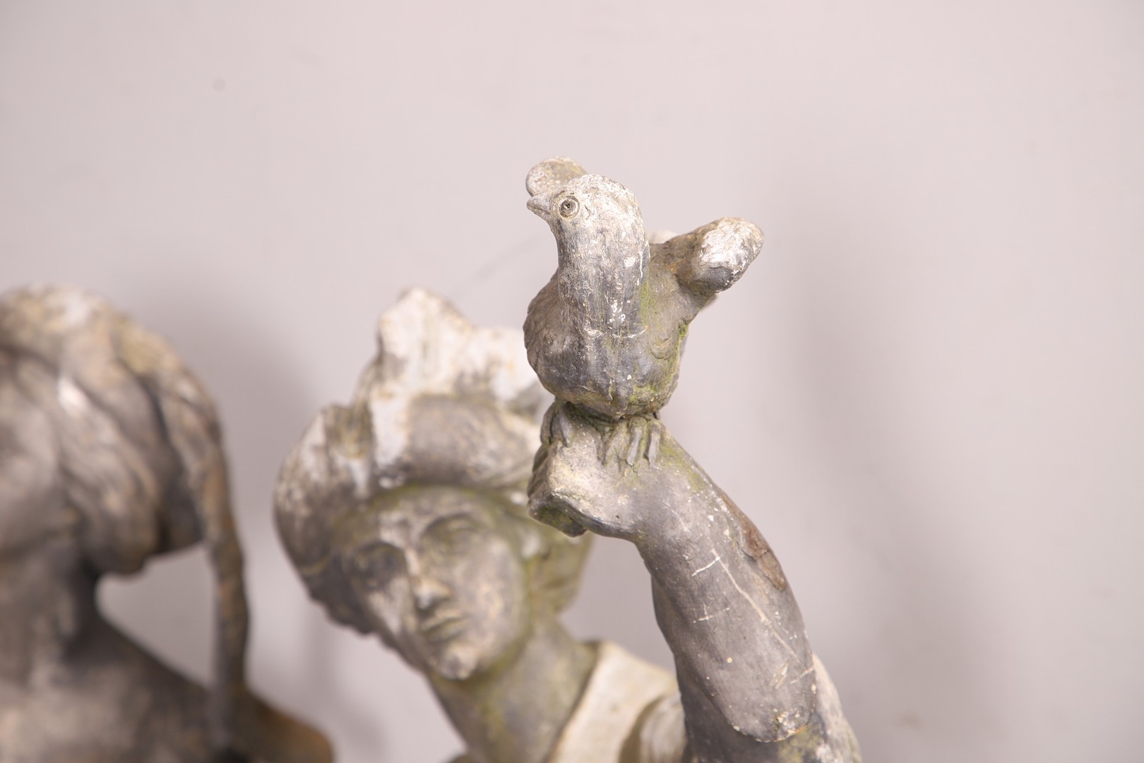 Lady - bird missing, large split to base, section of feather from cap missing. Repairs to arms.