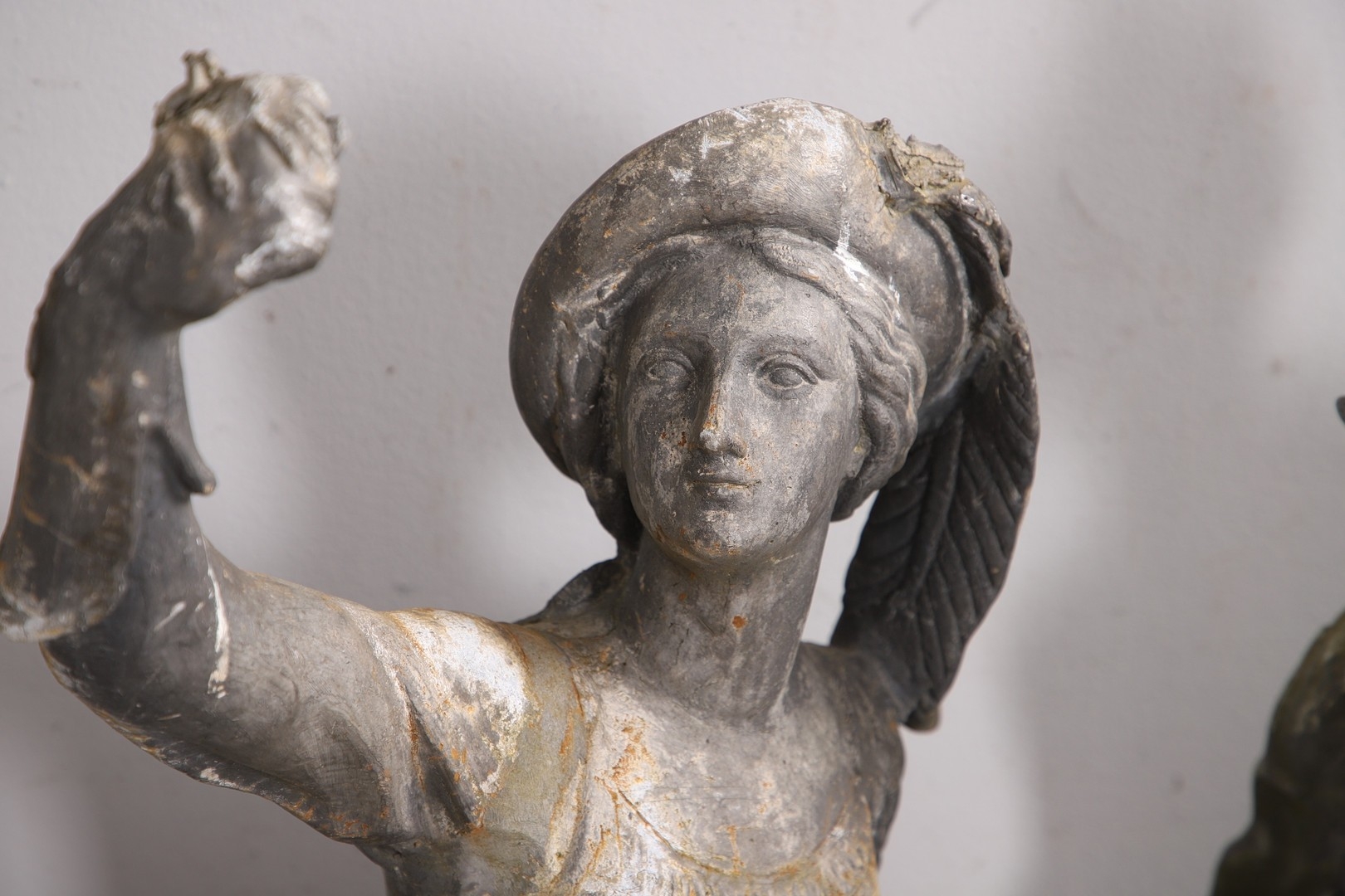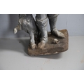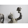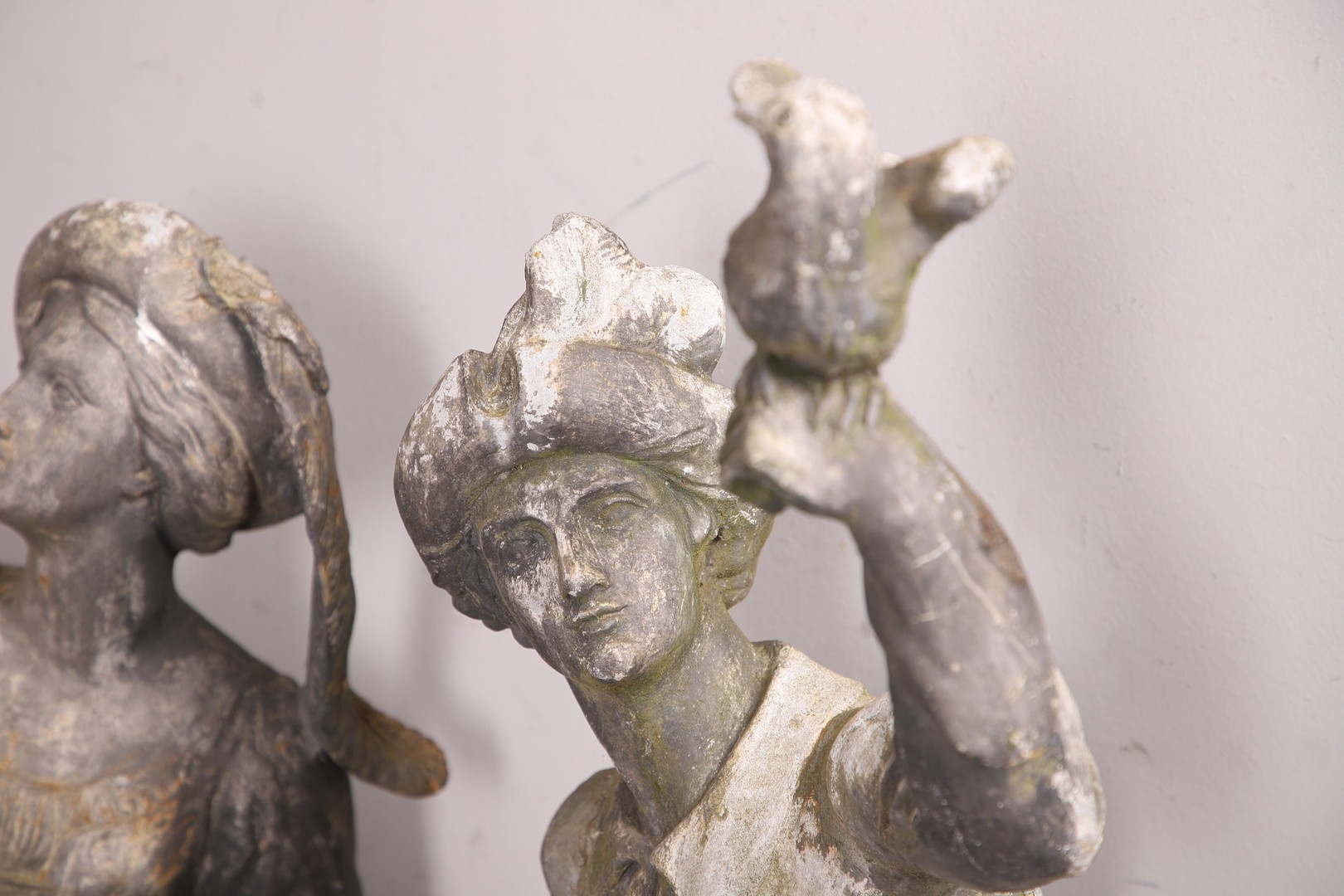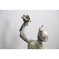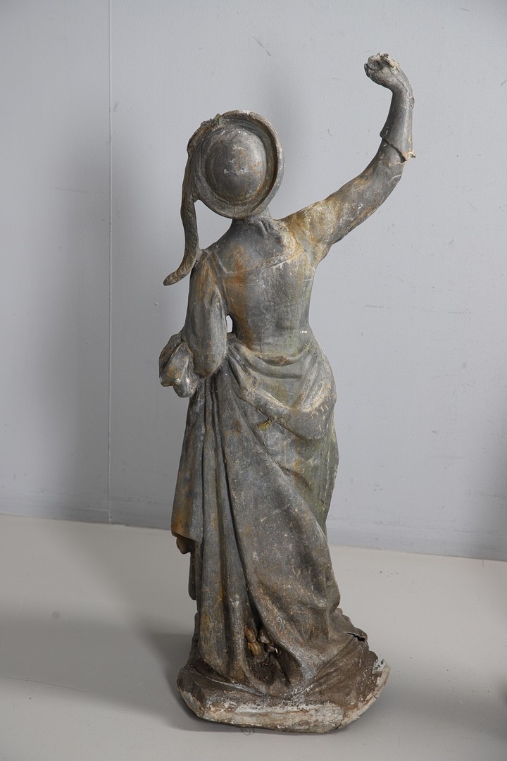 Lady - bird missing, large split to base, section of feather from cap missing. Repairs to arms.