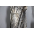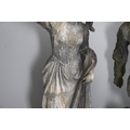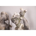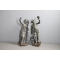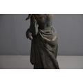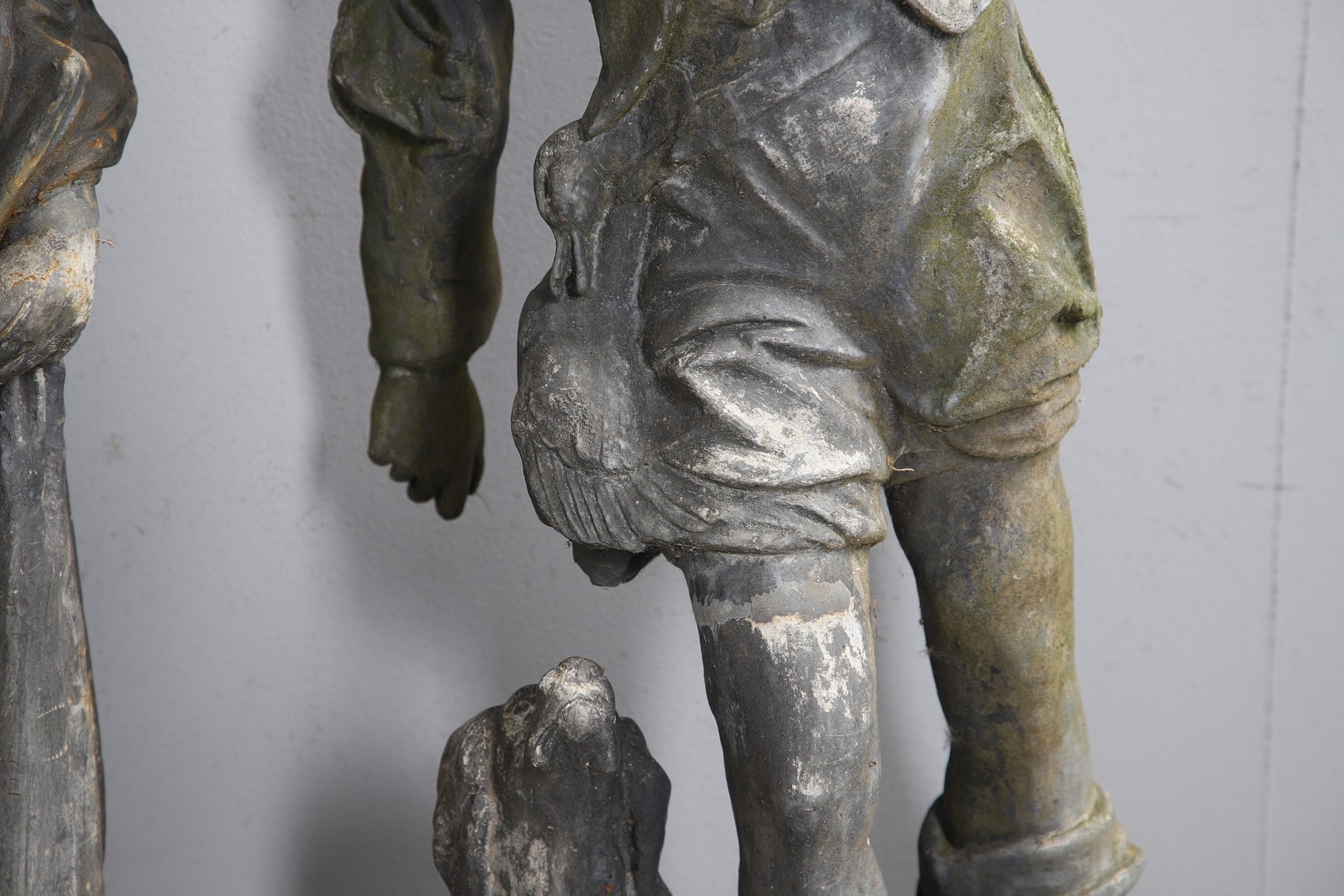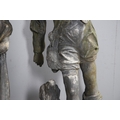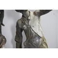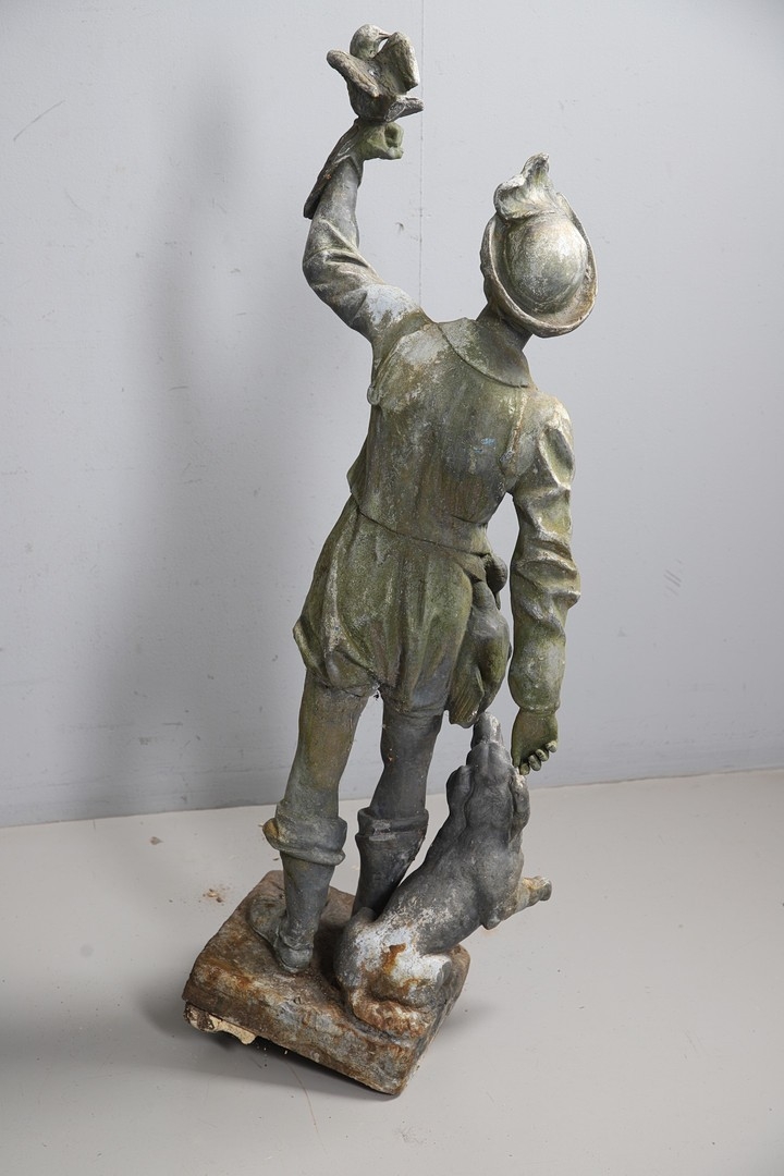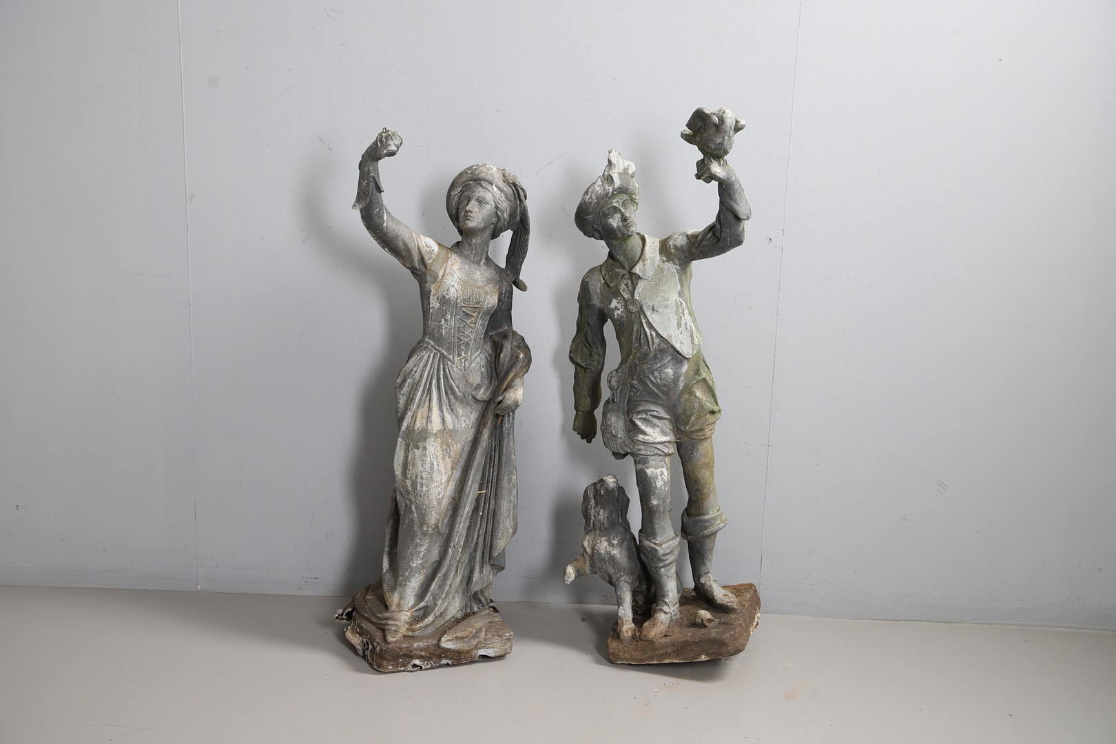 A PAIR OF 19TH CENTURY LEAD GARDEN FIGURAL STATUES. possibly Lowlands, modelled as a Lady in her Medieval style finery, and a Gentleman with outstretched arm holding a bird, dead game to his waist and a spaniel at his feet, height 107cm, width 40cm (at widest point).