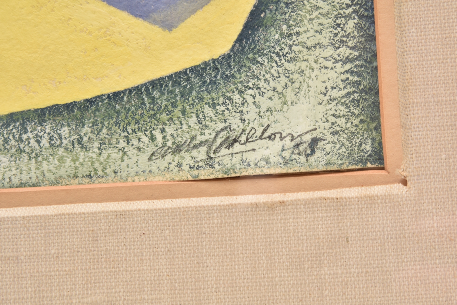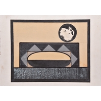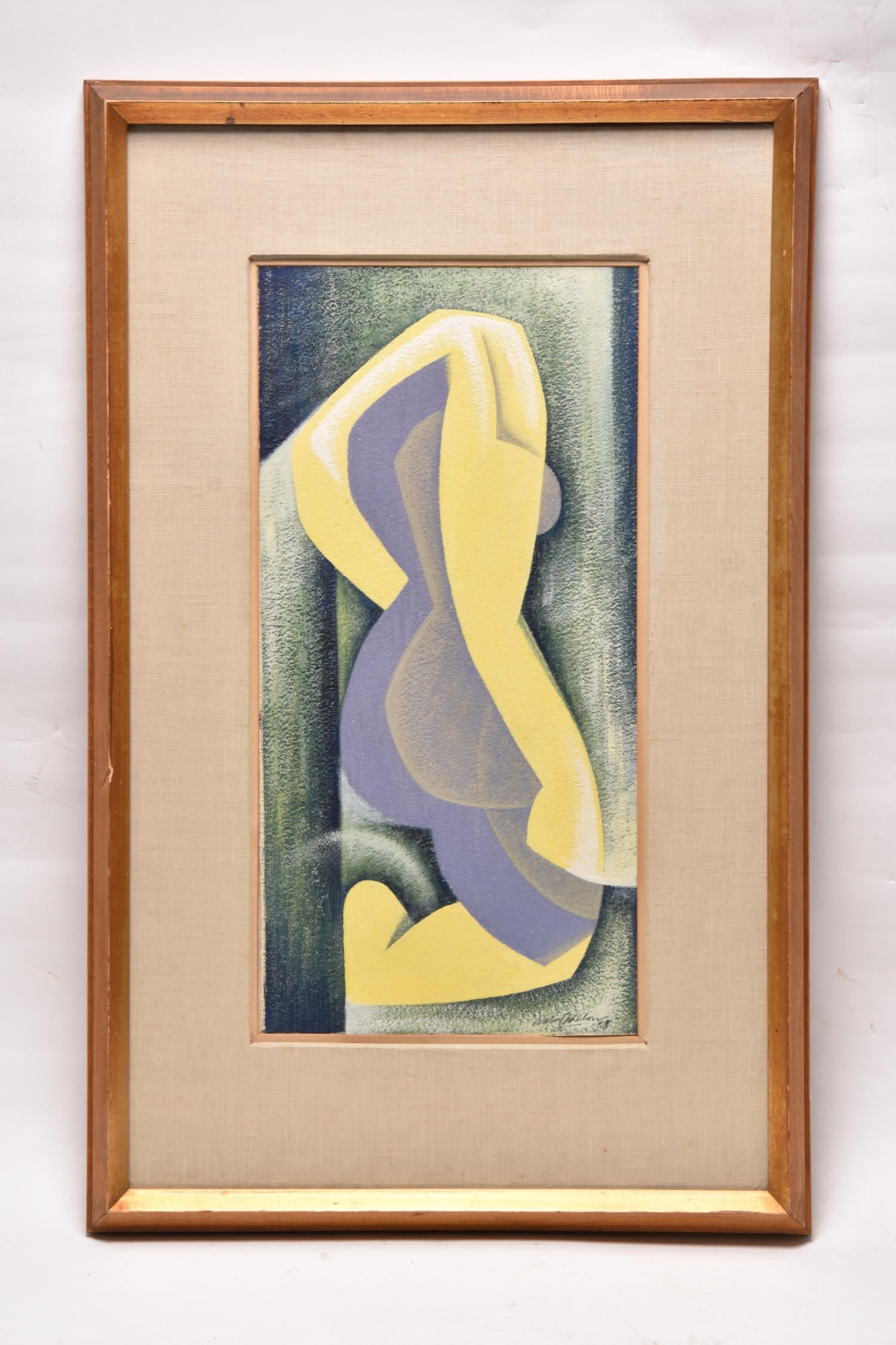 Arthur Cyril Hilton (British 1897-1960) Figure, signed and dated 1955 lower right, oil and gouache on paper, 41.5 x 20.5cm, frame 62.5 x 39.5cm, glazed Provenance: The Artist, thence by descent Arthur Cyril Hilton (1897-1960). Hilton was born and lived in the Manchester area and turned to art and painting during his convalescence, having been wounded on the Somme during World War One. His abstract-surrealist style was highly distinctive and he experimented with many mediums, including his elegant hand-carved sculptures in teak, mahogany and sycamore wood. Arthur Cyril Hilton was well-known in the Manchester art circle having been a member of the Manchester Society of Modern Painters from the 1930s, serving as its chairman during the 1950s. He exhibited regularly including solo shows at the Salford Art Gallery, Crane Kalman Gallery and exhibitions at the Manchester City Art Gallery.