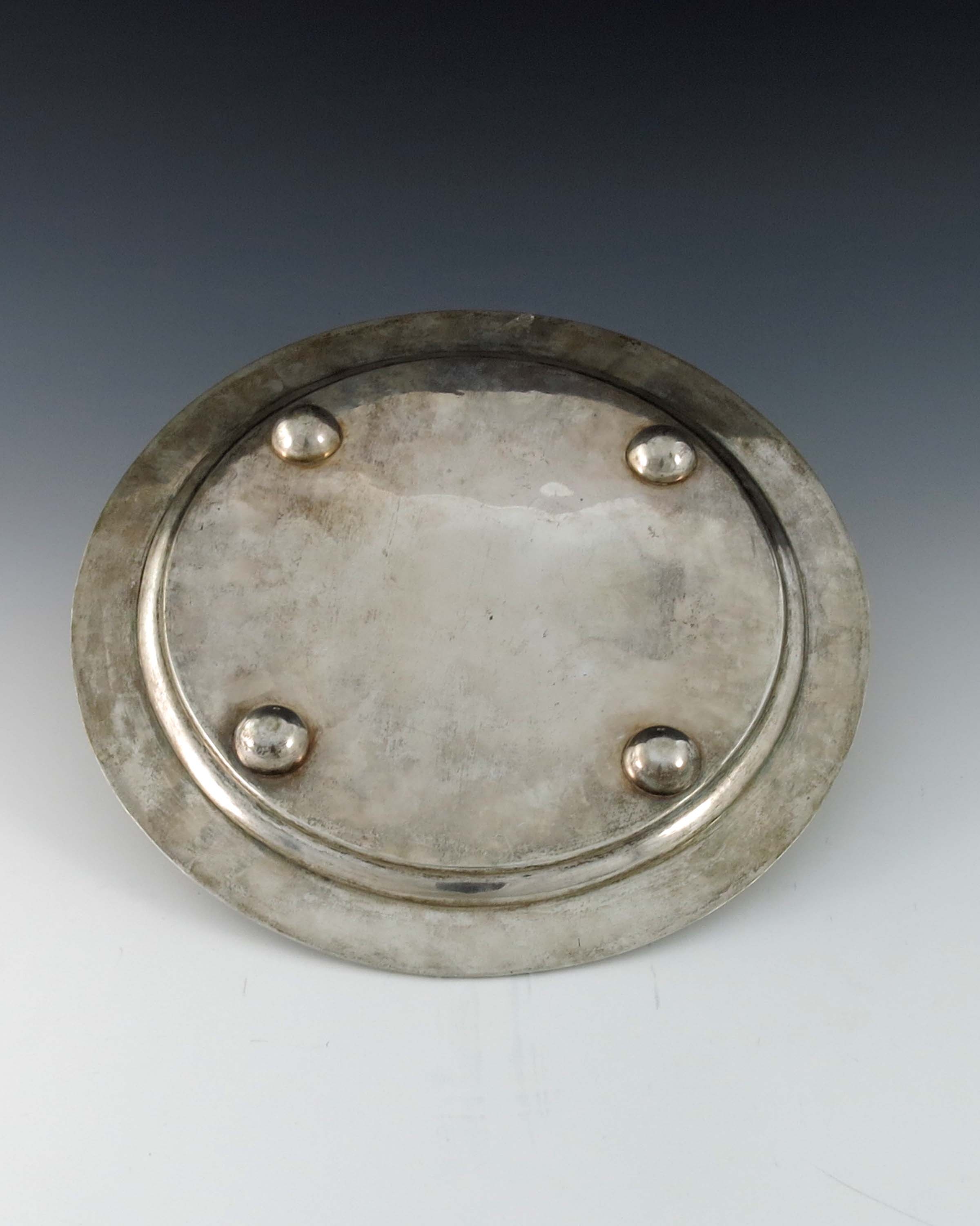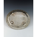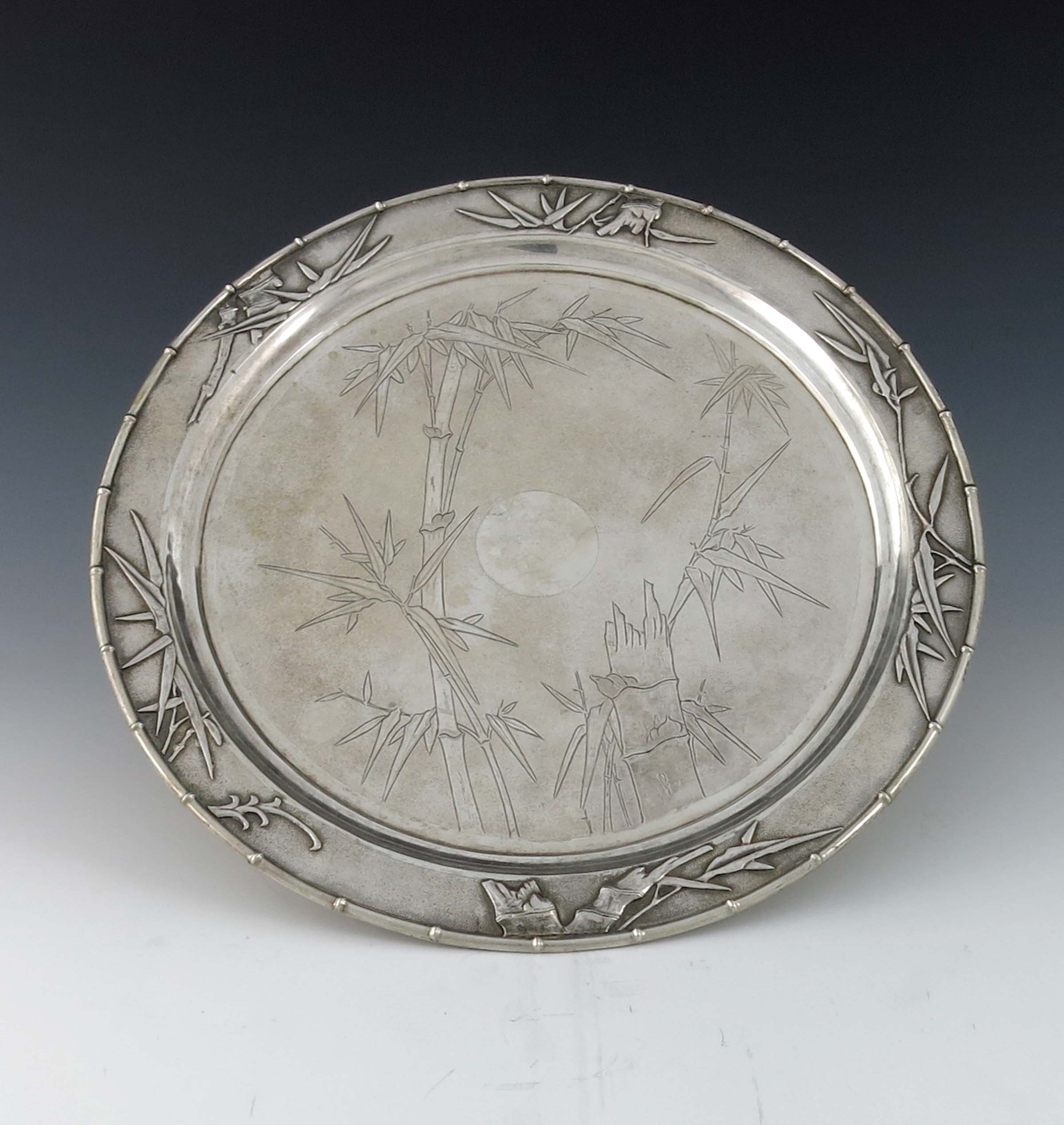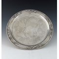 A Chinese export silver tray, Zeewo, Shanghai circa 1900, circular form, planished and relief moulded with bamboo rim and border of bamboo shoots, the centre engraved with further foliage and stumps, on four hemispherical feet, 34cm diameter, 30.58ozt