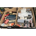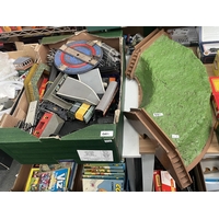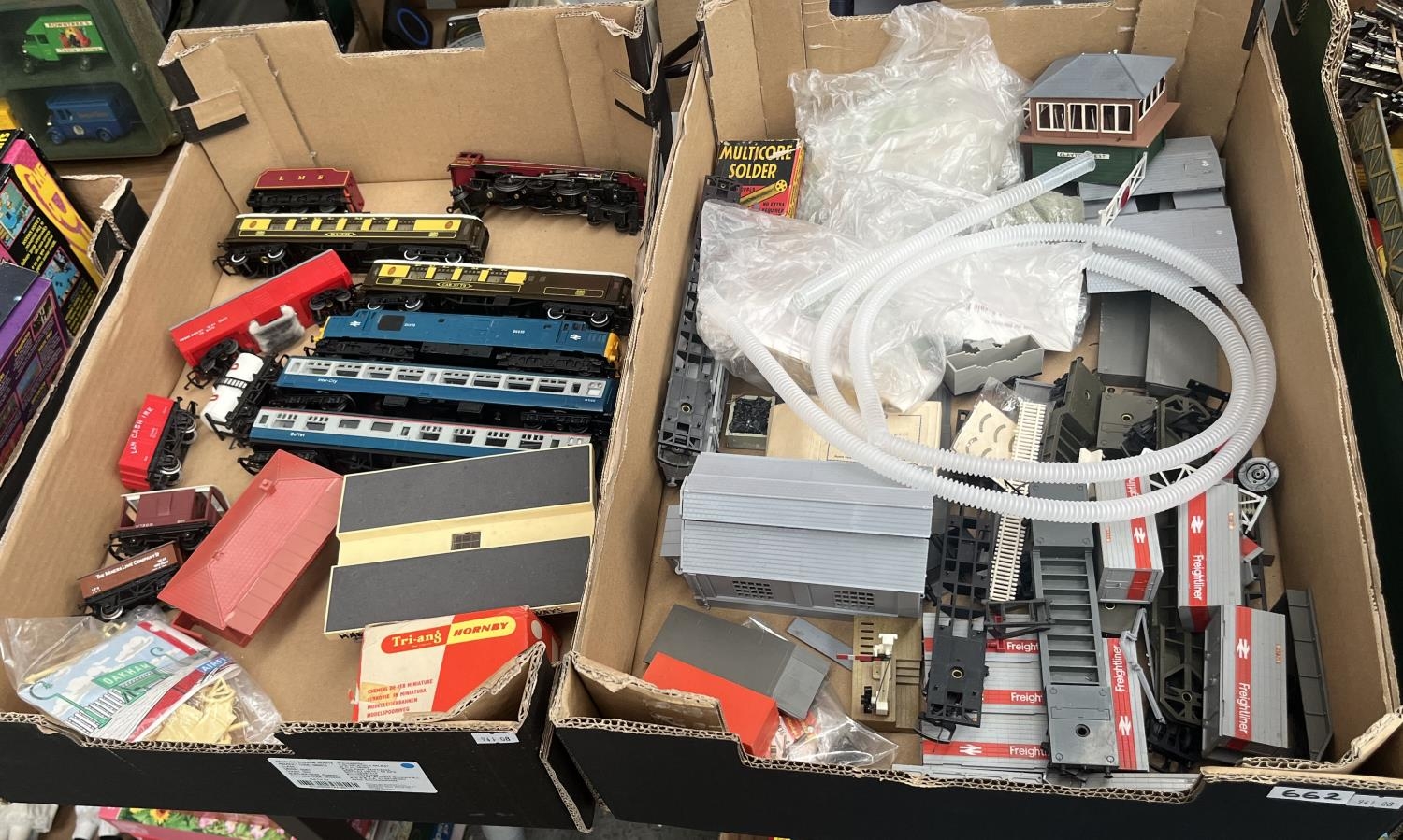 2 Boxes containing 00 gauge accessories, buildings and rolling stock etc