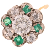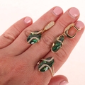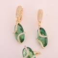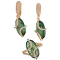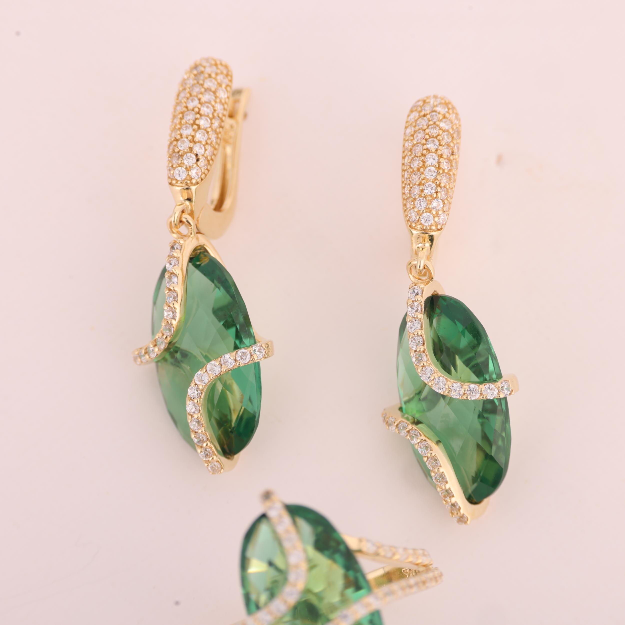 A 14ct gold green quartz and cubic zirconia ring and earring set, maker FF, ring setting height 20.8mm, size M, earrings 37.8mm, 12.6g total (2)